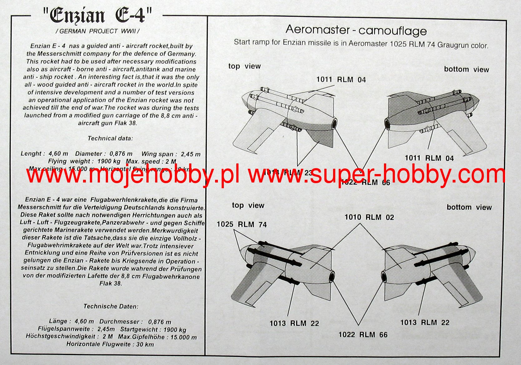 Enzian немецкий прототип зенитной ракеты класса земля-воздух времен Второй мировой войны. Ракета Enzian имела дальность около 25-30 километров и была способна нести боеголовку массой до 300 килограммов. Первые работы по ракете Энзиан начались на заводе Мессершмитт еще в 1942 г., но значительно ускорились в 1943 г., когда для ракет этого типа стали использовать фюзеляж Ме163 Комет. В первых вариантах ракеты (от Е-1 до Е-3) в качестве привода использовался двигатель Вальтера, который в двух других вариантах (Е-4 и Е-5) был заменен на более обычный. Ракета должна была быть максимально эффективной, что подразумевало использование радиоволнового наведения. Интенсивные испытания ракеты Enzian проводились в 1944 году, когда было выпущено около 20-30 опытных образцов. Однако из-за организационных проблем и проблем с приводом Enzian не пошел в серийное производство, и его проект был официально закрыт в январе 1945 года.