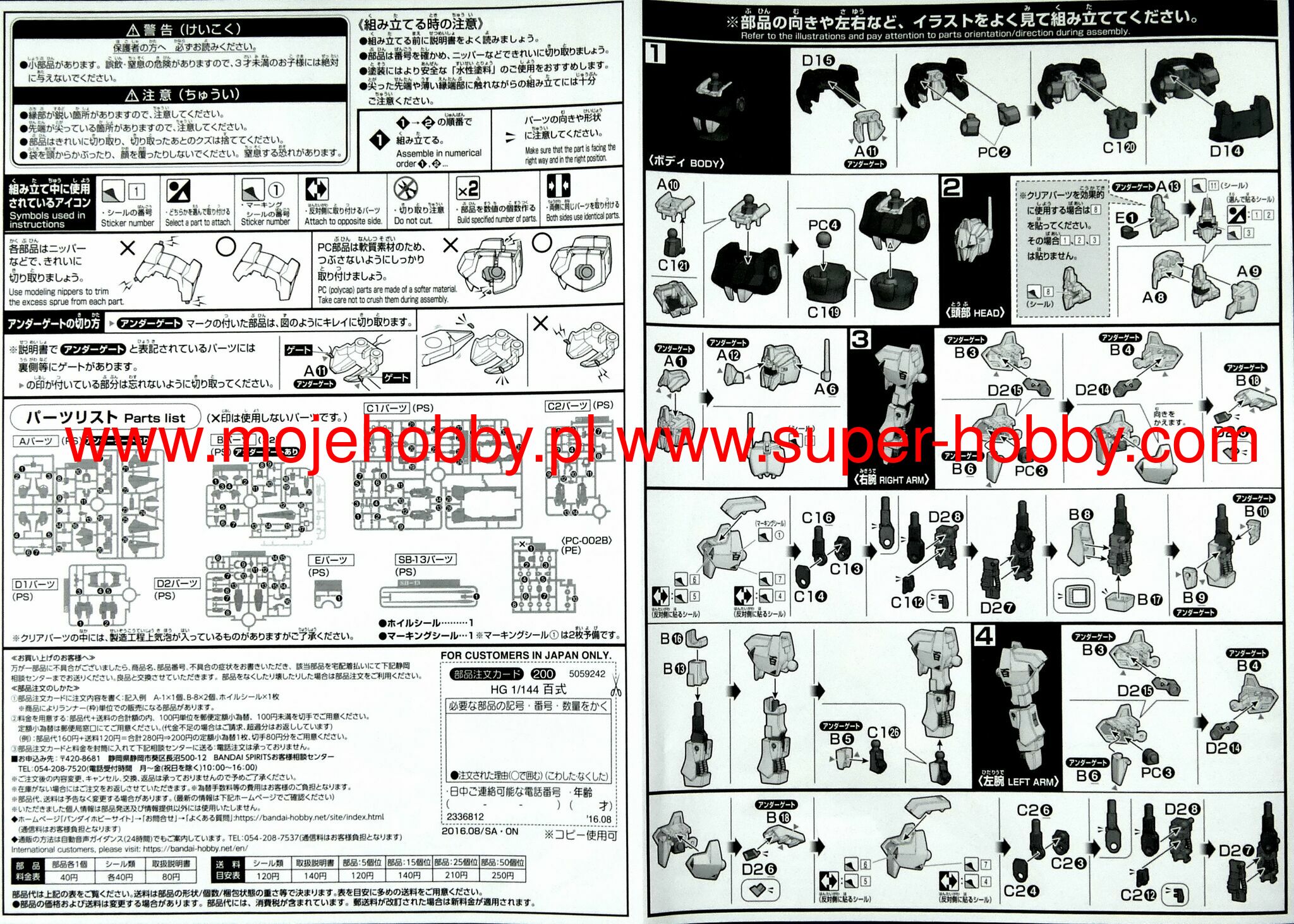 HG - High Grade Models presented in 1990 in 1:144 scale. These were groundbreaking models in the series because their quality was significantly improved compared to previous models and they had a full range of movements. Assembly Difficulty: Medium Number of elements: over 150+ Size: 13cm Contents of the package GUNPLA Model Assembly instructions Short instruction manual in Polish Stand* Stickers to enhance the model *Not all models include a stand Special features of the HG series: Scale 1/144, model size 130 mm, over 150 elements to assemble, medium level.