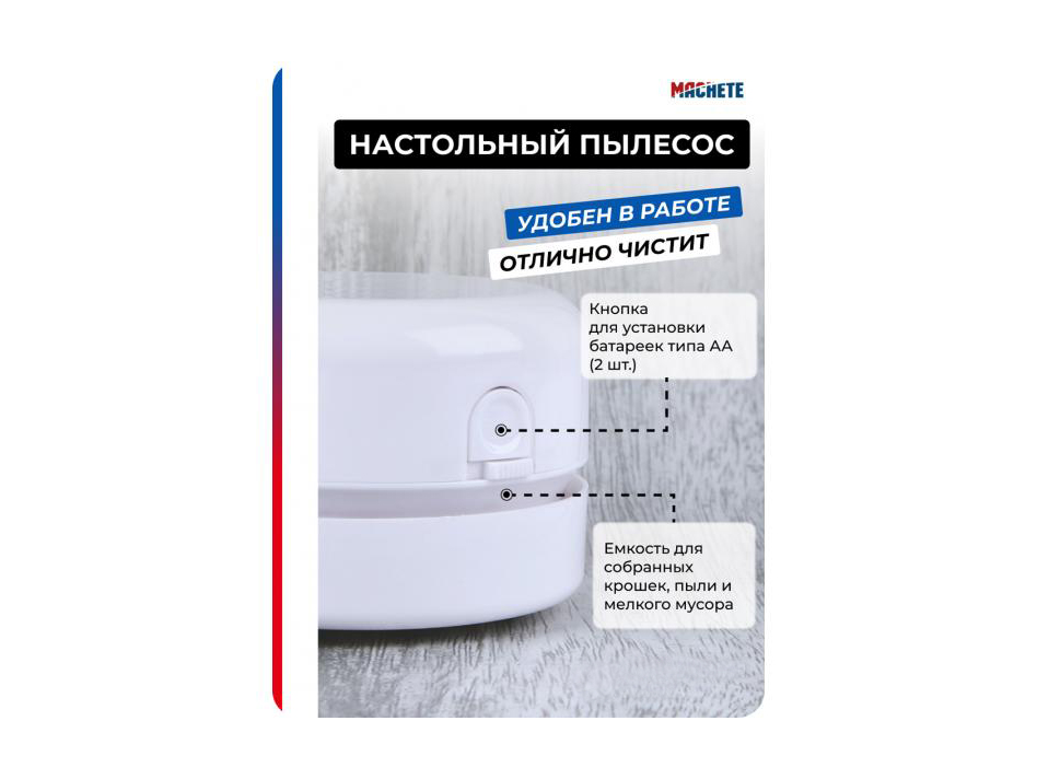 Описание Настольный пылесос. Размер индивидуальной упаковки: 240x70x60 мм. Страна места производства: Китай Материал: Металл, пластик. Вес:300 г.