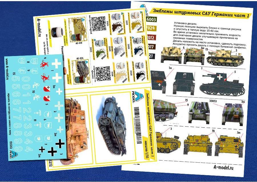 Набор декалей для немецких штурмовых САУ II МВ от производителя A-model для коллекционных и сборных моделей в масштабе 1:35 из пластика, железа и других материалов. Набор предаст вашей модели неповторимую оригинальность. При правильном расположении деталей набора подходит на любую современную модель. Способ применения: Нужный компонент декали вырезать как можно ближе по контуру, на несколько секунд опустить в теплую воду. Поднести к предполагаемому месту нанесения слегка прижав верхний прозрачный слой с рисунком сдвинуть нижний слой подложки, откорректировать декаль на поверхности слегка прижать по углам и неровностям на поверхности модели если такие есть и аккуратно прижать к месту установки бумажной салфеткой. После установки для уменьшения заметности нанесения модель можно покрыть прозрачным акриловым водосодержащим лаком заклеив перед этим все места куда не желательно попадания лака.