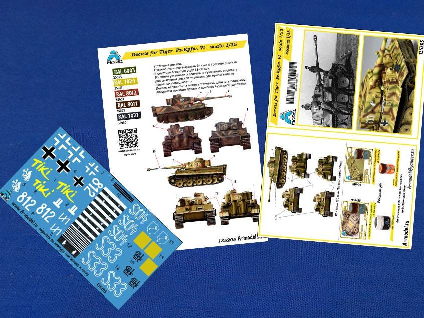 Набор декалей для танка Тигр Pz.Kpfw VI от производителя A-model для коллекционных и сборных моделей в масштабе 1:35 из пластика, железа и других материалов. Набор предаст вашей модели неповторимую оригинальность. При правильном расположении деталей набора подходит на любую современную модель. Способ применения: Нужный компонент декали вырезать как можно ближе по контуру, на несколько секунд опустить в теплую воду. Поднести к предполагаемому месту нанесения слегка прижав верхний прозрачный слой с рисунком сдвинуть нижний слой подложки, откорректировать декаль на поверхности слегка прижать по углам и неровностям на поверхности модели если такие есть и аккуратно прижать к месту установки бумажной салфеткой. После установки для уменьшения заметности нанесения модель можно покрыть прозрачным акриловым водосодержащим лаком заклеив перед этим все места куда не желательно попадания лака.