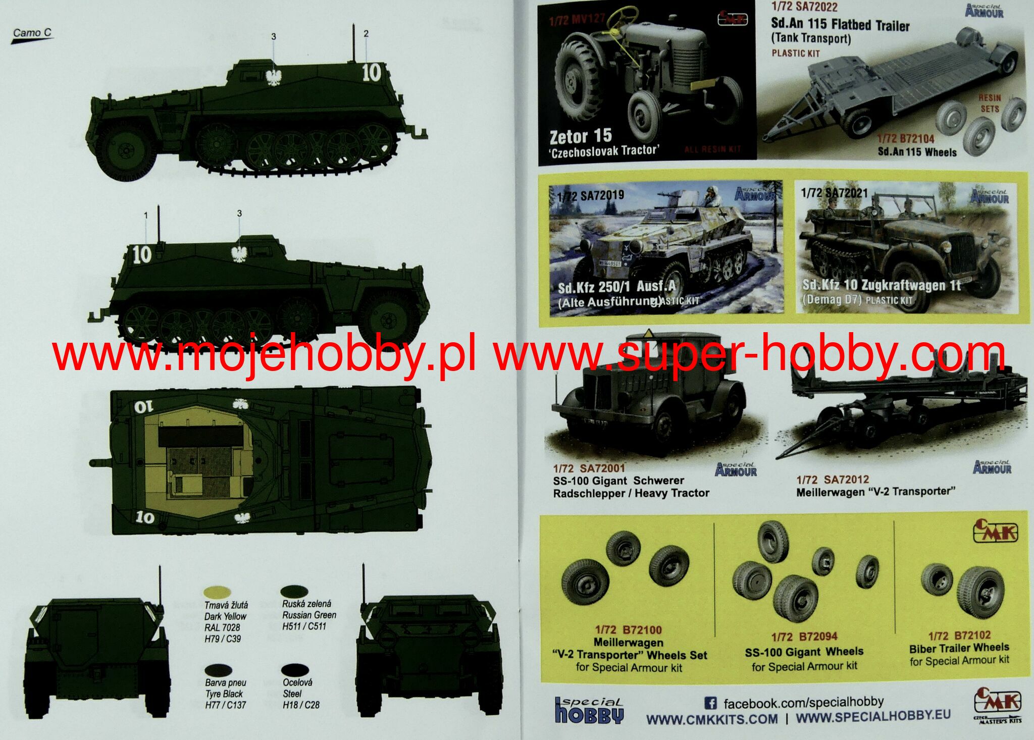 Sd.Kfz 250 was a German light, half-track armored transport from the Second World War. The first prototypes of the vehicle were created in 1939, and serial production continued in the period 1940-1944, ending with the production of about 6,700 units. The Sd.Kfz 250 was powered by a six-cylinder engine Maybach HL 42 TRKM with 100 hp . The Sd.Kfz 250 was developed as a light reconnaissance and multipurpose vehicle for the German armored divisions and panzer grenadiers. In the course of serial production, two versions of the Sd.Kfz 250 hull were created: the first (called "alt") had undercut side hull plates and a broken armor plate at the front of the hull. In 1943, the "neu" version was introduced, which was simplified: the hull sides were flat, as was the armor plate on the front of the car. During the Second World War, several variants and versions of the Sd.Kfz 250 were created. The first chronological version was the Sd.Kfz 250/1, which was the basic version and could function as a light infantry transporter or reconnaissance vehicle. Later, the Sd.Kfz 250/3 version appeared, which was a command version with a long-range loop antenna and a long-range radio. Later, a version armed with an 80 mm mortar (Sd.Kfz 250/7), a 28 mm anti-tank gun (Sd.Kfz 250/11) or a reconnaissance vehicle with a 20 mm cannon in a rotating turret (Sd. Kfz 250/9). Cars Sd.Kfz 250 of all versions were used primarily in armored divisions and armored grenadiers on virtually all fronts of World War II.
