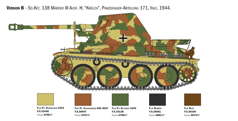 The German tank destroyer Sd.Kfz. 138 Marder III was developed for use by the German army based upon the chassis of the obsolete, but available, Czechoslovakian production light tank Panzer 38 (t). The modification involved the adoption, in an open structure protected by an inclined plate shield, of the effective PaK 40 75 mm anti-tank gun. The Marder III Ausf. H had the engine fitted in the rear of the vehicle and the weapon system in a central position, in order to ensure greater protection for the crew. In this configuration the Wehrmacht had a tank destroyer that was easy to produce and with firepower that could counteract main battle tanks of the period. It entered production in 1942 to meet the challenge of the eastern front operational theater but was ultimately deployed on all fronts until the end of the war.