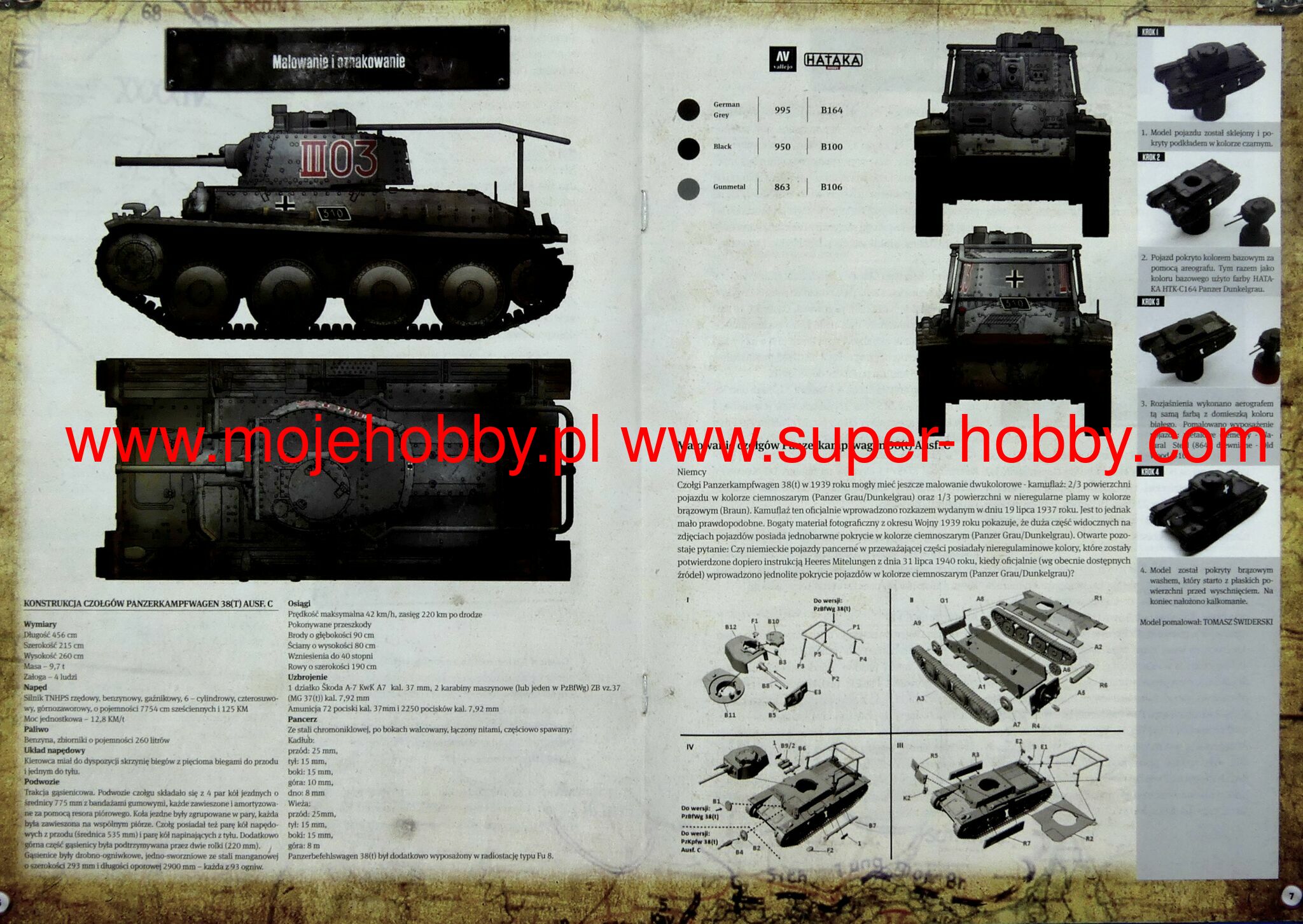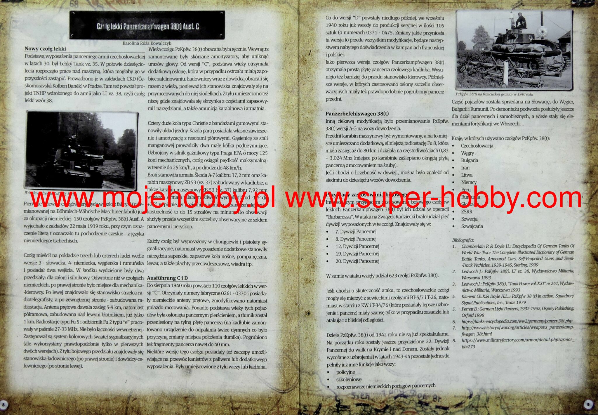 LT vz. 38 or Panzerkampfwagen 38 (t) was originally a Czechoslovakian and later a German light tank from World War II. The first prototypes of the vehicle were created in 1938, and serial production continued in the period 1938-1942, ending with the production of about 1,400 vehicles. The tank was powered by a single Prague EPA engine with 125 HP. It was armed with one 37.2 mm KwK 38 (t) L / 47 gun and two 7.92 mm MG 37 (t) machine guns. The CKD factory in Czechoslovakia produced the LT vz.35 tank from 1935, which was sold to the domestic army, but which - as it turned out in the course of its operation - had a number of disadvantages that made it impossible to succeed on foreign markets. Hence the initiative of the CKD company, which decided to develop the LT vz. 38. The new vehicle turned out to be a much better design than its predecessor, which resulted in orders placed by Peru, Iran, Switzerland and the Czechoslovak army. LT vz. 38 after Czechoslovakia was taken over by the Third Reich, it was taken over by the Wehrmacht under the name of Panzerkampfwagen 38 (t), and its production continued. The tank took part in the September campaign in 1939, in the French campaign in 1940 and in the initial period of the war with the USSR. From the second half of 1941, however, it was withdrawn from service due to too weak armor and low susceptibility to modernization. Based on the Panzerkampfwagen 38 (t) chassis, a tank destroyer named Hetzer was created.