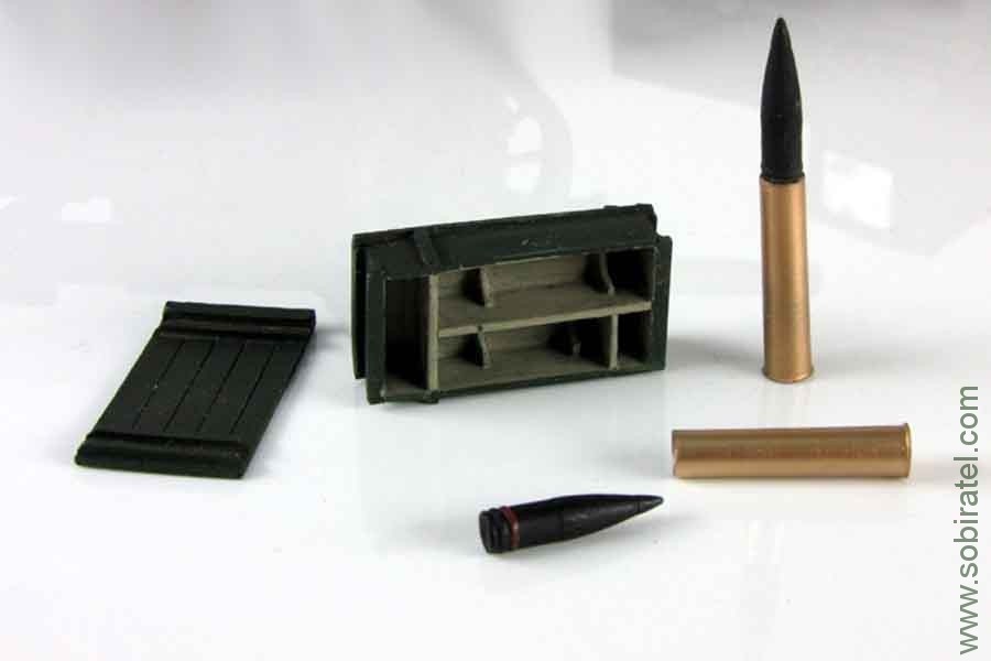 Комплектация: 1. Снарядный ящик и крышка 2. Гильза и боевая часть 3. Целый снаряд