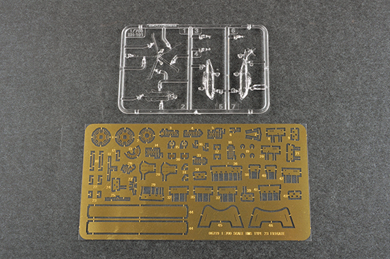 Описание Type 23 (также известный как класс Duke) это название класса современных британских ракетных фрегатов, которые поступили на вооружение с 1990 года. Всего было создано 16 единиц этого типа. Общая длина корабля этого типа составляет 133 метра, габаритная ширина 16,1 метра, полное водоизмещение примерно 4900 тонн. Максимальная скорость составляет около 28-30 узлов. В состав бортового вооружения входят: одна 32-реечная ракетная установка Sea Wolf, две счетверенные реактивные установки Harpoon, одна 113-мм пушка и две 30-мм пушки. В составе подразделения может базироваться один бортовой вертолет, например, Agusta-Westland Merlin HM2. Фрегаты Тип 23 изначально проектировались как специализированные противолодочные корабли (ЗОП), но в связи с опытом Фолклендской войны 1982 г. их бортовое вооружение было значительно расширено, включая 114-мм орудие и ракеты Гарпун. В конструкции агрегатов, особенно поступивших на вооружение позже, использовались элементы технологии малозаметности. В период 2005-2006 гг. в Великобритании было принято решение об отзыве трех единиц этого типа и продаже их в Чили. Краткое описание модели Длина: 190 мм; Ширина: 23,4 мм Всего частей 190+ Рамки фототравления: 1 шт Всего литников: 4 шт, корпус и палуба