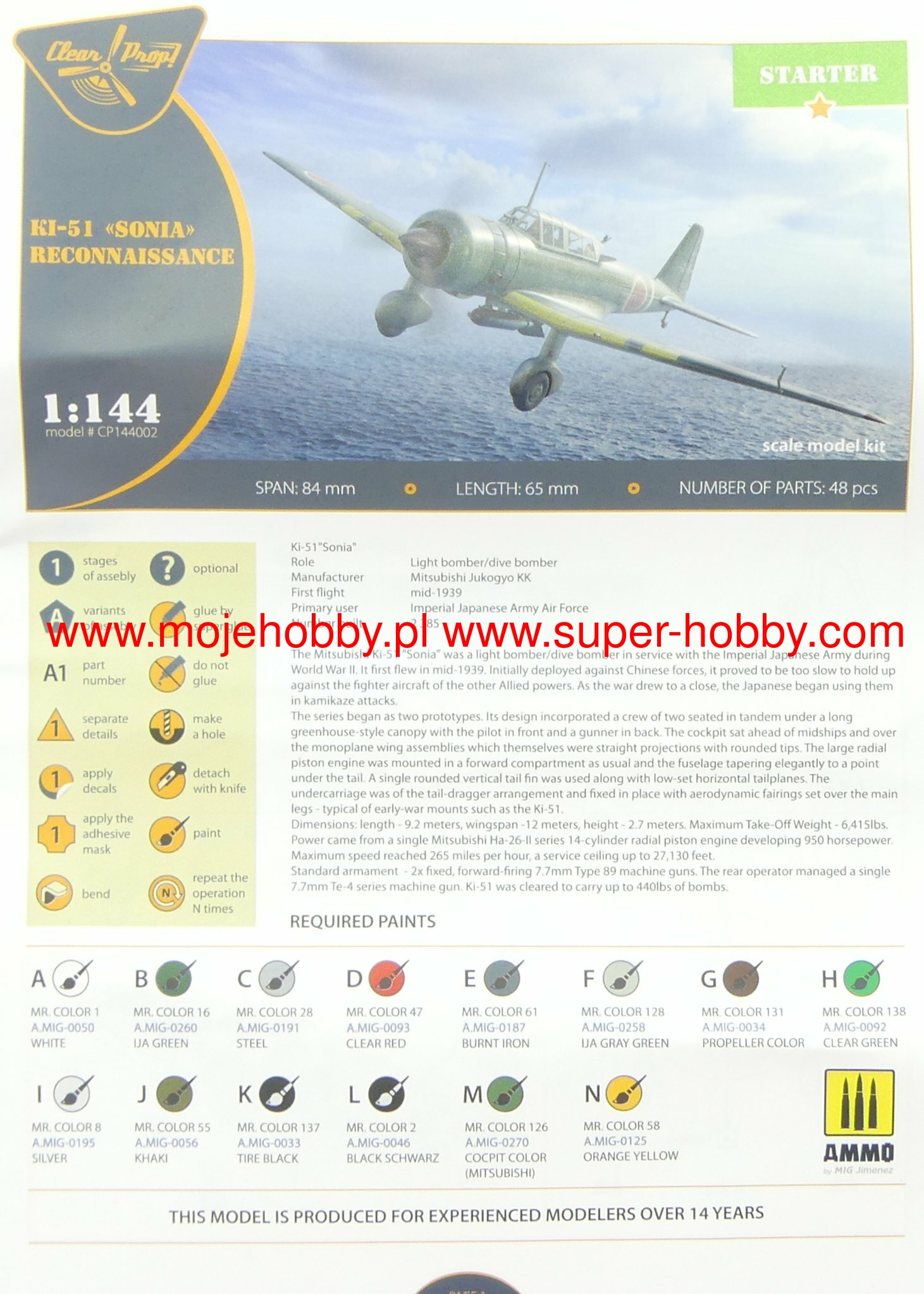 The Mitsubishi Ki-51 is a Japanese single-engine low-wing dive bomber with a fixed landing gear and classic tail from the Second World War, known as the Allied Sonia. The drive unit was a Nakajima Ha-26 II engine with a capacity of 950KM. In the summer of 1939 11 Ki-51 prototypes were delivered to pilots in China and were put through trials, which were completed at the end of the same year. Aircraft of this type were intended for reconnaissance and tactical attack aircraft, and many of them were equipped with film cameras. At the end of the war, they were used as kamikaze planes. Until the end of June 1945. About 2,385 of this type were produced. The Ki-51 was rarely used in clashes with allied machines, because due to its poor performance, it was easily looted by them. However, it was successfully used in China and for jungle fights on the Sino-Indo-Burmese border. Technical data: length: 9.21 m, wingspan: 12.1 m, height: 2.73 m, maximum speed: 424 km / h, climb speed: 8.4 m / s, maximum range: 1060 km, maximum ceiling: 8270 m, armament: fixed - 3 machine guns cal.7.7 mm, suspended - up to 200 kg of bombs.