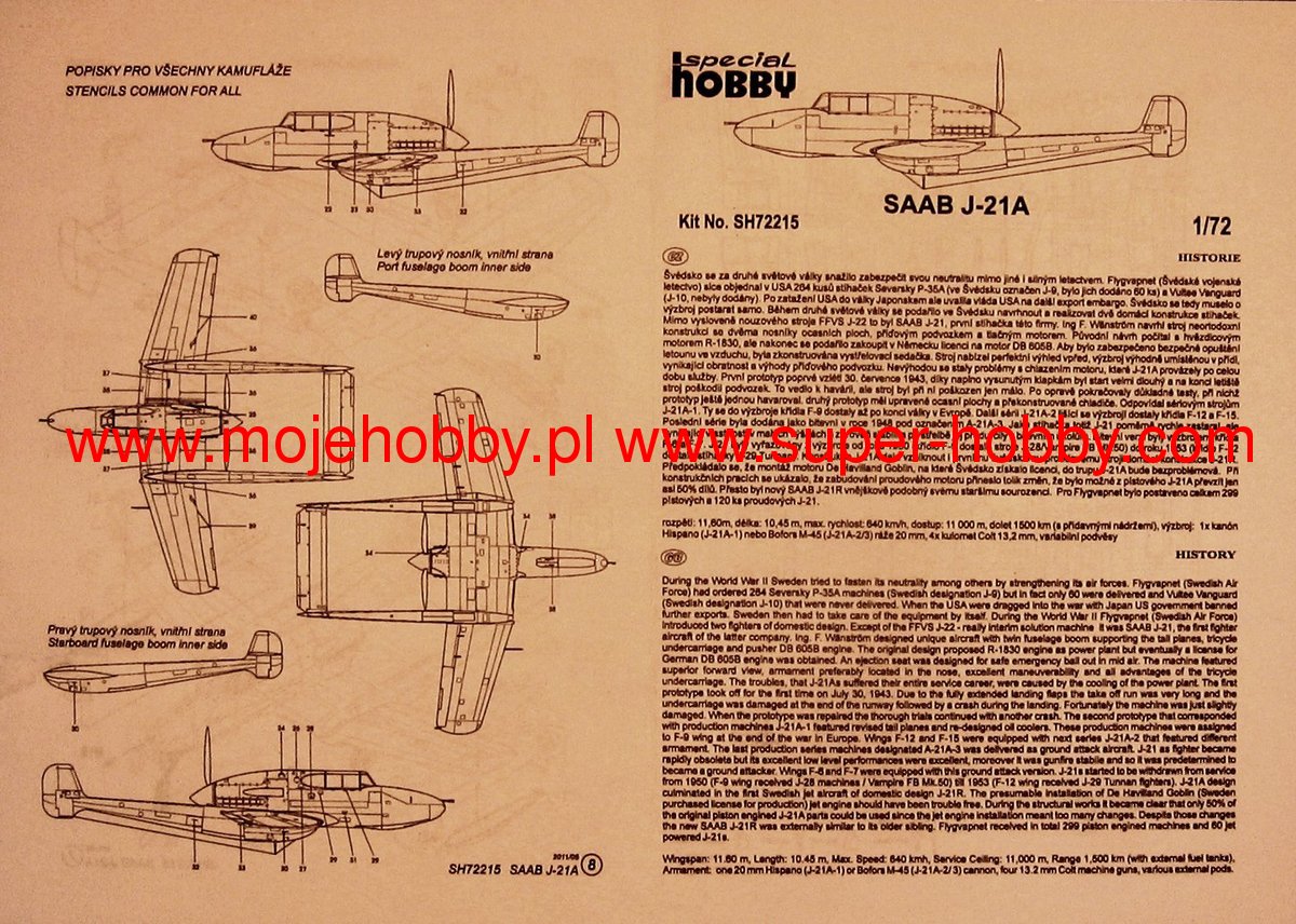 The SAAB-21 was a Swedish low-wing fighter and attack aircraft with a metal structure from the Second World War. The drive was provided by a single Daimler-Benz DB605B engine with a maximum power of 1455 HP. The flight of the prototype took place in 1943, and serial production continued in 1945-1949, ending with the production of about 295 copies of this aircraft. The deck armament consisted of a single 20mm Hispano-Suiza HS.404 cannon and 4 13.2mm machine guns. In connection with the ongoing World War II, Sweden, neutral in the course of this conflict, decided to develop by itself a completely new fighter-attack aircraft that would not differ from foreign designs. However, it was decided to use the DB605B engine licensed by Volvo Aero. Finally, a highly unusual machine was created with a push propeller instead of a towing one, and with a double-beam rear tail. What's more, the machine had good performance, high maneuverability and used a throwaway pilot's seat, which at that time was an avant-garde solution. SAAB-21 was produced in two basic versions: J-21 (hunting version) and A-21 (assault version). The machine also had a significant modernization potential, as the SAAB J-21R, i.e. a fighter already powered by a jet engine, was created on the basis of it. The last SAAB-21 aircraft were withdrawn from the line by 1954.