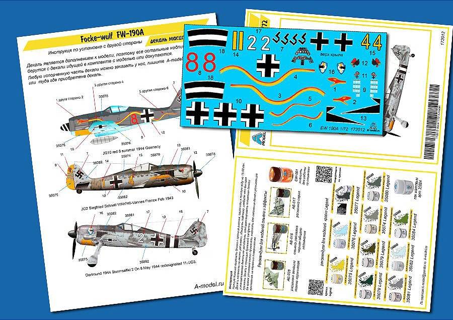 Набор декалей для Fw-190A от производителя A-model для коллекционных и сборных моделей в масштабе 1:72 из пластика, железа и других материалов. Набор предаст вашей модели неповторимую оригинальность. При правильном расположении деталей набора подходит на любую современную модель. Способ применения: Нужный компонент декали вырезать как можно ближе по контуру, на несколько секунд опустить в теплую воду. Поднести к предполагаемому месту нанесения слегка прижав верхний прозрачный слой с рисунком сдвинуть нижний слой подложки, откорректировать декаль на поверхности слегка прижать по углам и неровностям на поверхности модели если такие есть и аккуратно прижать к месту установки бумажной салфеткой. После установки для уменьшения заметности нанесения модель можно покрыть прозрачным акриловым водосодержащим лаком заклеив перед этим все места куда не желательно попадания лака.