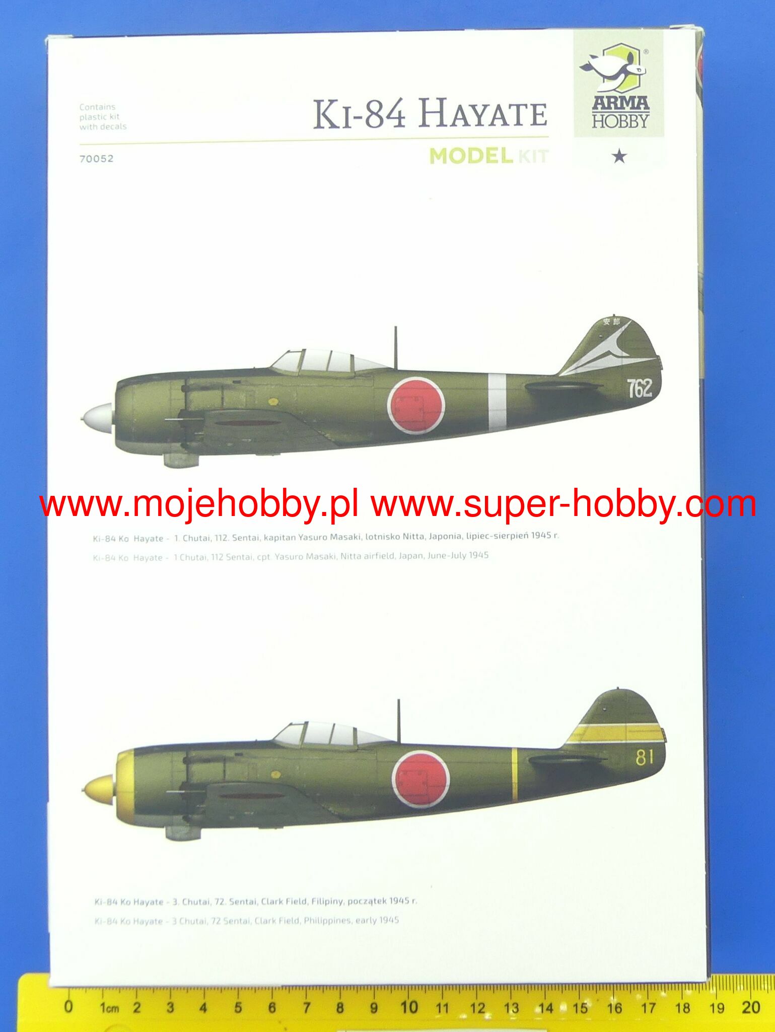 The Nakajima Ki-84 Hayate (Japanese windstorm) is a Japanese single-engine single-seat fighter with a half-shell, all-metal structure in a low wing structure. The prototype flight took place in April 1943, and from 1944 the machine entered the line. The Ki-84 was the most important Japanese fighter at the end of the war, with excellent flight characteristics, top speed and maneuverability. He was able to engage in an equal fight with the Allied machines without any problems. Also, unlike the much better known Zero, it had good armor, strong shooting weapons and self-sealing fuel tanks, which made it a very dangerous opponent. The main mass-produced version is the Ki-84-I with several versions, powered by a Nakajima Ha-45 engine of various models, the most widely used of which was the 23 (1900HP). Ki-84 of this series served min. in China, Okinawa, and defended the Japanese islands against Allied air strikes. It is worth noting that in the declining period of the war efforts were made to replace scarce aluminum with wood or steel, but such versions of the Ki-84 were never produced on a large scale. All versions of the Ki-84 were produced 3,514 copies. Technical data: length: 9.93m, wingspan: 11.23m, height: 3.38m, maximum speed: 687km / h, rate of climb: 19.3m / s, maximum range: 2150km, maximum ceiling 10500m, armament: permanent -2 12.7mm Ho-103 machine guns and 2 20mm Ho-5 cannons, suspended - up to 500 kg of bombs.