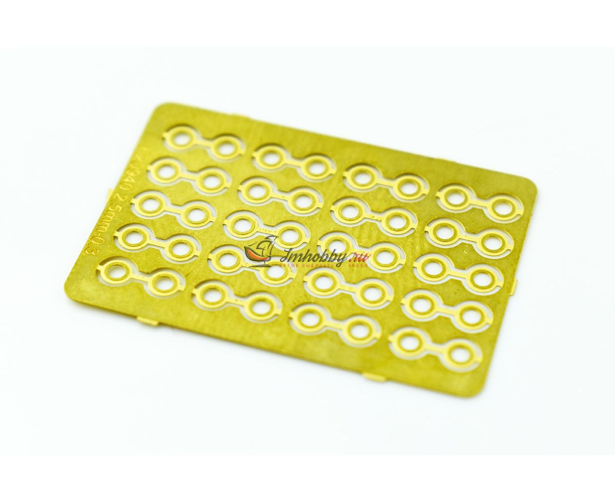 Набор из 20 миниатюрных коушей размером всего 2 мм. Коуши изготовлены из латуни методом фототравления. Коуши служат для крепления концов троса за обухи и рымы и соединения двух тросов. Перед установкой требуется согнуть коуши пополам выступающими сторонами. Размер - 2 ммКоличество на пластине - 20 штук. Производитель - Фальконет, Россия.