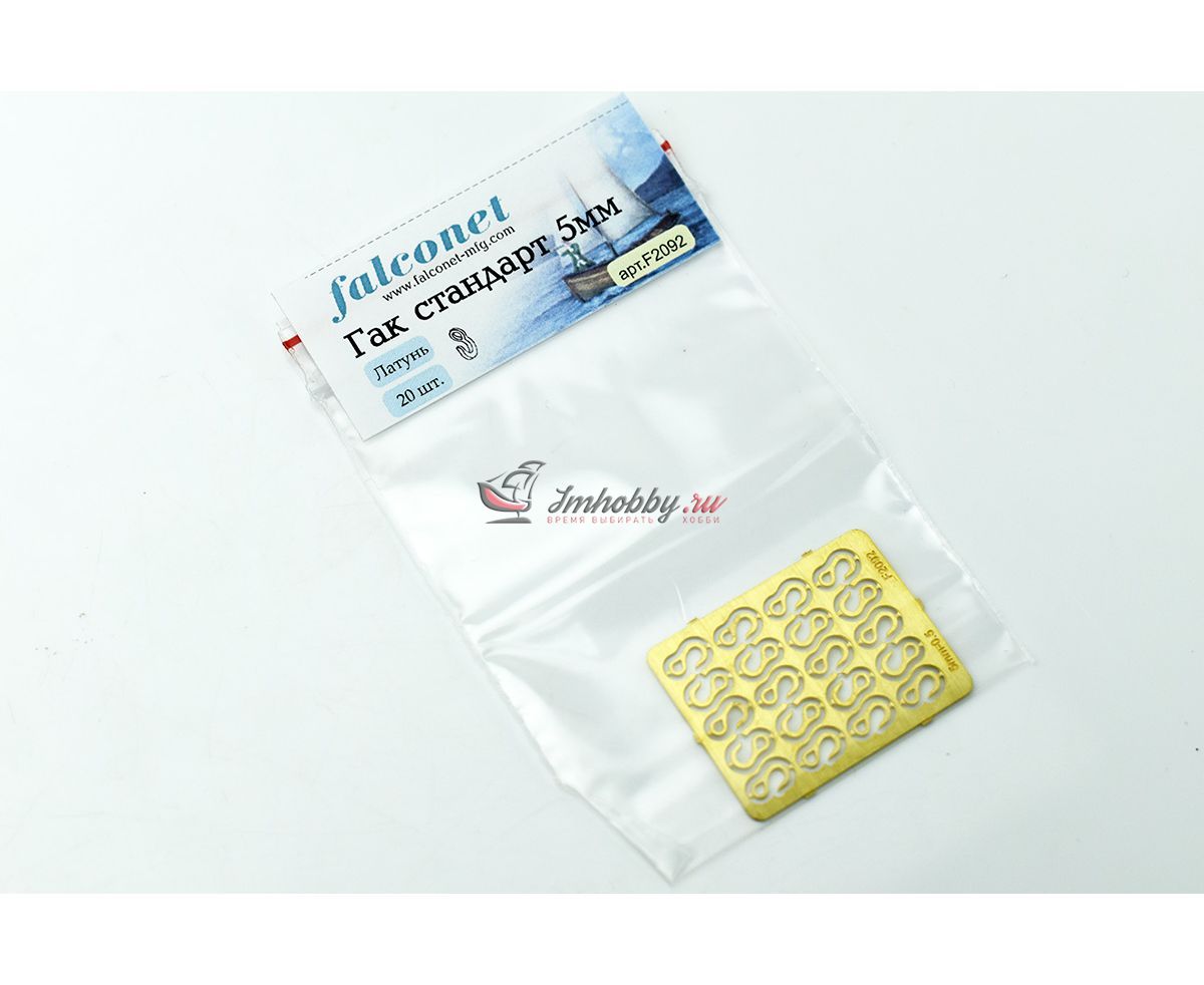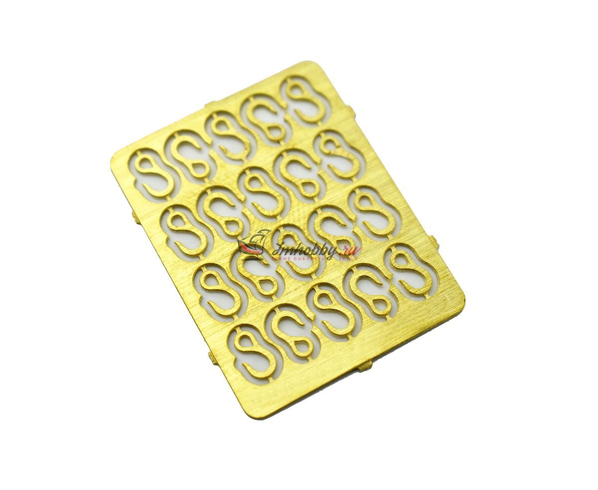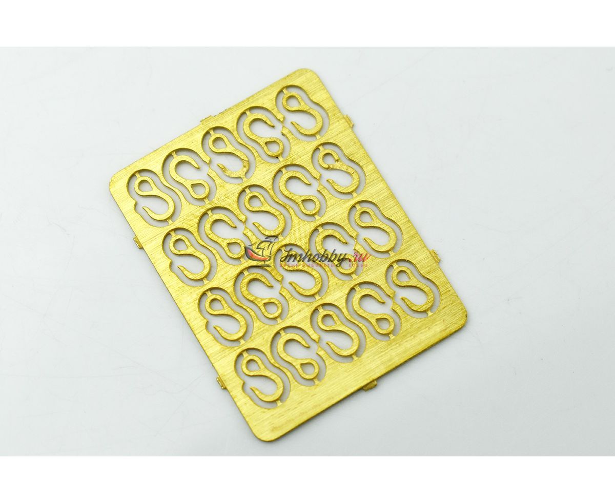 Набор из 20 повернутых гаков высотой 5 мм. В отличие от обычных гаков, отверстие для троса выполнено в форме капельки. Гаки изготовлены из латуни методом фототравления. Для подъема грузов или буксировки гаки прикрепляются к концу каната, троса или цепи. Фото снято с большим увеличением, все неровности невооруженным глазом не видно. Высота - 5 ммКоличество на пластине - 20 штук. Производитель - Фальконет, Россия.