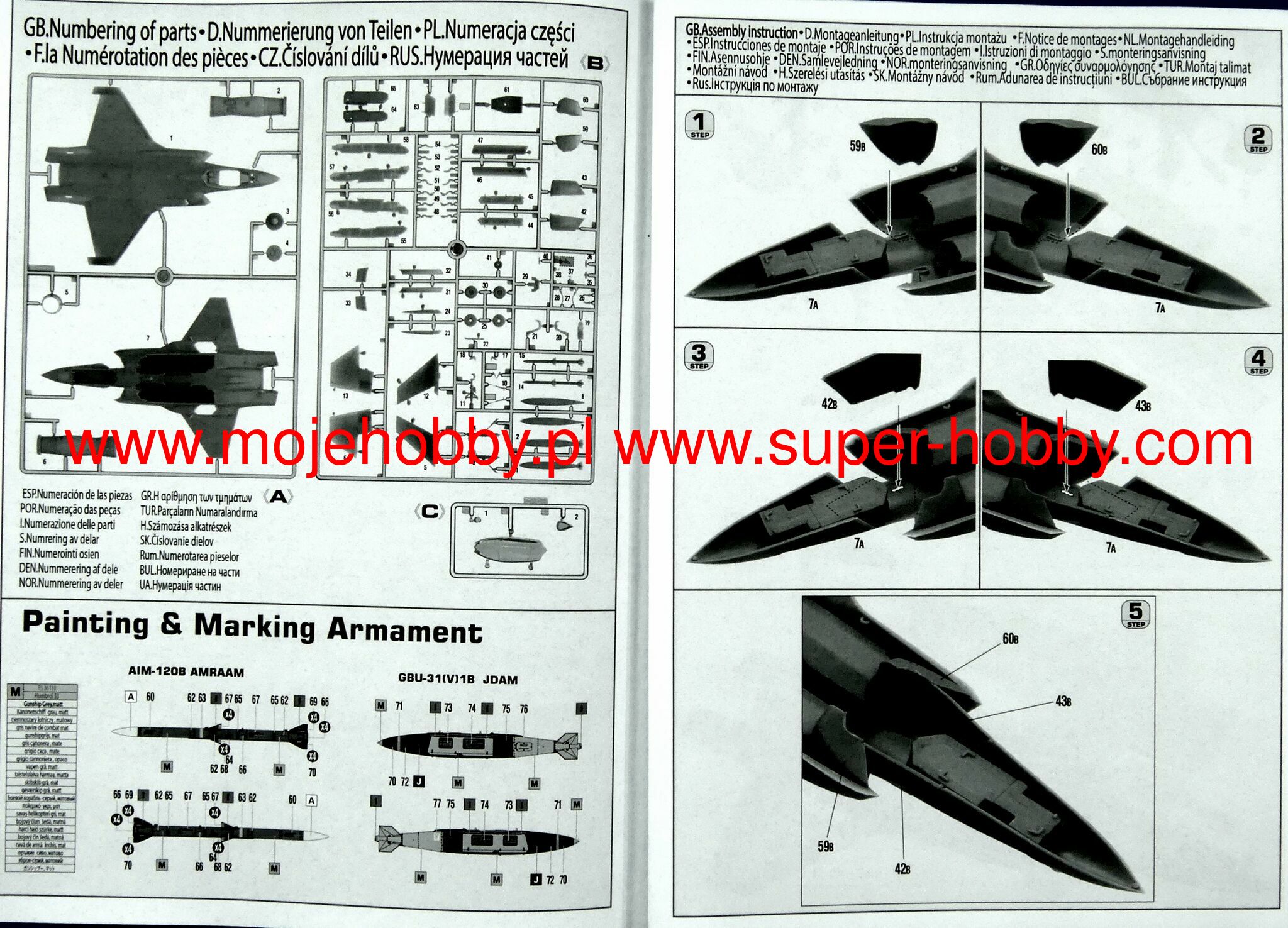 Note: Comany Mistercraft frequently changes, without any notice, the decals that come with the model, so they may differ from the photos and descriptions on our website. If you need a specific version, please let us know about that by entering the appropriate notice in the comments field when placing the order. Lockheed Martin F-35 Lightning II (lightning) is a single-seat, single-engine multi-role fighter built by Lockheed Martin as a fifth generation machine, which is to meet the needs of the USAAF, US Navy, US Army and US Marine Corps. Originally the machine was called the X-35 JSF, but in 2006 it was changed to the F-35 Lightning II. Despite the fact that the main recipient will be the US government, the project is also co-financed by other countries, especially Great Britain, Italy and the Netherlands. The main contractors are: Lockheed Martin, Northrop Grumman and BAE Systems. The overriding goal of the JSF idea is to create a universal machine, produced for all types of armed forces, which will allow for far-reaching standardization of spare parts and a significant reduction in costs. Finally, three versions of the F-35 (A, B and C) are to be built, which will have more than three-quarters of the same elements. The main task of the F-35 of all versions is to attack land targets, perform the tasks of a battlefield plane, air combat and electronic combat. It should be noted that the F-35 is designed for conflicts of a low intensity, in contrast to its larger "relative" F-22. Which does not change the fact that thanks to the propulsion unit used (Pratt-Whitney F135 engines), avionics and Stealth properties, it is one of the most modern multi-role aircraft in the world. The first serial F-35 was made in February 2006. Until now (2013), 63 aircraft of this type have been built. Technical data (version F-35A): Maximum speed: 1930 km / h, maximum ceiling 18288 m, maximum range: 2220 km, armament: fixed - one four-barrel General Dynamics GAU-22 / A 25mm cannon, suspended - up to 8100 kg load.