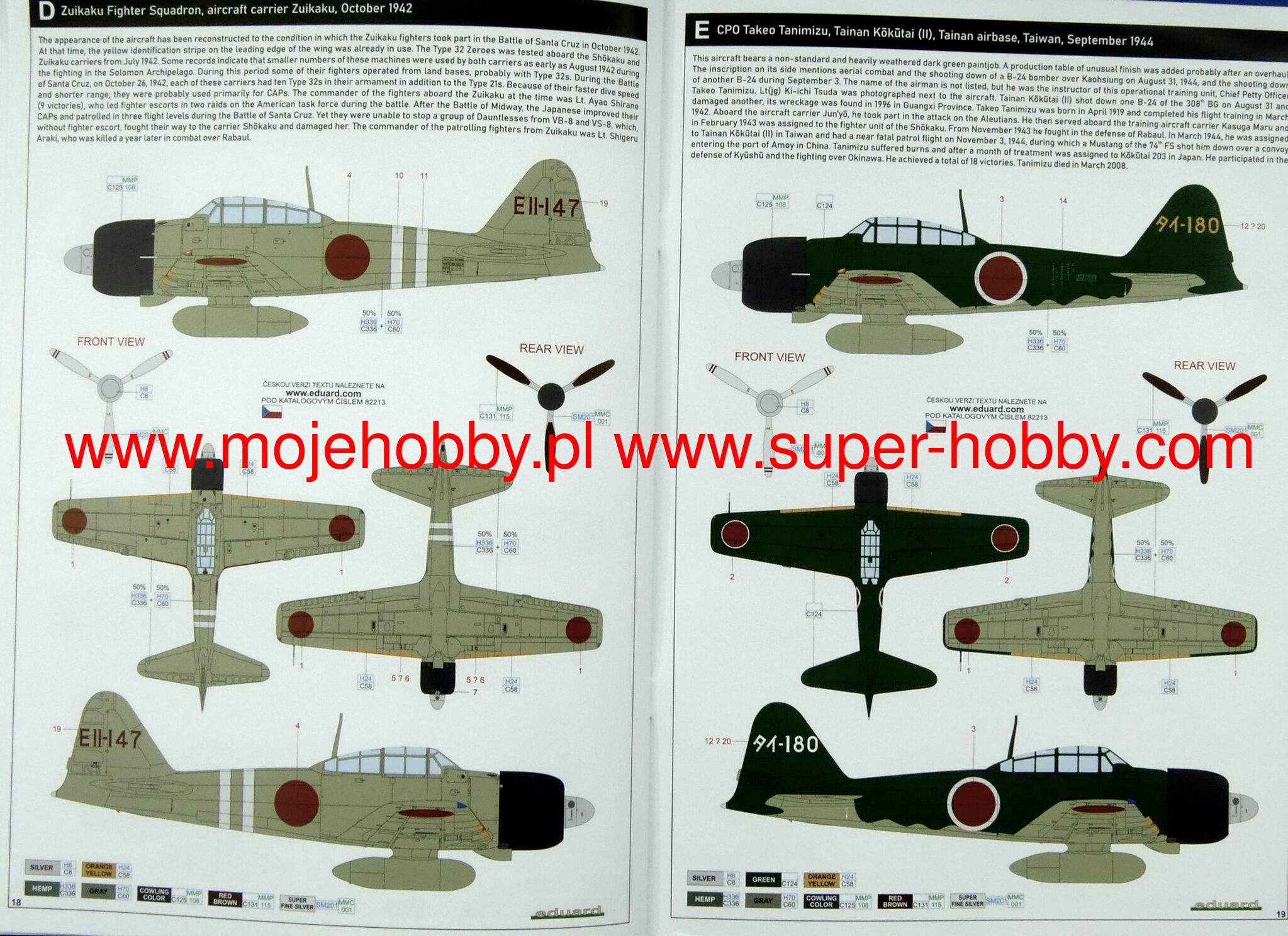 The Mitsubishi A6M Reisen (also known as Zero or Zeke) is a Japanese single-engine, full-metal low-wing fighter aircraft from the Second World War. The flight of the prototype took place on April 1, 1939, and it was put into service in the summer of 1940. The first prototypes were powered by a Mitsubishi Zuisei 13 engine, but from the A6M2 Model 11 onwards, the Nakajima NK1B Sakae 12 engine with 950 HP was used, which made the aircraft one of the best fighters early war period. New versions were created just before and during the war. One of the most famous was the A6M2 Model 21, a special version with folding wings designed for aircraft carriers, prepared at the beginning of the Pacific War, which became the basic Japanese on-board fighter. The next versions are A6M3 and A6M5, each of which had several versions. The first one used the 1130 HP Nakajima Sakae 21 engine with a compressor, which, however, meant an increase in weight and a decrease in range and maneuverability. Attempts were made to solve this problem in the A6M5 version by changing the exhaust system, changing the shape of the wings and resigning from folding them, which increased the top speed. The flight of this version took place in 1943 and was in production until the end of the war. It is worth noting that one of the most widely produced versions of the A6M5 was the A6M5C Model 52C Hei aircraft, of which nearly 5,000 were produced. "Zero" planes took part in the entire war in the Pacific, serving primarily as deck fighters, but also to a large extent as Army fighters. The "father" of this famous aircraft was the engineer Jiro Horikoshi, who relied on the experience gained from working on the M5A aircraft. He managed to develop a very maneuverable plane, with excellent aerodynamic properties, perfect for combat and with a large range. However, this was achieved at the expense of armor and the lack of self-sealing fuel tanks. What's more, due to the lack of aircraft engines with a power comparable to American machines, every year of the war, "Zero" from the "supercar", from 1943, evolved towards the weaker rival P-51, P-47 or F-4 or F- 6. It also turned out to be a machine vulnerable to damage and very vulnerable to fire. However, this does not change the fact that the Allies, until 1943, did not have an aircraft that would be able to compete with the A6M Zero. Technical data (A6M2 model 21 version): length: 9.06m, wingspan: 12m, height: 3.05m, maximum speed: 533km / h, rate of climb: 15.7m / s, maximum range: 3105km, maximum ceiling 10000m , armament: fixed - 2 20mm Type 99-1 cannons and 2 7.7mm Type 97 machine guns, suspended - up to 250 kg of bombs. 3_edu82213_instruction_sheet.pdf