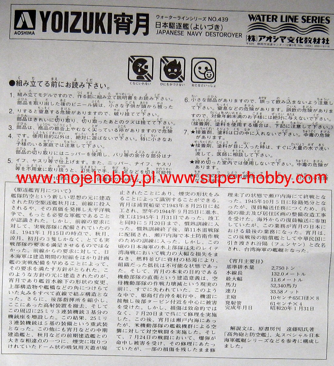 Yoizuki was a Japanese destroyer whose keel was laid in 1943, launched in September 1944, and commissioned in the Imperial Japanese Navy in January 1945. The length of the ship at the time of launching was 134.2 m, width 11.6 m, and the actual full displacement - 3,700 tons. Destroyer Yoizuki's top speed was up to 33 knots. The main armament at the time of the launch was 8 100 mm guns in four twin turrets, and the secondary armament was 15 25 mm cannons, depth charge launchers and four 610 mm torpedo tubes. Yoizuki was the tenth Akizuki class destroyer. Destroyers of this type were designed as anti-aircraft destroyers, intended to protect high-speed Japanese aircraft carriers, which resulted in the arming with 100 mm universal artillery and weak - by Japanese standards - torpedo armament. Initially, 55 ships of this type were planned to be launched, but due to problems with the supply of raw materials, only 12 Akizuki-class destroyers entered service. However, they received very positive reviews due to their long range, high speed, good stability and sea prowess. They were considered to be one of the best destroyers of World War II. Yoizuki (side number 363) initially served in the home waters and in February 1945 supported the air defense of Yokosuka against a B-29 bomber raid. In June of the same year, he climbed a mine, but suffered no serious damage. Until the end of the war, it was not used in combat. After its completion, it was used to transport Japanese soldiers from bases in the Pacific, and in 1947 it was handed over to China - as war reparations - and renamed Fen Yang. From 1949 in service with the Taiwanese navy, but soon placed in reserve. By 1963, it was scrapped.