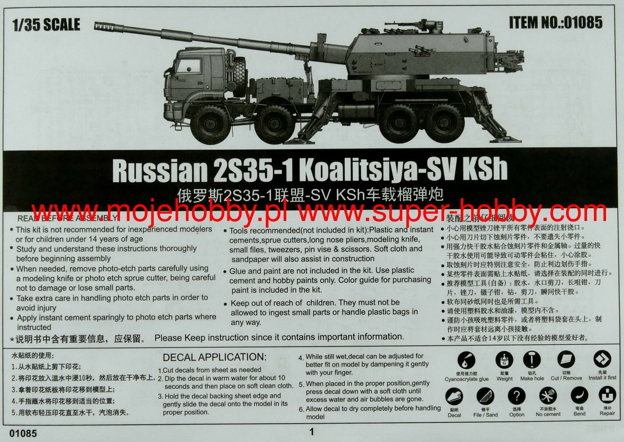 Купить 01085 ТЕХНИКА И ВООРУЖЕНИЕ RUSSIAN 2S35-1 KO@LITSIYA-SV KSH (1/35)