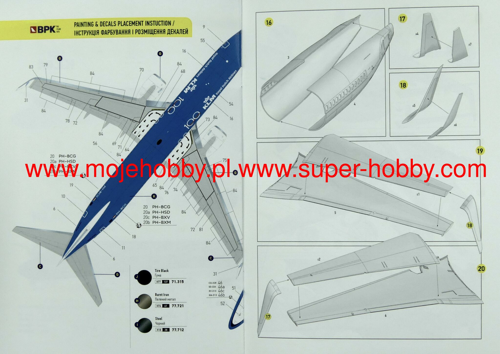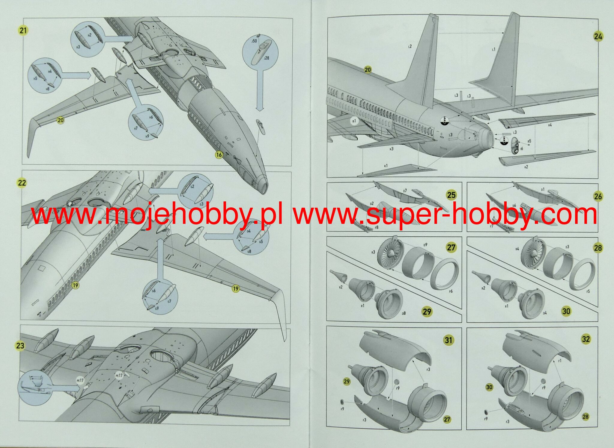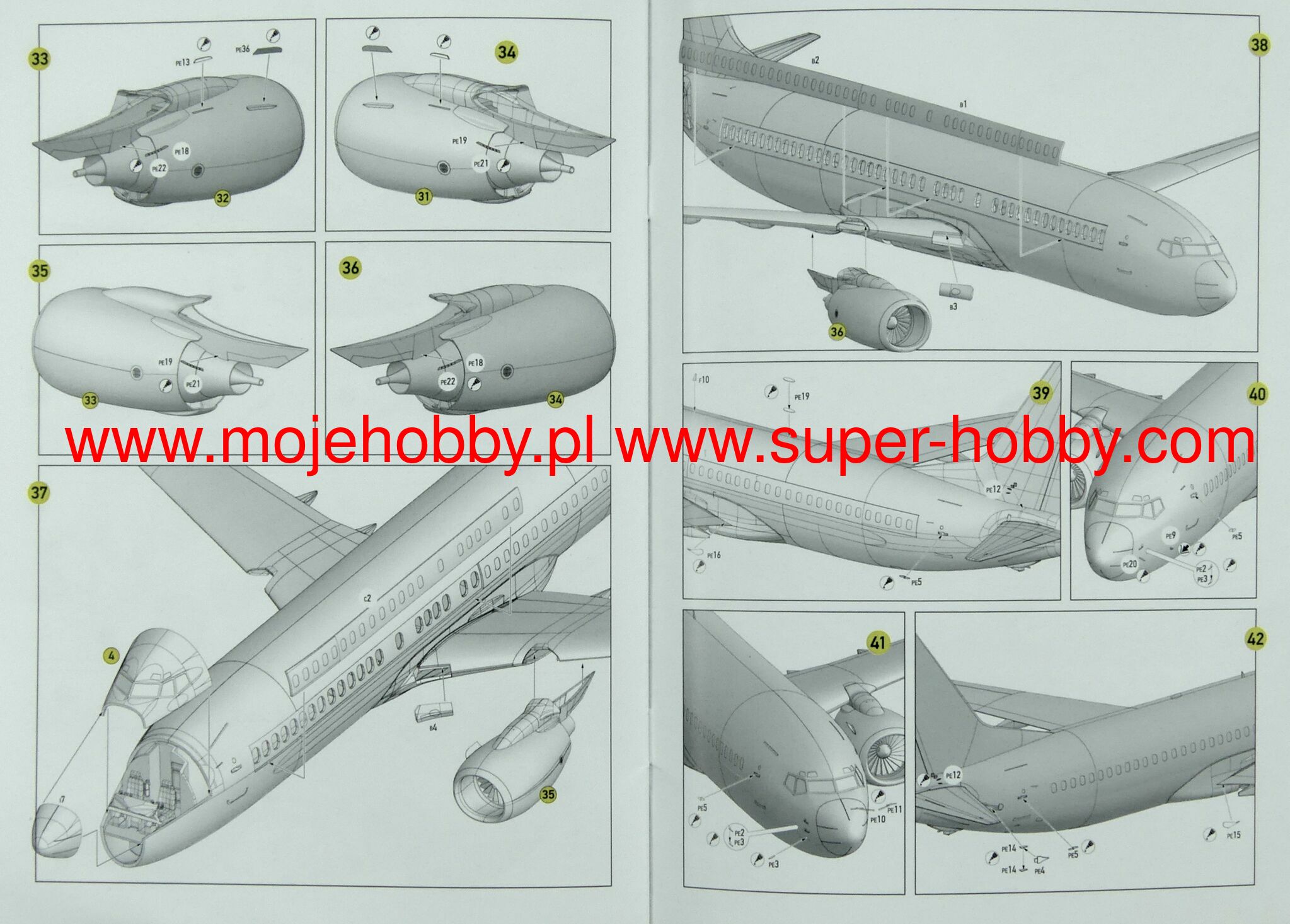 The Boeing 737 is a short-range, low-wing, twin-engine, low-wing jet aircraft manufactured in the USA. The drive is provided by two Pratt and Whitney JT8D or CFM International CFM56 engines. The flight of the prototype took place in 1967, and serial production started in 1968 and is still ongoing. The Boeing 737 is the most frequently ordered passenger plane in history, and by mid-2017, as many as 9,486 copies of this aircraft had been built! The aircraft of this type was created as a response of the Boeing concern to the demand reported by American airlines for a new passenger machine characterized by low operating costs. In addition, it uses a "2x3" seating system, ie there are two rows of 3 seats in the passenger compartment, which allowed to carry a larger number of passengers. Several major development versions of this very successful aircraft were produced in the course of serial production. The first mass-produced was the Boeing 737-100, but the Boeing 737-200 model was quickly put into service, with improved performance and aerodynamic properties. The Boeing 737-600, 737-700 and 737-800 models, which appeared in the late 1990s, used the most modern avionics with a glass cockpit layout and LCD displays instead of analog clocks. One of the newest versions is the Boeing 737-900, which was flown in 2000. Its aerodynamics have been improved and the shape of the wings has been changed, thanks to which the range has improved. Depending on the version, the Boeing 737 can take 104 to 215 passengers on board.