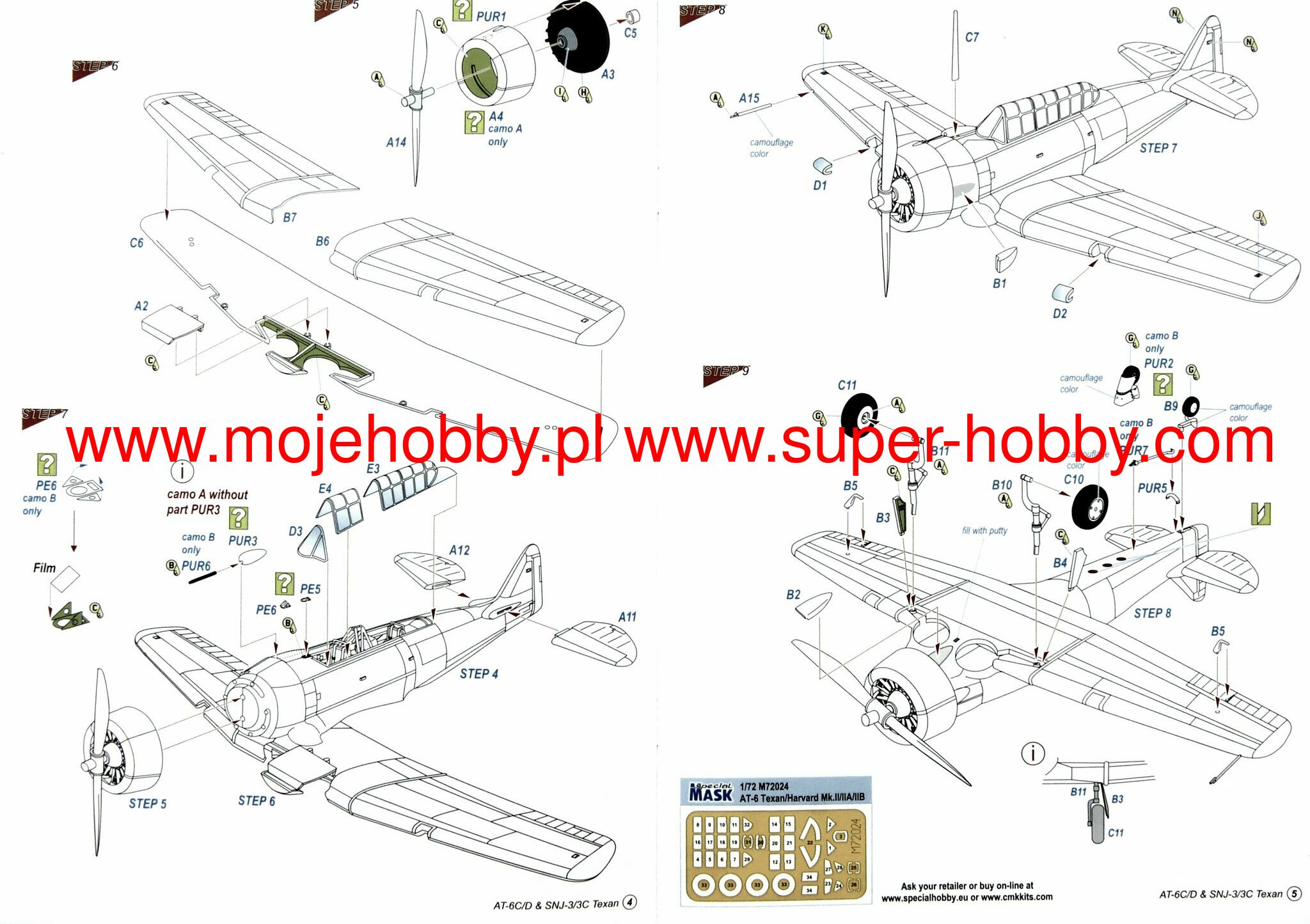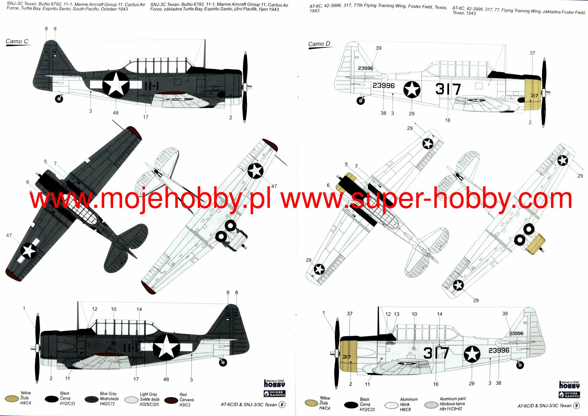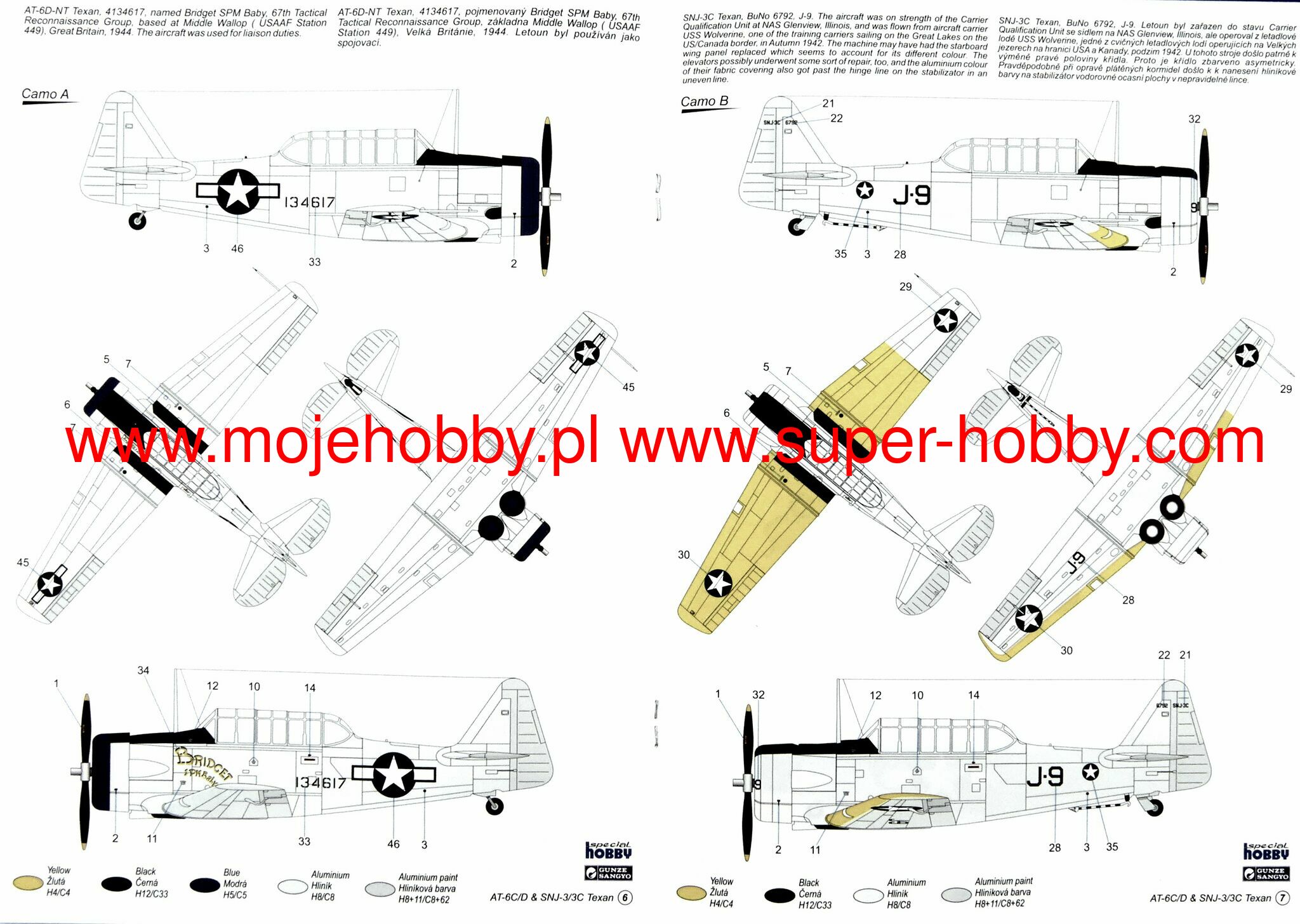 The North American T-6 Texan is an American, single-engine, low-wing metal training aircraft from the World War II period. Also known by the SNJ and Harvard markings. The prototype flight took place in 1935. It was one of the most widely produced (over 15,000 units) school machines in the ranks of the Allies. Technical data: length: 8.84m, wingspan: 12.81m, height: 3.57m, maximum speed: 335km / h, rate of climb: 6.1m / s, practical ceiling: 7300m, maximum range: 1100km, armament: fixed - 3 machine guns cal.7.62mm.