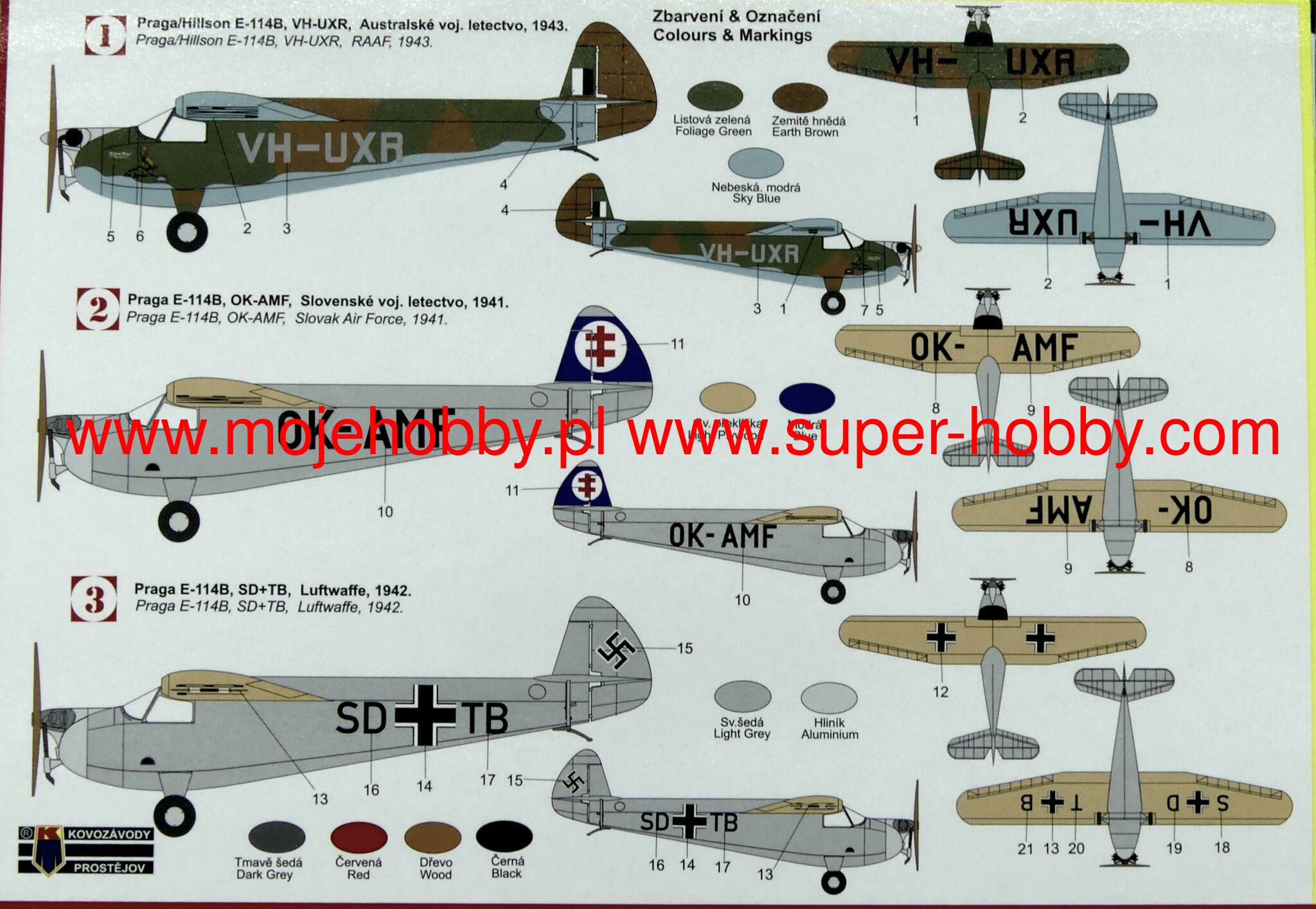 The Prague E.114 was a Czechoslovakian light sports aircraft in the high wing configuration, with a classic - fixed landing gear, from the interwar period. The flight of the prototype took place in 1934, and shortly after that, mass production started, which led to the creation of about 250-300 aircraft of this type. The drive - in version E.114 B 2 - was provided by a single Prague B-2 engine with a capacity of 45 HP. The plane did not have on-board weapons. Praga E.114 was built in the CKD-Praga plant, and its main designer was Jaroslav Slechta. The new machine was characterized primarily by a simple and rather conservative design and a relatively low weight, which earned it the nickname "Air Baby". It also turned out to be a successful plane, which was produced both in domestic plants in Czechoslovakia and licensed in Great Britain by F. Hills and Sons Limited based in Manchester (designation: Hilson-Prague). In the course of production, several development versions of the aircraft were created (eg E.114M, E.114C or E.115), which differed from each other mainly in the power unit.