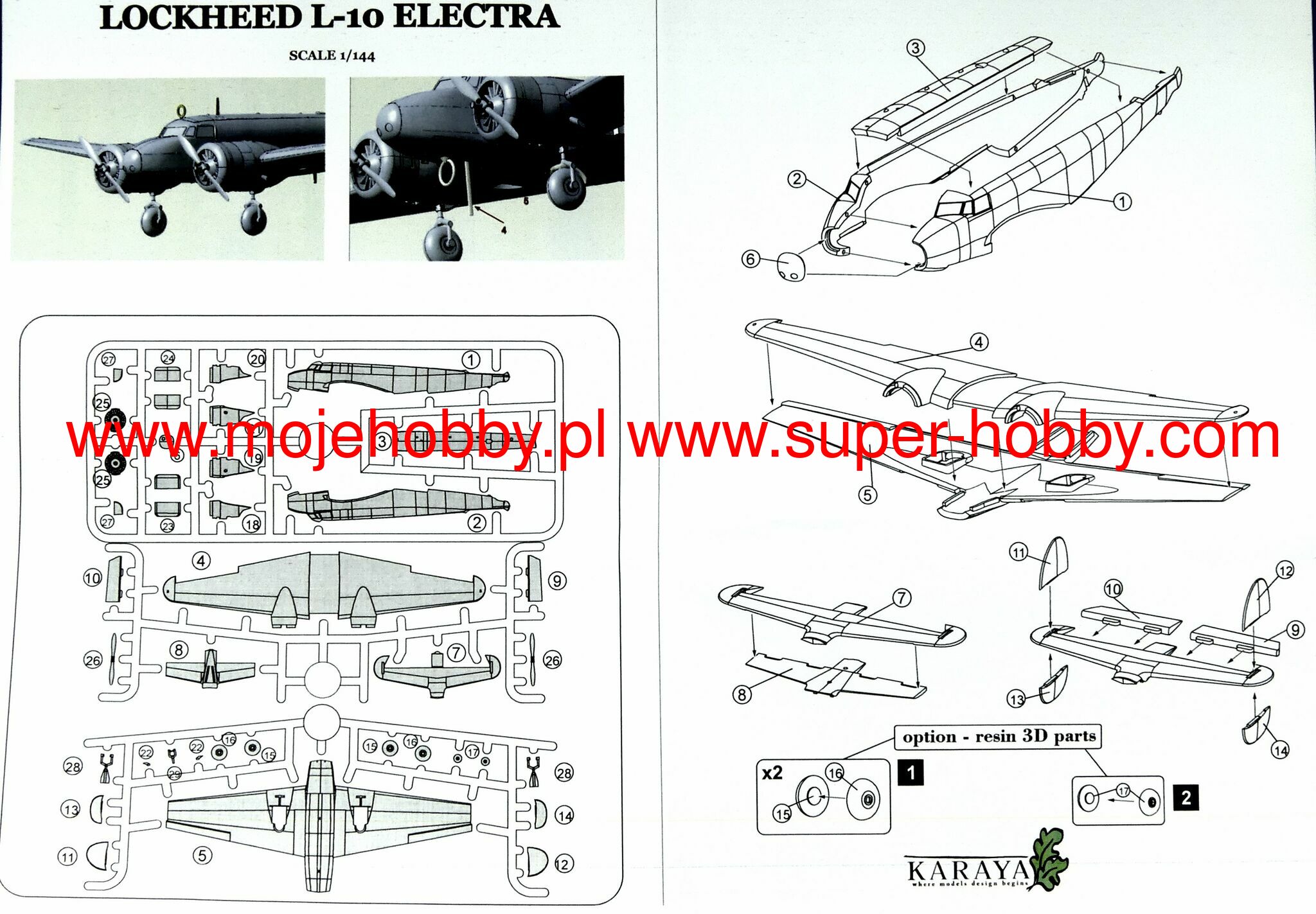 The Lockheed L-10 Electra is an American twin-engine passenger and transport plane with a low wing structure with a full metal structure. The flight of the prototype took place in 1934, and serial production started in 1935. The most widely produced version (L-10A) was powered by two Pratt-Whitney R-985 Wasp Junior SB engines with 450Km each. The L-10 perfectly matched the needs of the aviation market and served in over 30 airlines, including LOT Polish Airlines. After the outbreak of the war, these planes were modernized in the United States for war purposes and were used to photograph the terrain and to observe enemy forces. A total of about 130 aircraft of this type were produced, but at the time of the attack on Pearl Harbor they were already outdated machines compared to the Beech 18 aircraft. Technical data: length: 11.8 m, wingspan: 16.8 m, height: 3.1 m, maximum speed: 325 km / h, maximum range: 1150 km, ceiling practical 5900 m.