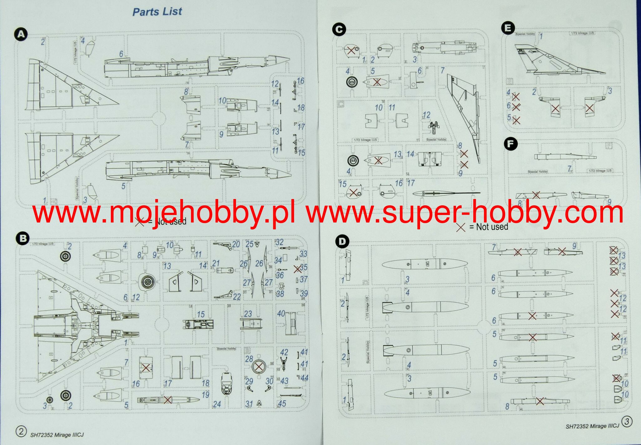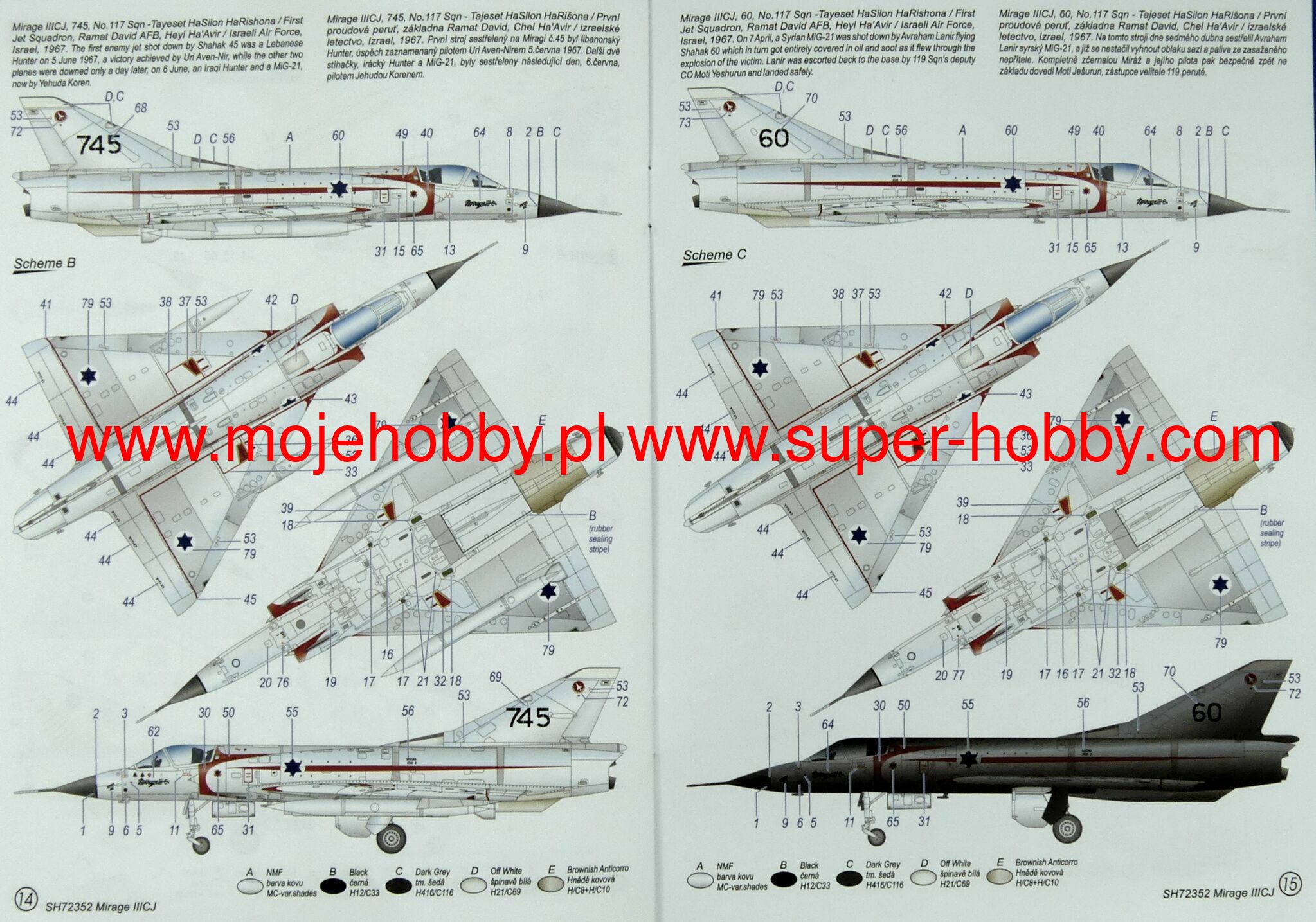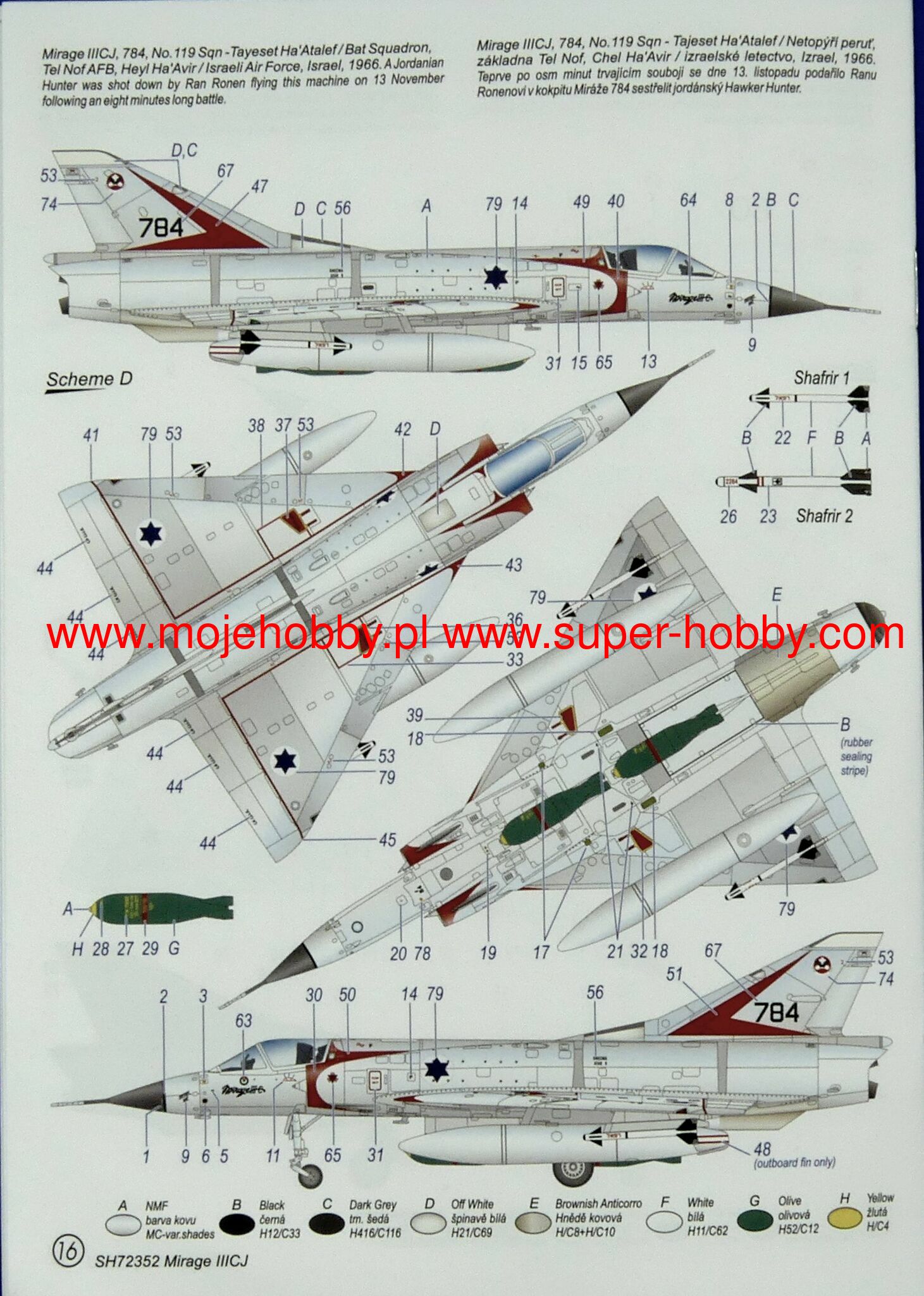 The Dassault Mirage III / 5/50 is a French single-engine fighter-attack aircraft with a delta-shaped lobe, without horizontal tail. In late 1955, Dassault began building a single prototype that retained the delta wing and an enlarged fuselage that could accommodate one SNECMA Atar 101G1 engine. The resulting Mirage III-001 was flown on November 17, 1956, to reach a flight speed of 1.52Ma after just two months. The use of manually controlled cones in fixed side inlets and the Atar 101G2 engine with thrust increased to 4490 kg, allowed to increase the speed to 1.65Ma, and then by using the SERP rocket accelerator - to 1.8Ma. To achieve the highest speed, Dassault modified the wing and after the first flight on May 12, 1958, Mirage IIIA reached the speed of 2.2Ma with an additional rocket engine. This led to the launch of production of the two-seater training version with tandem seats - the Mirage IIIB and the single-seat interceptor Mirage IIIC. The latter version had a built-in Cyrano AI radar, and two 30mm cannons could be supported by Matra R.530 or AIM-9 Sidewinder air-to-air missiles. The next important version was the long-range Mirage IIIE fighter-bomber, with the Atar 9C engine built into a slightly extended hull. This version was equipped with the Cyrano II radar, which, in combination with the Doppler radar and the TACAN navigation system, made it possible to conduct an attack at low altitude without the target's visibility in all weather conditions. Modification programs Mirage III (and derivatives V and 50) include the installation of modern navigation systems, weapons control and adaptation to modern types of weapons. The second area of modification is the installation of Atar 9K-50 engines with a thrust greater by about 20%, adaptation to centralized refueling under pressure and refueling during the flight, installation of zero-zero class catapult seats, improved visibility from the cabin, installation of front control surfaces increasing maneuverability in air combat, adaptation to carrying containers, e.g. for electronic warfare, laser target marking, recognition or infrared imaging of targets. Technical data (version IIIC): length: 14.77m, wingspan: 8.22m, height: 4.25m, maximum speed: 2.2Ma, climb speed: 83m / s, maximum range (with additional tanks): 4000km, maximum ceiling 17000m, equipment: fixed - two 30mm DEFA 552 cannons, suspended (Mirage 5) - up to 4200 kg of cargo.