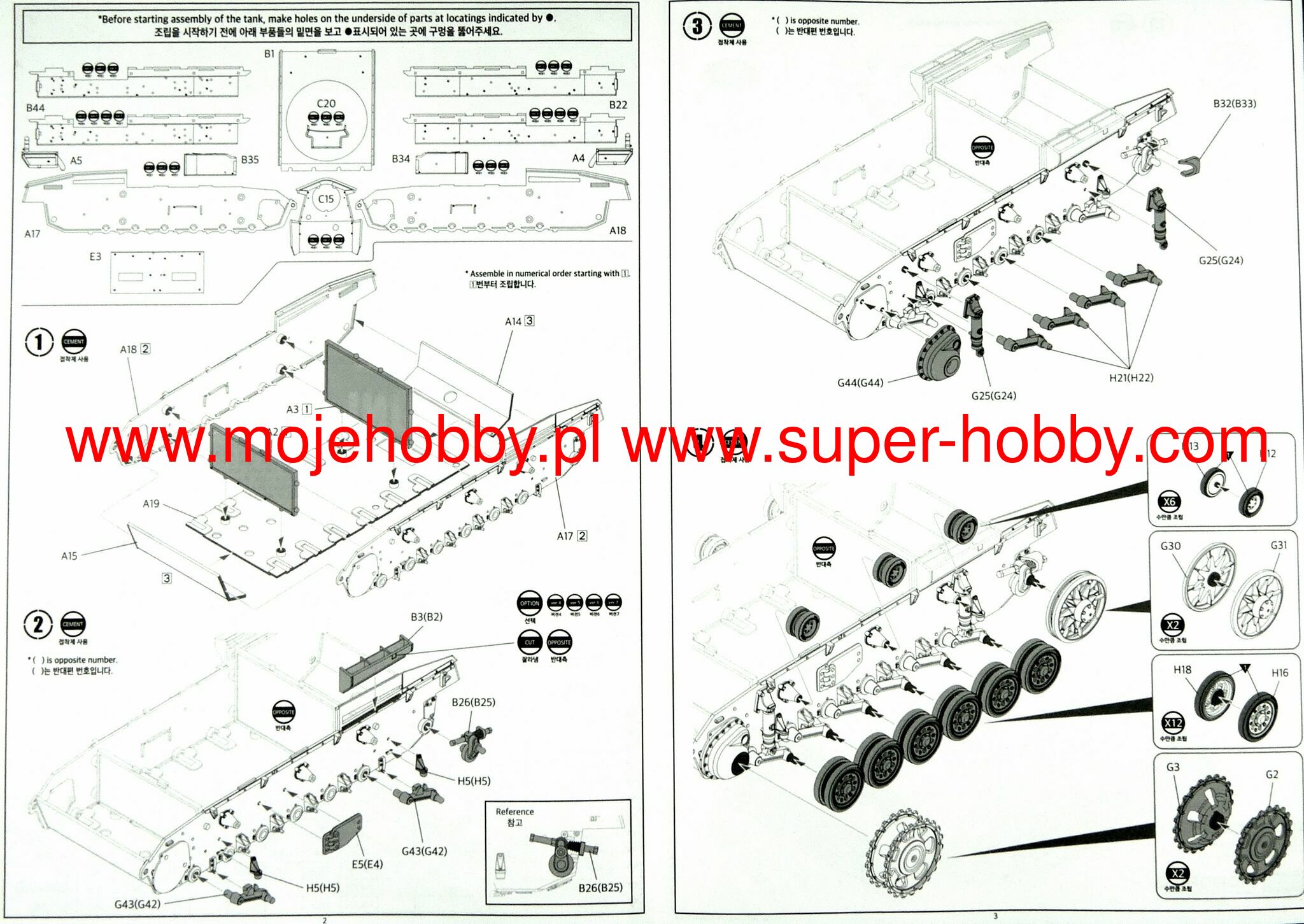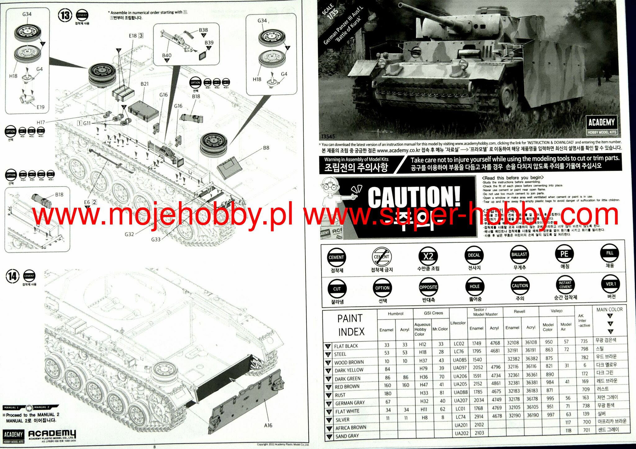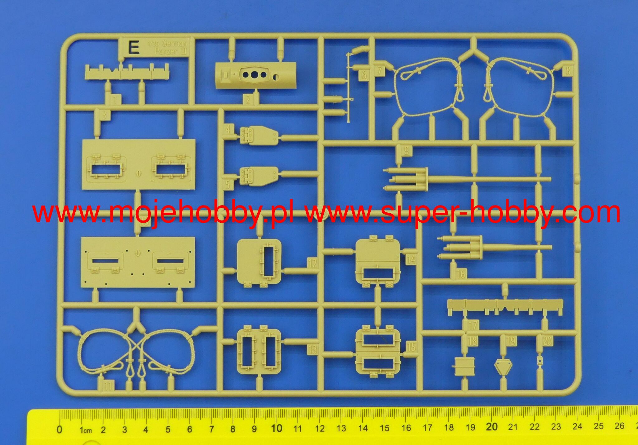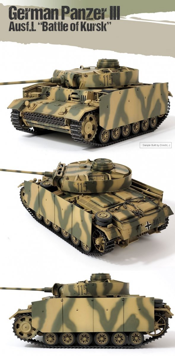 Описание Panzerkampfwagen III немецкий средний танк времён Второй мировой войны, серийно выпускавшийся с 1937 по 1943 год. Сокращёнными названиями этого танка являлись Pz.Kpfw.III, Panzer III, Pz.III. В ведомственном рубрикаторе военной техники нацистской Германии этот танк имел обозначение Sd.Kfz. 141 (Sonderkraftfahrzeug 141 машина специального назначения 141). В советских исторических документах и популярной литературе Pz.Kpfw.III именовался как Тип 3, Т-III или Т-3. Эти боевые машины использовались вермахтом с первого дня Второй мировой войны. Последние записи о боевом применении Pz.Kpfw.III в штатном составе подразделений вермахта датируются серединой 1944 года, одиночные танки воевали вплоть до капитуляции Германии. С середины 1941 по начало 1943 года Pz.Kpfw.III был основой бронетанковых войск вермахта (панцерваффе) и, несмотря на относительную слабость по сравнению с современными ему танками стран антигитлеровской коалиции, внёс значительный вклад в успехи вермахта того периода. Танки этого типа поставлялись армиям стран-союзников Германии по Оси. Захваченные Pz.Kpfw.III с хорошими результатами использовались Красной армией и союзниками. На базе Pz.Kpfw.III в Германии и СССР создавались самоходно-артиллерийские установки (САУ) различного назначения. Pz.III Ausf.L Появление следующего варианта Pz.III связано с попыткой установки на Ausf.J башни танка Pz.IV Ausf.G с длинноствольной 75-мм пушкой. Но башня от четвёрки в корпус тройки не совмещалась по ширине, поэтому стали выпускать новую серию танков с прежним вооружением. С июня по ноябрь 1942 года было изготовлено 519 танков модификации L. Танки получили модернизированную маск-установку, одновременно выполнявшую функцию противовеса 50-мм пушки. Лобовую броню вновь усилили 20-мм плитой, имевшей вырезы под приборы наблюдения механика-водителя и курсовой пулемёт. Были ликвидированы смотровой лючок заряжающего в бронировке пушки и смотровые щели в бортах башни. Масса танка возросла до 22,7 т. Машины, предназначавшиеся для Африканского корпуса, получили более мощную систему охлаждения двигателя. Кроме того, воздух для него поступал из боевого отделения через усиленные воздушные фильтры. Также было сокращено число люков в надмоторной крыше. Один Ausf.L в опытном порядке вооружили 50-мм противотанковой пушкой PaK 38. - Боковые экраны съемные - Полунаборные гусеницы - Семь маркировок на выбор - Сборка с открытыми или закрытыми люками