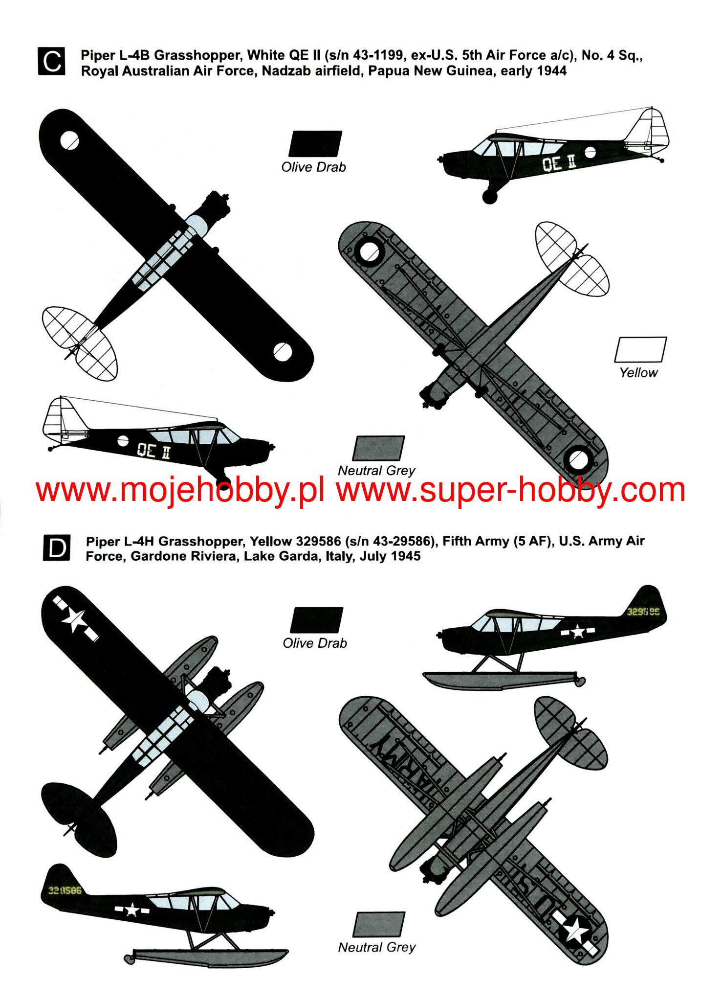 The Piper L4 (Piper Cub) is an American light transport and observation aircraft in the high wing configuration, with a mixed structure with a fixed landing gear and classic tail from the Second World War. The roots of the L4 go back to the civilian prototype called E-2, which first took to the air in September 1930, and which was mass-produced in the 1930s and received numerous development versions (including J-2, J-3 or J-5). In 1941, the J-3 version was adapted to the USAF's needs and designated the O-59, and eventually the L4. Several development versions were created, the first of which is the L4A, better adapted to the observation of the battlefield by increasing the cabin glazing. A lot of engines were used as the drive, including Continental A-65-8. The machine was widely used by the US Army in Europe as the basic liaison and battlefield observation aircraft. It was used both in North Africa and later in Italy and Normandy. The machine was nicknamed Grasshopper. About 20,000 were made of all versions of this plane! Specifications: length: 6.83m, wingspan: 10.74m, height: 2.03m, maximum speed: 140km / h, climb speed: 2.3m / s, practical ceiling: 3500m, maximum range: 354km.