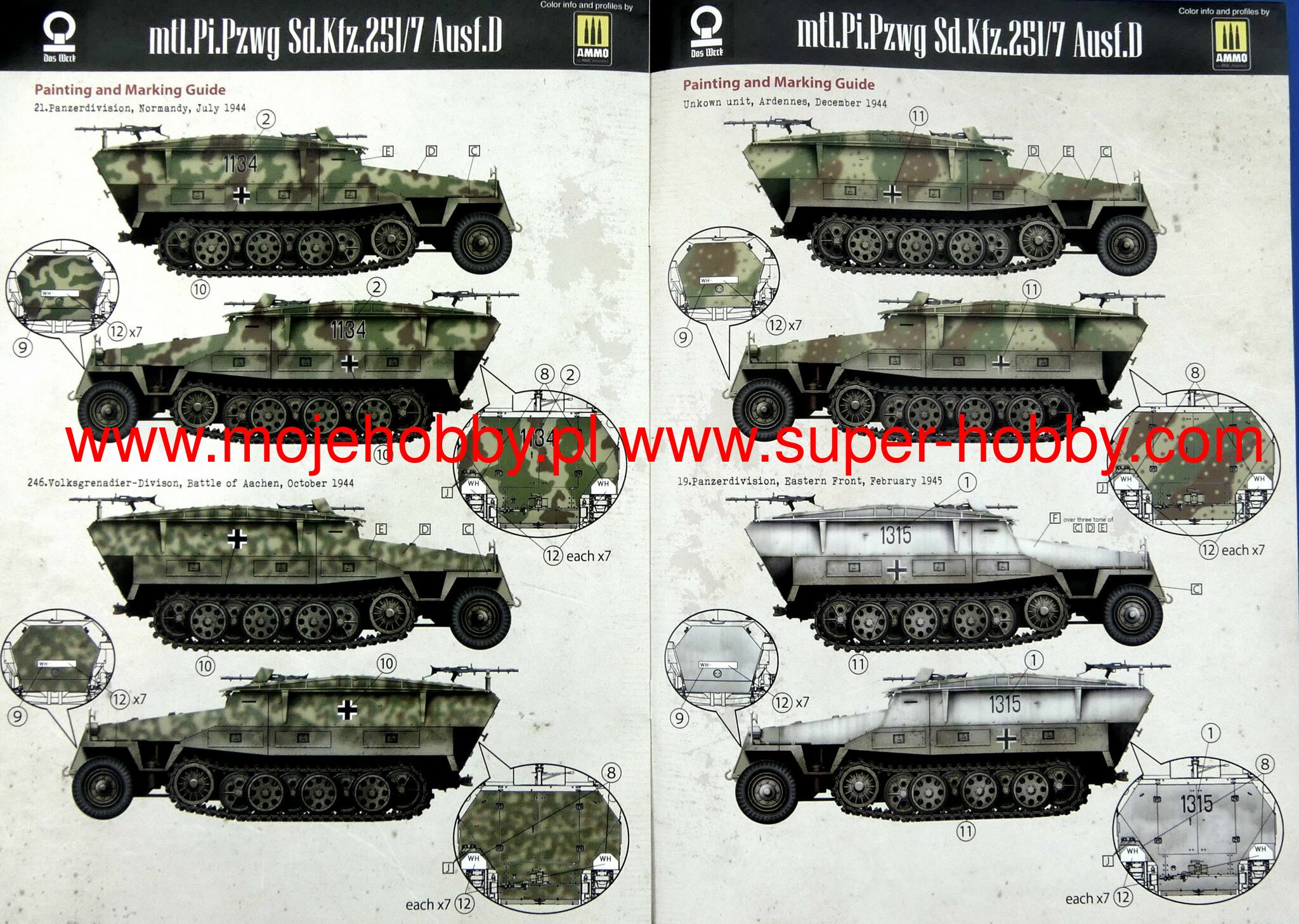 Sd.Kfz 251 was a German, medium, half-track armored transport from the Second World War. The first prototypes of the vehicle were made in 1935, and serial production continued in 1939-1945, ending with the production of about 14,500 units. The Sd.Kfz 251 was powered by a six-cylinder engine Maybach HL 42 TURKM with 100 hp . Sd.Kfz 251 was developed as a new, basic half-tracked transporter of the German armed forces. Its design was based on the Sd.Kfz.11 heavy tractor, with several elements changed in the adapted chassis: a new fuel tank was added, the location of the steering wheel, and the exhaust system was redesigned. In the course of serial production, four basic versions of the Sd.Kfz 251 (Ausf. A, B, C and D) were created, however, in terms of details related to the production process (especially the C version) and a slightly different arrangement of elements inside the fuselage. During World War II, more than 20 variants and versions of the Sd.Kfz 251 were created. The chronological first was the Sd.Kfz 251/1, which was the basic version, armed with two MG34 or MG42 machine guns and capable of carrying up to 10 landing troops. In 1941, a version of the Sd.Kfz 251/2 was developed, armed with an 80 mm mortar. There was also a version of the Sd.Kfz 251/3, which was a communication and radio communication vehicle with various sets of radio stations and antennas. In 1942, the Sd.Kfz 251/9 Stummel variant was developed, armed with a 75mm StuK 37 short-barrel gun. More interesting versions were the Sd.Kfz 251/16 with two flamethrowers or the Sd.Kfz 251/20 UHU equipped with an infrared radiation emitter and intended for targeting at night. Cars Sd.Kfz 251 of all versions served primarily in armored divisions and armored grenadiers on virtually all fronts of World War II: from the September campaign (1939), through the campaign in France (1940), fighting in the Balkans and North Africa (1941-1943) after fights on the Eastern (1941-1945) and Western (1944-1945) fronts.