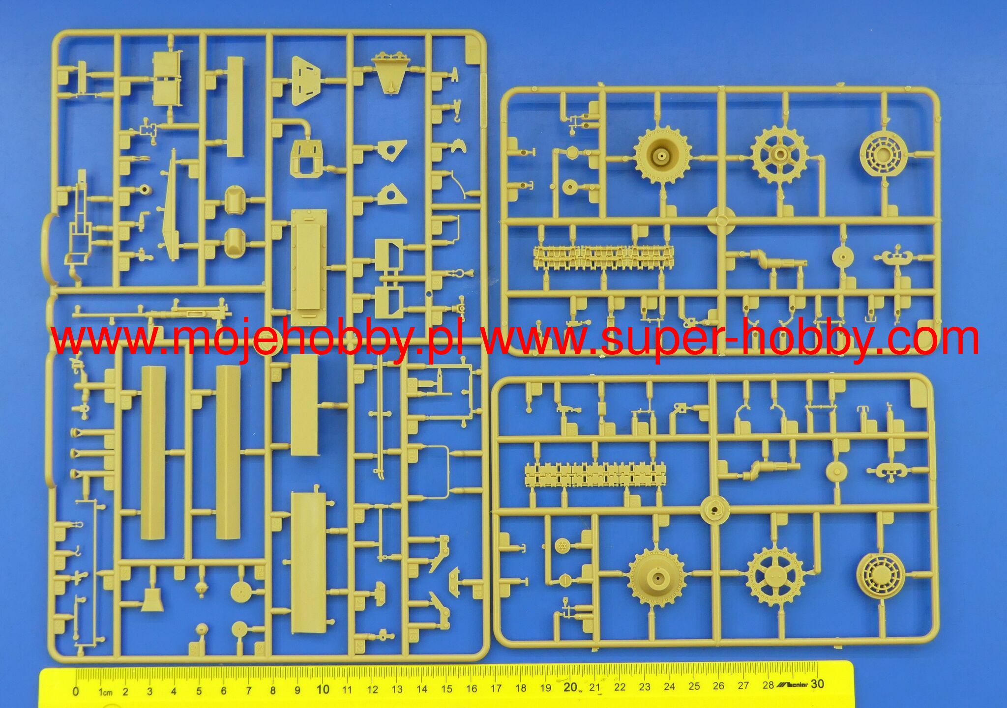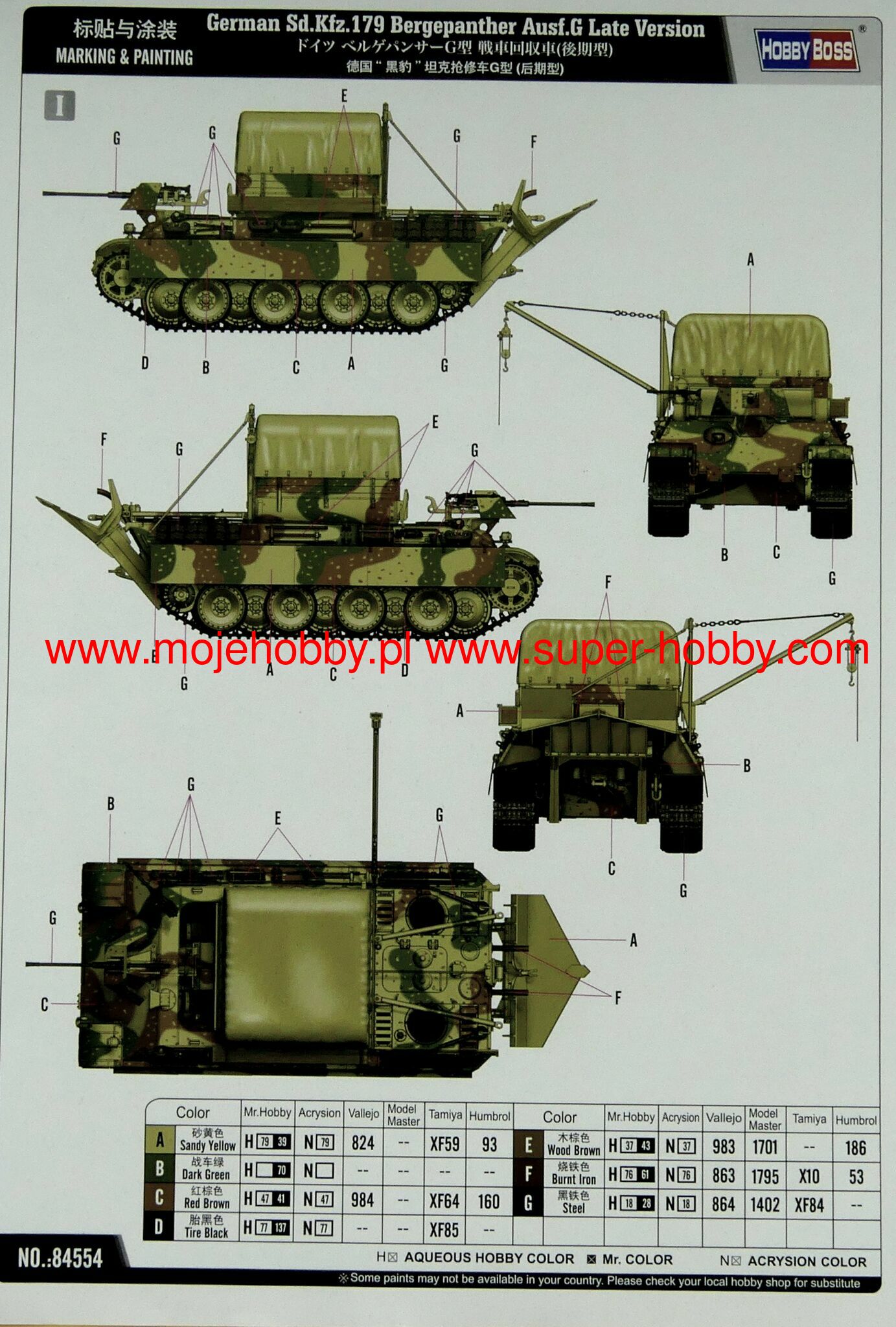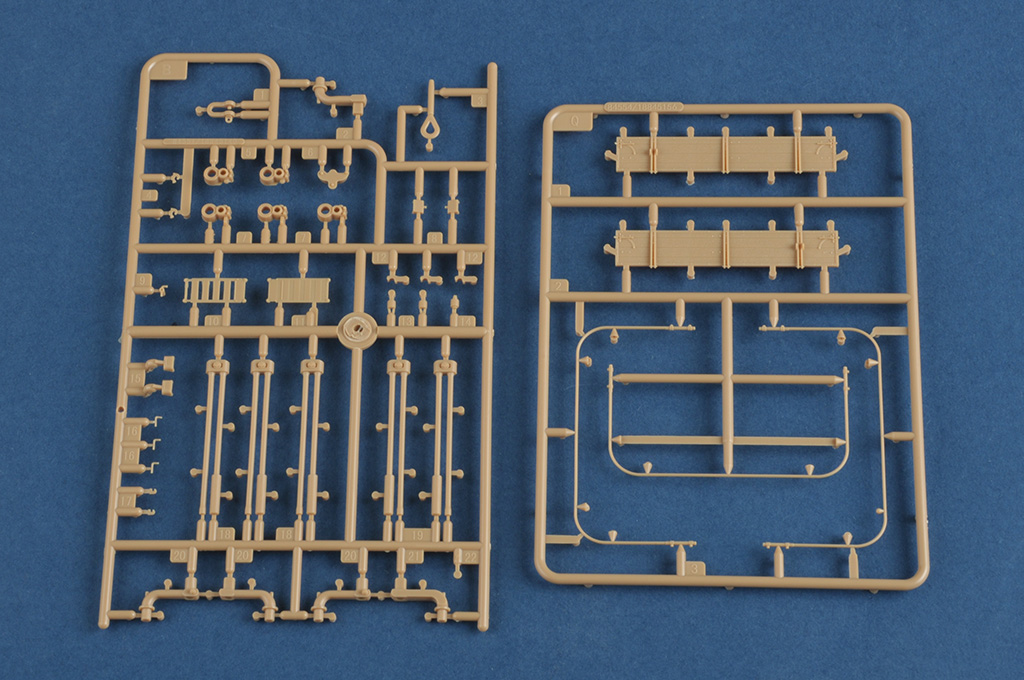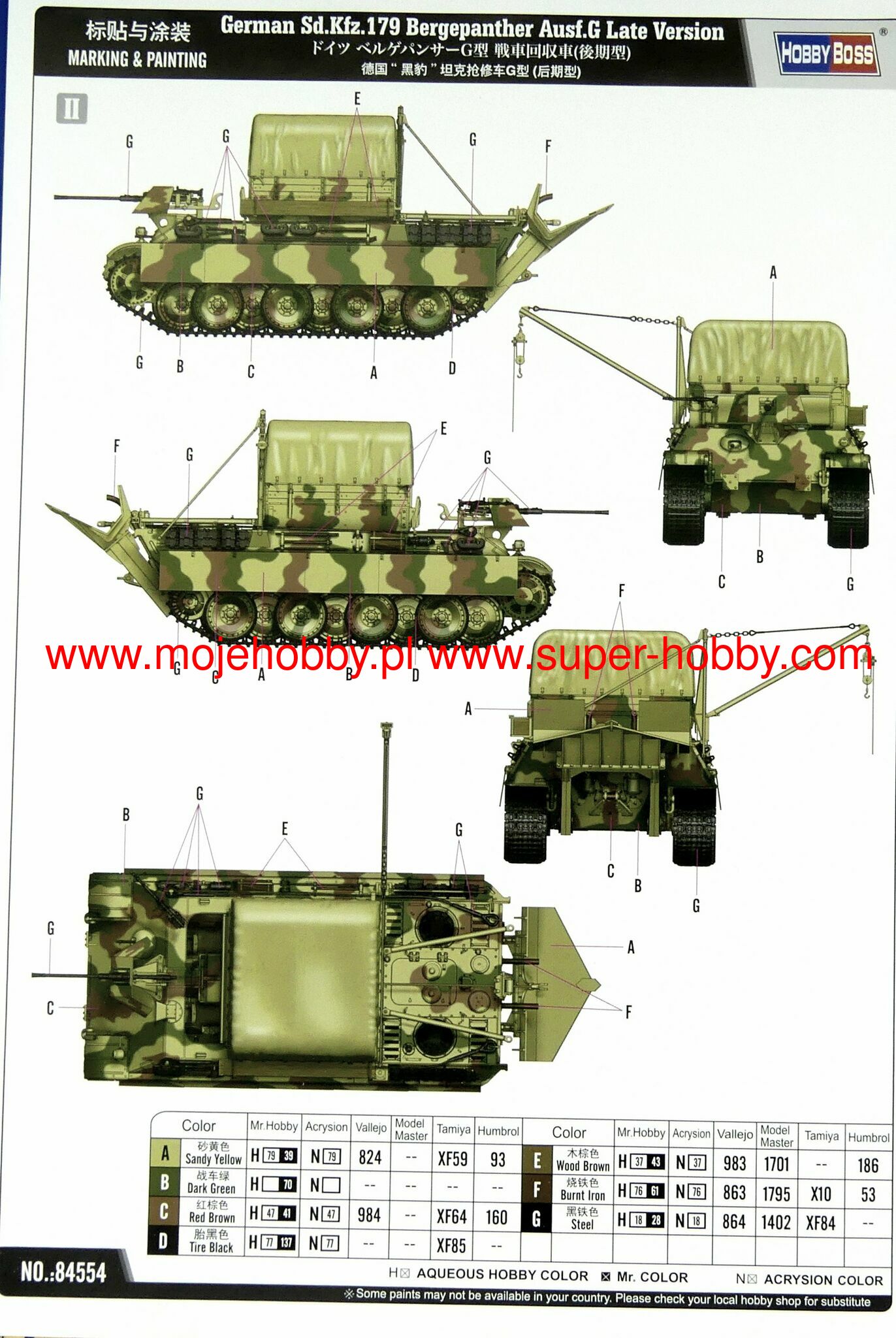 Описание Бергепантера (нем. Bergepanther), полное обозначение Бронированная ремонтно-эвакуационная машина „Пантера“ (нем. Bergepanzerwagen Panther) германская бронированная ремонтно-эвакуационная машина (БРЭМ) периода Второй мировой войны. По германской ведомственной системе обозначений военной техники машина носила индекс Sd.Kfz.179. Была создана в мартеиюне 1943 года на шасси среднего танка Pz.Kpfw.V Пантера и предназначалась для эвакуации бронемашин тяжёлого класса, таких как сама Пантера и Тигр. В ходе серийного производства, продолжавшегося с июня 1943 и до февраля или апреля 1945 года было выпущено, по разным данным, от 290 до 347 Бергепантер, применявшихся германскими войсками на всех фронтах, где действовали тяжёлые бронемашины. После войны некоторое число БРЭМ этого типа использовалось армиями Чехословакии и Франции. Bergepanther Ausf.G В октябре 1944 года DEMAG перешла к производству усовершенствованной модификации Бергепантеры, Ausf.G (номера шасси с 175664). Различные источники приводят противоречивые данные относительно этого варианта: по одним, Бергепантеры Ausf.G базировались на шасси Пантер той же модификации, по другим же, несмотря на это совпадение, модификации БРЭМ и базового танка не были связаны, а шасси Пантеры Ausf.G начало использоваться БРЭМ независимо, с октября 1944 года. Специально для Бергепантер этой модификации были созданы: изменённый корпус с укладками оборудования, система вентиляции трансмиссии и тормозов, выхлопные трубы, топливные баки, воздушные фильтры, электрооборудование, установка радиостанции и внешние крепления для оборудования. В остальном компоненты шасси были взаимозаменяемы с базовым танком, а ремонтно-эвакуационное оборудование не изменилось по сравнению с Ausf.A, за исключением переноса кронштейнов крана с бортовых листов на крышу моторного отделения, однако предусмотренная проектом 20-мм пушка была ликвидирована ещё в ходе производства Ausf.A. Бергепантеры Ausf.G сменили Ausf.A на сборочных линиях, по одним данным, в сентябре, по другим в октябре или ноябре 1944 года. Согласно разным источникам, производство Ausf.G на DEMAG продолжалось до февраля 1945 года с выпуском 107 машин этой модификации или же до апреля, но с выпуском лишь 45 БРЭМ. Общие же данные по выпуску Бергепантер варьируются от 290 (не считая переоборудованных) до 297 БРЭМ или 347 новых и переоборудованных машин. В ходе серийного производства в конструкцию Бергепантер вносились как общие для шасси Пантеры доработки, так и ряд специфических для БРЭМ: перенос установок зенитных пулемётов на кожухи перископов, введение креплений для крана и деревянных брусьев, кронштейнов для жёсткой буксировочной сцепки на корме, поворотной рамы для тента над отделением управления, переделка центрального кормового буксировочного кронштейна, увеличение сошника, а также различные изменения в укладках оборудования. Длина: 256,9 мм Ширина: 165,7 мм Всего пластиковых деталей 1300+ Всего 23 литника, верх корпуса и низ корпуса Металлические детали - трос, цепь Фототравление 2 рамки