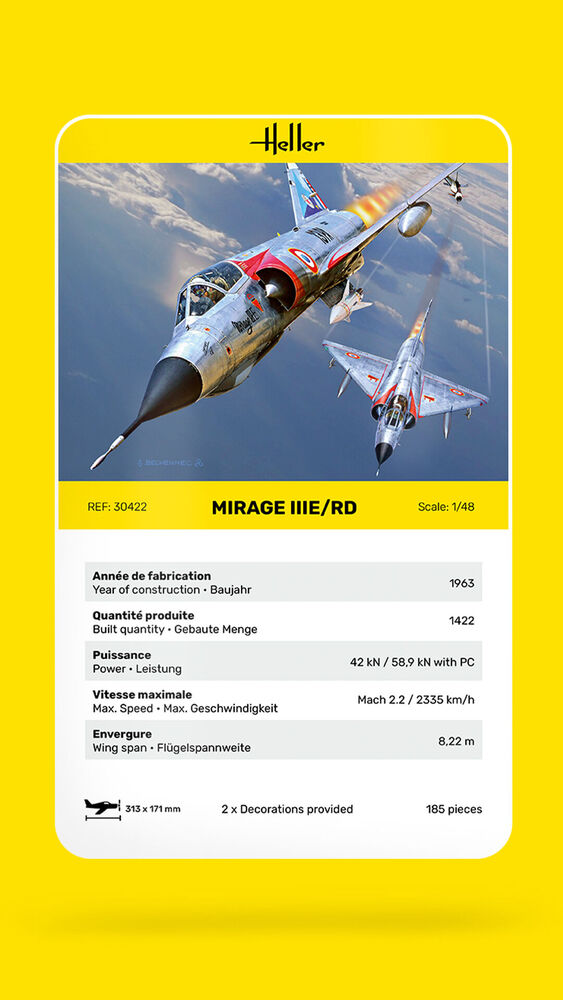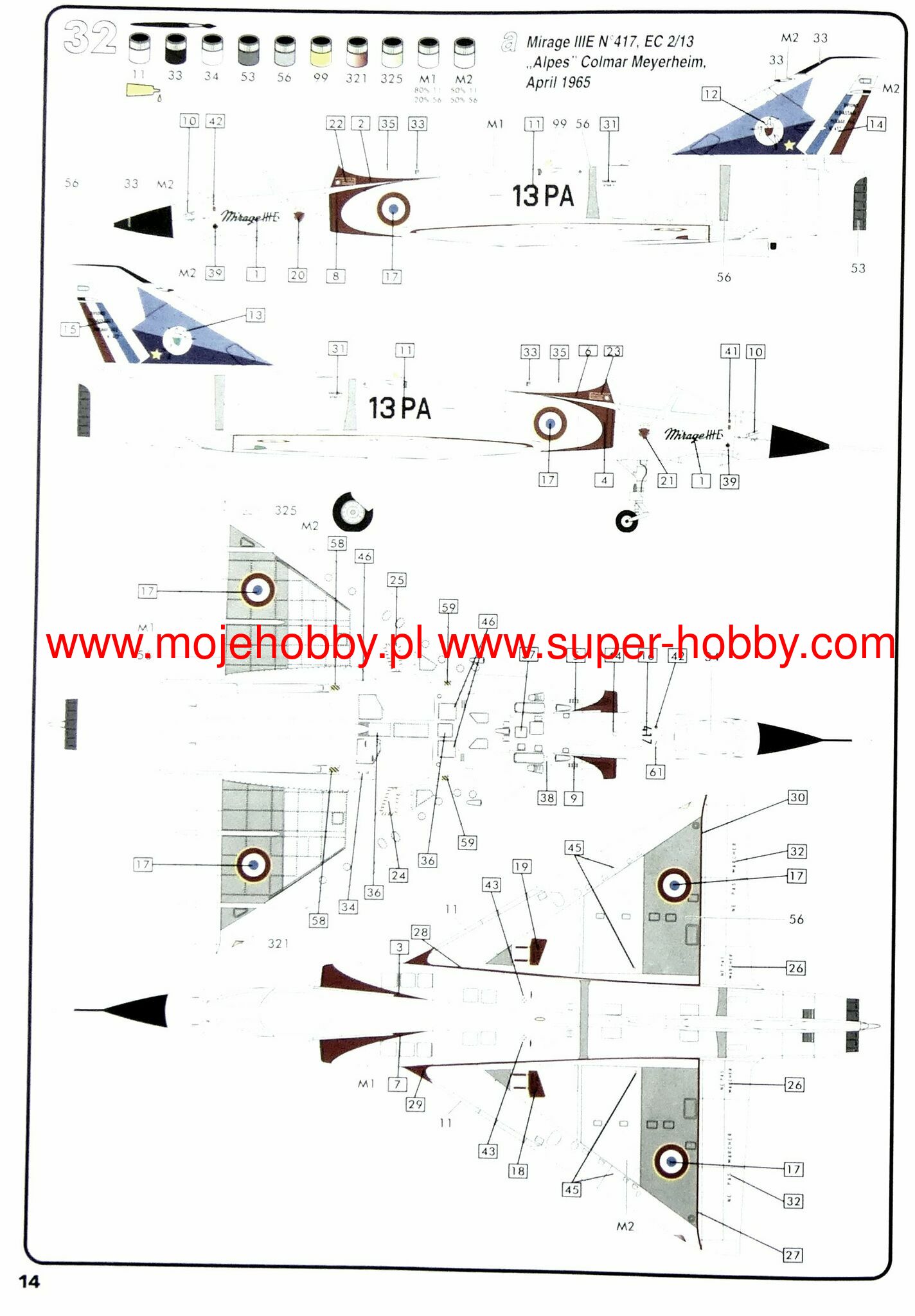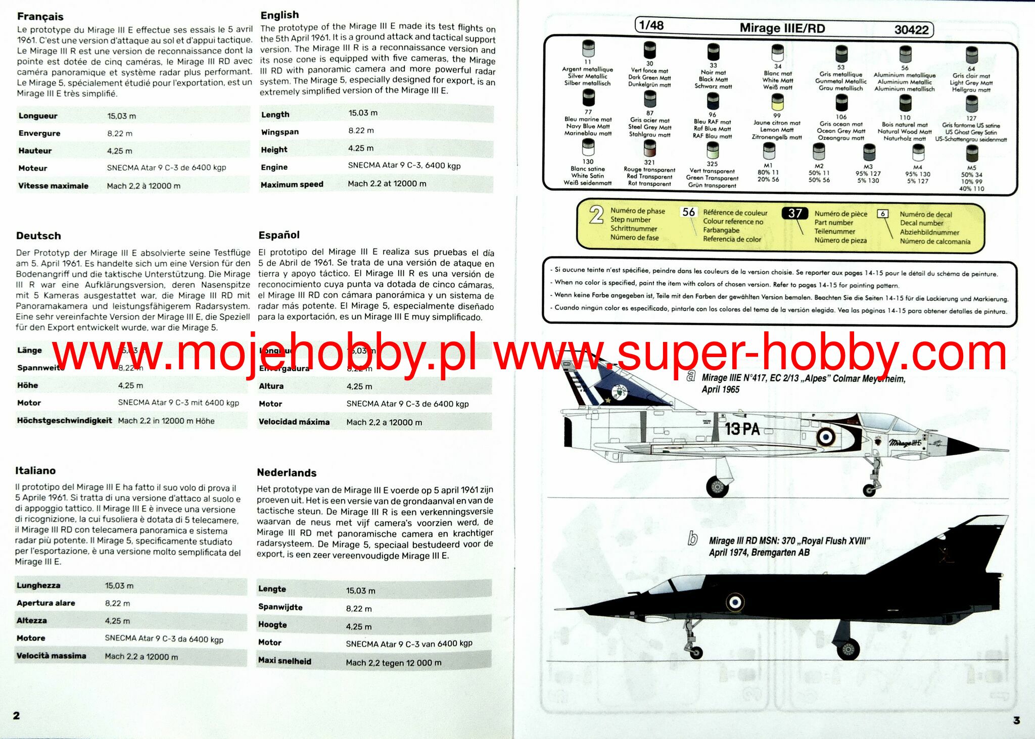 The Dassault Mirage III / 5/50 is a French single-engine fighter-attack aircraft with a delta-shaped lobe, without horizontal tail. In late 1955, Dassault began building a single prototype that retained the delta wing and an enlarged fuselage that could accommodate one SNECMA Atar 101G1 engine. The resulting Mirage III-001 was flown on November 17, 1956, to reach a flight speed of 1.52Ma after just two months. The use of manually controlled cones in fixed side inlets and the Atar 101G2 engine with thrust increased to 4490 kg, allowed to increase the speed to 1.65Ma, and then by using the SERP rocket accelerator - to 1.8Ma. To achieve the highest speed, Dassault modified the wing and after the first flight on May 12, 1958, Mirage IIIA reached the speed of 2.2Ma with an additional rocket engine. This led to the launch of production of the two-seater training version with tandem seats - the Mirage IIIB and the single-seat interceptor Mirage IIIC. The latter version had a built-in Cyrano AI radar, and two 30mm cannons could be supported by Matra R.530 or AIM-9 Sidewinder air-to-air missiles. The next important version was the long-range Mirage IIIE fighter-bomber, with the Atar 9C engine built into a slightly extended hull. This version was equipped with the Cyrano II radar, which, in combination with the Doppler radar and the TACAN navigation system, made it possible to conduct an attack at low altitude without the target's visibility in all weather conditions. Modification programs Mirage III (and derivatives V and 50) include the installation of modern navigation systems, weapons control and adaptation to modern types of weapons. The second area of modification is the installation of Atar 9K-50 engines with a thrust greater by about 20%, adaptation to centralized refueling under pressure and refueling during the flight, installation of zero-zero class catapult seats, improved visibility from the cabin, installation of front control surfaces increasing maneuverability in air combat, adaptation to carrying containers, e.g. for electronic warfare, laser target marking, recognition or infrared imaging of targets. Technical data (version IIIC): length: 14.77m, wingspan: 8.22m, height: 4.25m, maximum speed: 2.2Ma, climb speed: 83m / s, maximum range (with additional tanks): 4000km, maximum ceiling 17000m, equipment: fixed - two 30mm DEFA 552 cannons, suspended (Mirage 5) - up to 4200 kg of cargo.