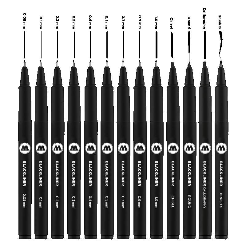 Описание Набор линеров Molotow BLACKLINER Complete Set содержит всю линейку из 13 линеров включая, линеры со специальными наконечниками скошенный, круглый, каллиграфический и Кисть S. Они идеально подходят для леттеринга, каллиграфии и комиксов и контуров для скетчей. С этим набором у вас все под контролем. Линеры MOLOTOW ™ BLACKLINER является первым продуктом, разработанным совместно с Schneider Schreibgeräte GmbH. Для набросков, в школе, для контуров или в качестве ручек для письма линеры BLACKLINER имеют архивные чернила на водной основе, водо- и химически стойкие и устойчивые к размазыванию с помощью водно-спиртовой технологии. Корпус линеров BLACKLINER имеют нескользящую матовую поверхность.