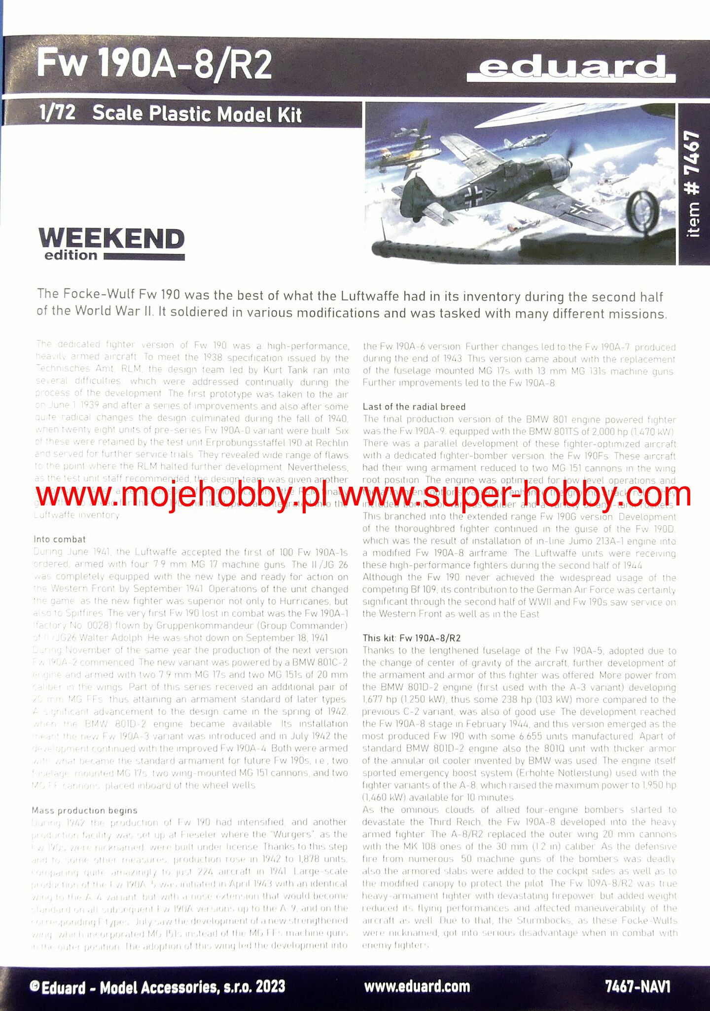 Дополнительная информация Комплект Weekend edition немецкого тяжелого двухмоторного истребителя Fw 190A-8/ R2 времен Второй мировой войны в масштабе 1/72.
