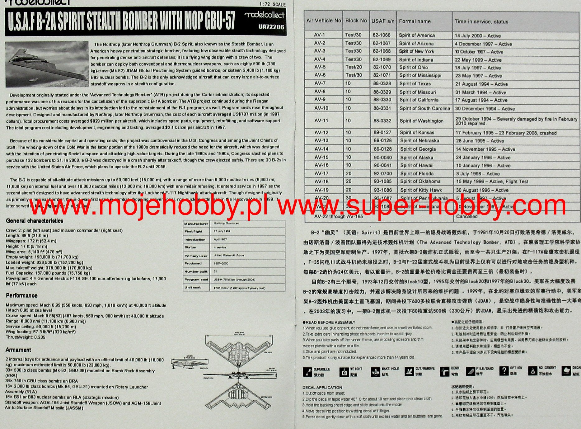 In June 1977, US President Jimmy Carter decided to suspend the construction program of the new B-1A strategic bomber. This meant that the B-52, with almost twenty years of service behind it, would remain the basic type of American aircraft for many years to come. Meanwhile, the USAF decided to start work on a new bomber based on completely new technologies (ATB - Advanced Technology Bomber). Its main advantage in the confrontation with the Soviet anti-aircraft defense system was to be the feature of "invisibility" or, in other words, low observability of the aircraft for radar devices. The first work on the ATB bomber was carried out in 1978. The main contractor for the ATB project was the Northrop / Boeing team, in which Northrop played a leading role, while Boeing became the main cooperator. The design of the ATB aircraft was based on the strict requirements for long range, high armament load and, of course, low level of observability. Like any of the stealth aircraft construction programs, the ATB program was top secret. From unconfirmed sources it appears that the piloted B-2 model took off for the first flight in mid-1989. The fact is, however, that this structure in the 1: 1 scale was built using only model tests (without building a mock-up of the aircraft) and with a very wide the use of computer aided design. The B-2 plane was designed with unprecedented accuracy of reproducing its geometry. One of the most difficult problems that was solved was the creation of a three-dimensional database for mapping the body of the aircraft. However, this problem was resolved and the B-2 is the world's first aircraft of this size and complexity to be built without the need to build a dummy. During the development of the aircraft, almost 900 new materials and technological processes were patented. In summary, the work on the B-2 became an impulse for the development of new design and construction techniques. Originally, the USAF expressed an interest in purchasing 132 copies, of which 120 were designed to carry nuclear weapons. However, the rapidly changing political and economic situation in the world (the collapse of the USSR) resulted in the reduction of orders to 21 units. The B-2 is a two or three seater (depending on the difficulty of the planned missions) strategic bomber, built in a flying wing configuration. The plane forms a wing with no fins understood in the classical sense. The airframe consists of practically four main parts: a center wing, two attachable wings (caisson structure) and a center wing segment being its stern part. The center wing, resembling a trapezoidal box, houses the weapons compartments, four engine nacelles, landing gear compartments, equipment and a crew cabin for three people. In the upper part there are air inlets, shifted back to the leading edge. The airfoil is equipped with multi-part moving surfaces located on the zigzag trailing edge and acts as controls (height and direction), ailerons and flaps. The two surfaces attached to the wing consoles are divided horizontally into two segments (upper and lower) each. They spread out to play the role of the rudder (with asymmetrical spreading of both consoles) or of air brakes (with symmetrical spreading). The movable control surfaces take up about 15% of the total lift area of the aircraft (69.675 m2, for comparison the maximum lifting area of the Su-22M4 aircraft is 38.49 m2). The basic construction materials of the airframe are composites, mainly - epoxy-carbon and epoxy-aramid (kevlar). Honeycomb structures have been widely used for the covering and internal components of the structure. The surface of the plane was covered with a special varnish that disperses radar radiation. Three-support chassis with front support point; main - bogie, pulled up towards the plane of symmetry of the plane, front - two-wheeled, pulled to the rear. The aircraft is propelled by four General Electric F118-GE-110 two-flow jet engines without afterburners with a thrust of 4 x 84.50 kN. They are located inside the lobe, in its upper part. The exhaust nozzles are located above a relatively large surface, and the exhaust gases are cooled by a stream of cold air, which allows to reduce the thermal signal and noise of the drive units. It is possible to install a special device for mixing exhaust gases with fluorosulfuric acid in order to prevent the formation of visible condensation streaks when flying at high altitude. The plane is equipped with a digital control system with a four-time reservation. In addition to the basic tasks performed by classic control systems, it effectively reduces operational overload (by changing the load distribution) and gusts, improving flight comfort and safety at low altitude. This system is most likely adapted to automatic flight stabilization in the event of engine failure (thrust asymmetry) or other types of damage, e.g. mechanical airframe (overshoot, etc.). Western sources say that the B-2 has a maneuverability not inferior to that of fighter planes. Stealth properties were achieved by adopting a flying wing system, curvilinear shapes, the use of RAM (electromagnetic energy absorbing) materials and appropriate structures that absorb or scatter radar radiation. The outline of the plane in the top view consists of twelve straight lines directed in strictly defined directions. The curvilinear contour of the airframe, from the canopy to the air inlets, is shaped by the same set of rules. RAM materials were used for the leading edges of the airfoil and the wing tips, and in the brackets inside each inlet. Probably most of the plane's surface is covered with honeycomb structures that absorb (scatter) radar waves and a varnish containing heavy absorbents. Additionally, the B-2 is made almost entirely of composite materials. Due to the applied solutions, the radar station with typical wavelengths detects the plane flying towards the station from a distance of approx. 20 km. For comparison, the same station