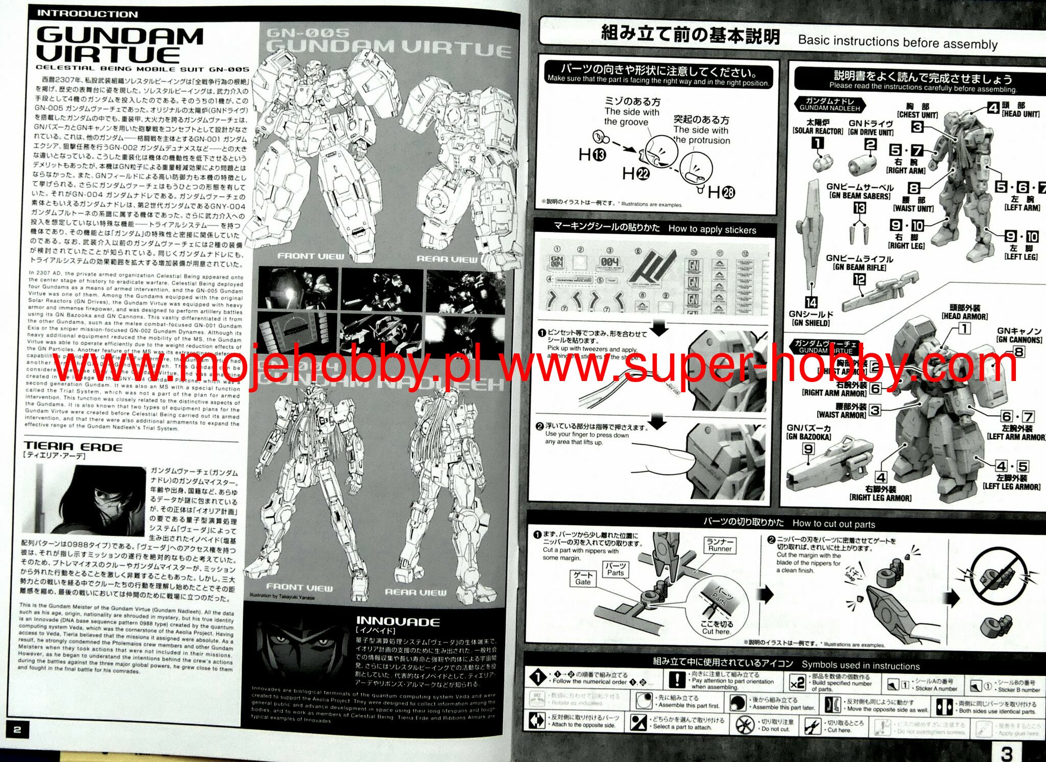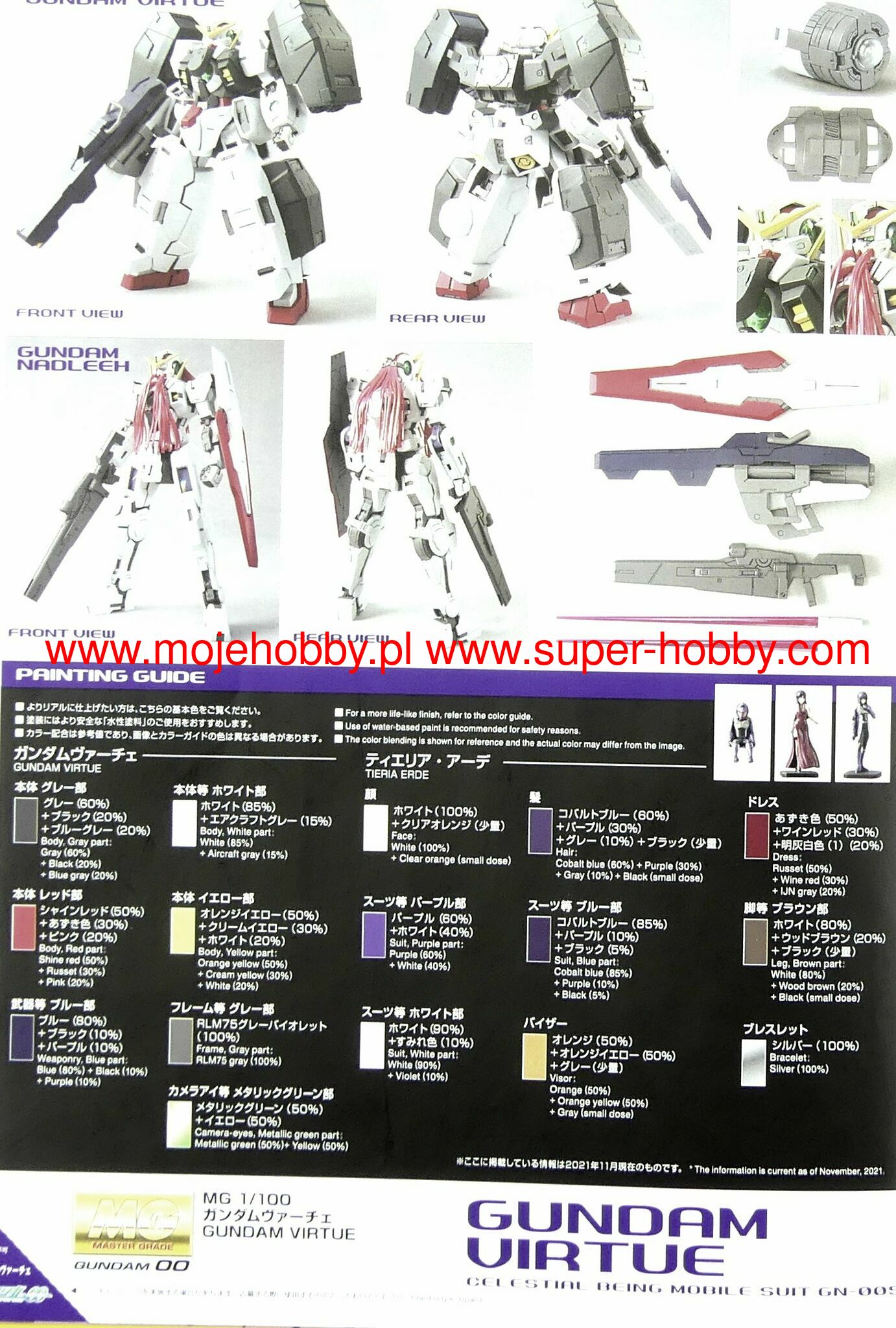 MG - Master Grade The next level is designated as Master Grade, production of which began in 1995. And it is only offered in 1:100 scale. This series is made of the highest quality plastic. These models have many more elements than the other series, which is why the model is more complicated and its assembly takes a long time. The MG series models have the greatest possible range of motion (e.g. movable fingers) compared to the lower series due to the internal skeleton. High quality translates into an amazing look and attention to detail, but nothing stands in the way of using paints to enhance the model. Assembly Difficulty: Hard Number of elements: over 250+ Size: 18cm Contents of the package GUNPLA Model Assembly instructions Short instruction manual in Polish stand* Stickers to enhance the model *Not all models include a stand Special features of the MG series: Scale 1/100, model size 180 mm, more than 260 elements to assemble, difficult level.
