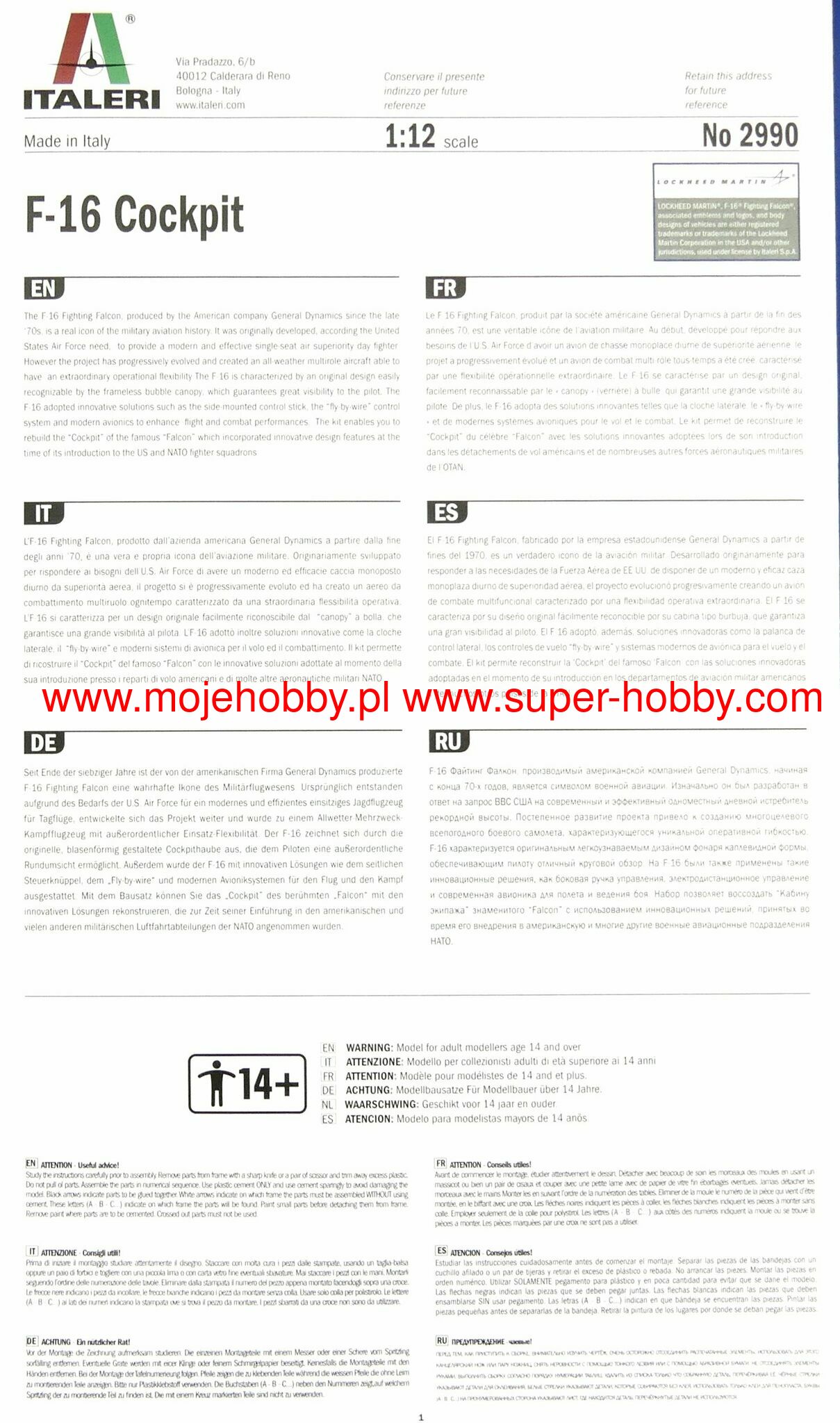 The F-16 Fighting Falcon, produced by the American company General Dynamics since the late '70s, is a real icon of the military aviation history. It was originally developed, according the United States Air Force need, to provide a modern and effective single-seat air superiority day fighter. However the project has progressively evolved and created an all-weather multirole aircraft able to have an extraordinary operational flexibility The F-16 is characterized by an original design easily recognizable by the frameless bubble canopy, which guarantees great visibility to the pilot. The F-16 adopted innovative solutions such as the side-mounted control stick, the "fly-by-wire" control system and modern avionics to enhance flight and combat performances. The kit enables you to rebuild the "Cockpit" of the famous "Falcon" which incorporated innovative design features at the time of its introduction to the US and NATO fighter squadrons.