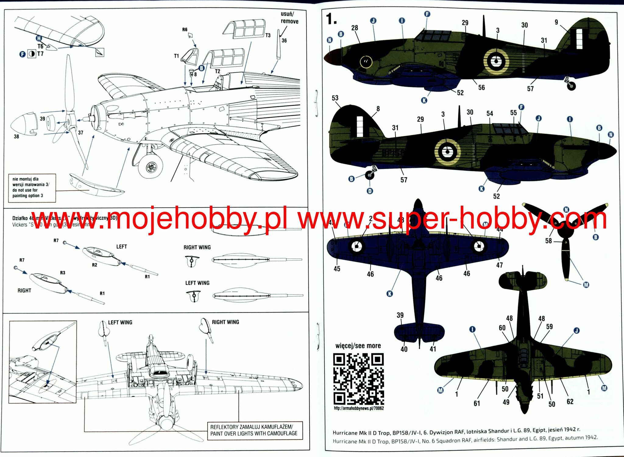 The Hawker Hurricane is a British single-engine single-engine fighter with a metal structure with canvas elements from the Second World War. Acting on all fronts during the Second World War, the Hawker Hurricane earned the name of one of the best and most ubiquitous airplanes of that time, both as a fighter and an attack plane. Undoubtedly, however, the most significant card in the history of this machine was its contribution to the victory of the British in the Battle of Britain in 1940. The plane constructed by Sydney Camm at the request of the Ministry of Defense was supposed to become the main force of the British air fleet. For the first time, a prototype of an aircraft powered by a Rolls-Royce Merlin Mk.II engine took off on November 6, 1935, piloted by Georg Bulman. The tests were excellent and it was quickly decided to order 600 machines, the first of which entered service with the 111th squadron of the RAF in December 1937. When Great Britain declared war on Nazi Germany on September 3, 1939, the RAF had 19 ready-to-fight Hurricane squadrons, which started their military career with operations in France and Norway. During the course of the war, several versions of this very successful plane were created. The first mass-produced version was the Mk.I with the Merlin III engine. From 1940, the Mk.II versions with the new Merlin XX engine with a capacity of 1280 HP began to be delivered to the units. It was this version, as the first variant of Hurricane, that performed primarily assault and battlefield support tasks. Its best variant was the Hurricane Mk.IID, used by min. in the North Africa campaign in 1942. The third version is the Hurricane Mk.IV with the new Merlin 24/27 engine, 1620HP. It served as an assault machine armed with bombs, unguided missiles and Vickers S cannons until 1944. A sea variant (Sea Hurricane) was also produced, which served on aircraft carriers and on specially adapted merchant ships (Sea Hurricane Mk.IA). Technical data (Mk.IIC version): length: 9.84m, wingspan: 12.19m, height: 4m, maximum speed: 547km / h, rate of climb: 14.1m / s, maximum range: 965km, maximum ceiling 10,970m Armament: fixed - 4 20mm Hispano Mk.II cannons, sling - up to 460 kg of bombs.