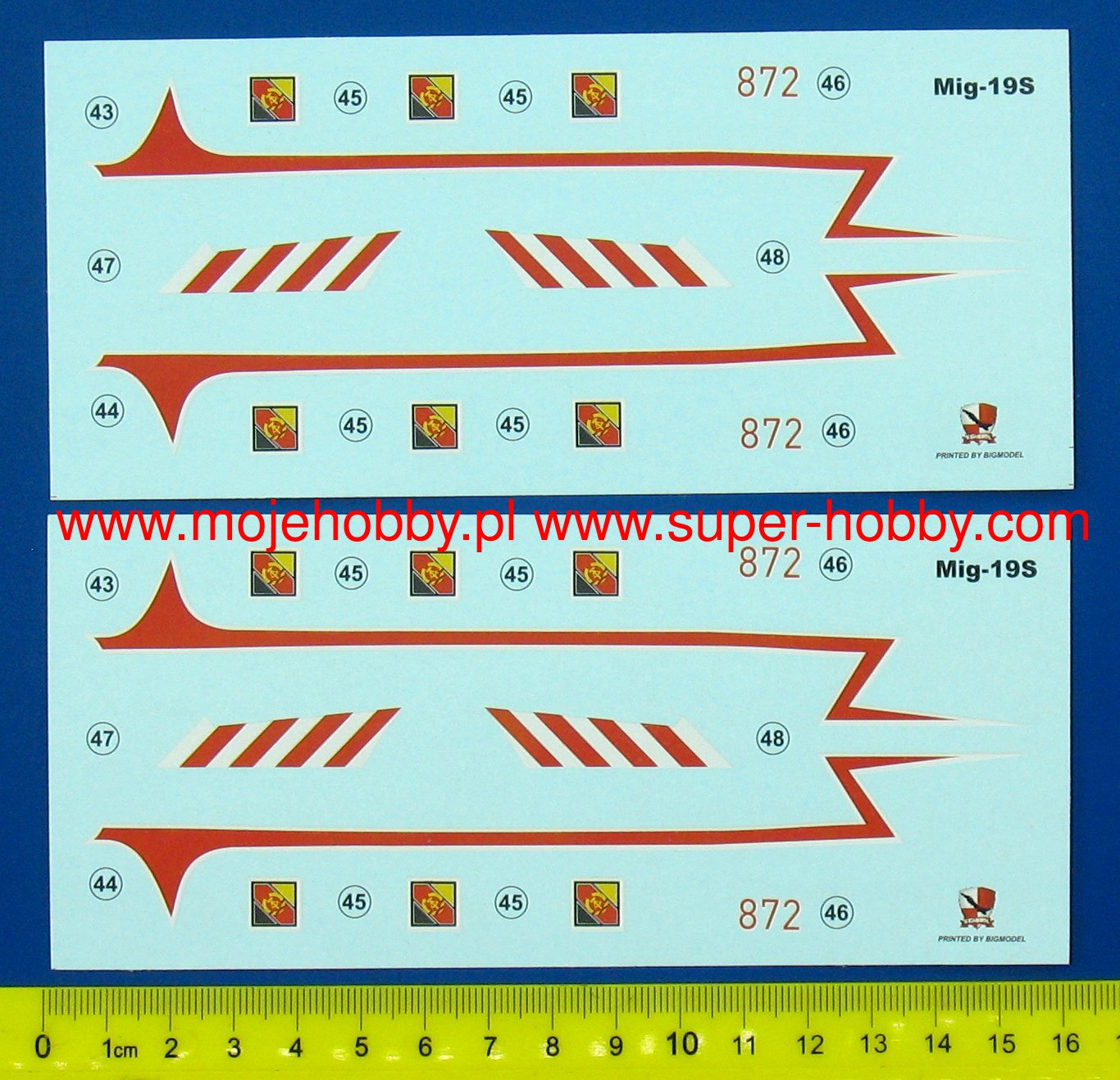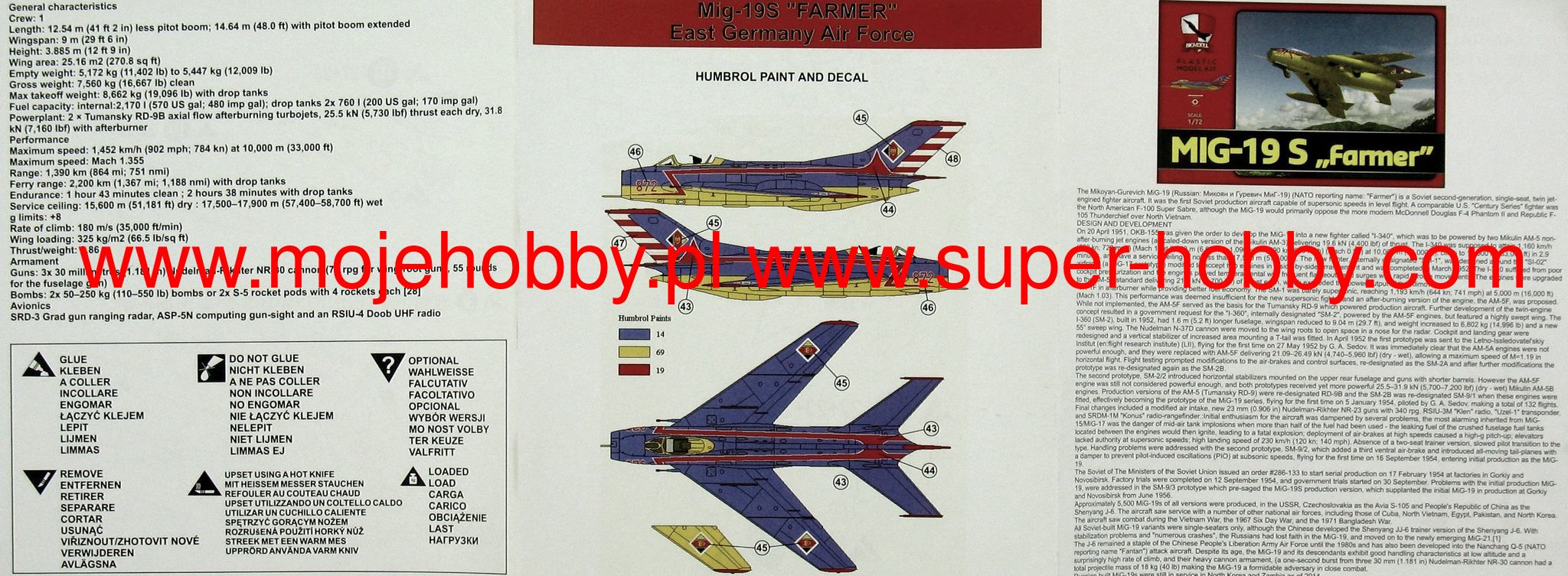 The Mikojan-Guriewicz MIG-19 built in the early 1950s was the first mass-produced supersonic fighter plane. The experience gained in the design and implementation of new technologies in this aircraft has greatly helped the constructors in the construction of the next versions of the MiG aircraft. The MiG-19 in serial production was marked with the symbol SM. The SM-9/1, flown on January 5, 1954, became a direct model for the serial MiG-19. The plane did not yet have a plate horizontal tail. Therefore, the first series of MiG-19 planes had a classic tail. The MiG-19 flight tests with a plate tail continued throughout 1955. Soon after, the serial production of the MiG-19S aircraft, derived from the SM-9/3 prototype, began. Airplanes for various purposes come directly from it. Built in 1956, the MiG-19SW high-altitude fighter. MiG-19R reconnaissance aircraft and a short series of MiG-19SF aircraft reaching speeds of 1560 km / h. The second development line consists of airplanes built on the basis of the SM-7 prototype, equipped with the RP-5 radar on-board station. New interceptors have been developed. The SM-7/2 prototype turned into the MiG-19P aircraft, then the MiG-19PF and the MiG-19PG with the "Gorizont-1" station were built (it was used to guide the aircraft at the target according to the ground command point). In a short series, the MiG-19PU plane with additional rocket accelerators was built. The SM-7 / 2M prototype, equipped with the RP-2U radar station and armed with 4 RS-2U (K-5) guided missiles, was manufactured under the designation MiG-19PM. A variant of the MiG-19PM aircraft was equipped with the MiG-19PMŁ telemetry device "Łazur". MiG-19 planes were used in the Warsaw Pact countries: the USSR, Bulgaria, Czechoslovakia, East Germany, Poland, Romania and Hungary, as well as in China, Egypt, Indonesia, Iraq, Pakistan, Syria and Cuba. The production of the aircraft was started in Czechoslovakia (MiG-19S as S-105) and in China, where the planes were initially produced under the license under the designation J-6, and then their own designs were developed on their basis. Technical data: length: 12.54m, wingspan: 9m, height: 3.9m, maximum speed: 1455km / h, speed of climb: 180m / s, maximum range: 1390km, maximum ceiling 17500m, armament: permanent - 3 cannons NR -30 caliber 30 mm, suspended - the most common were 4 Vympel K-13 air-to-air missiles.