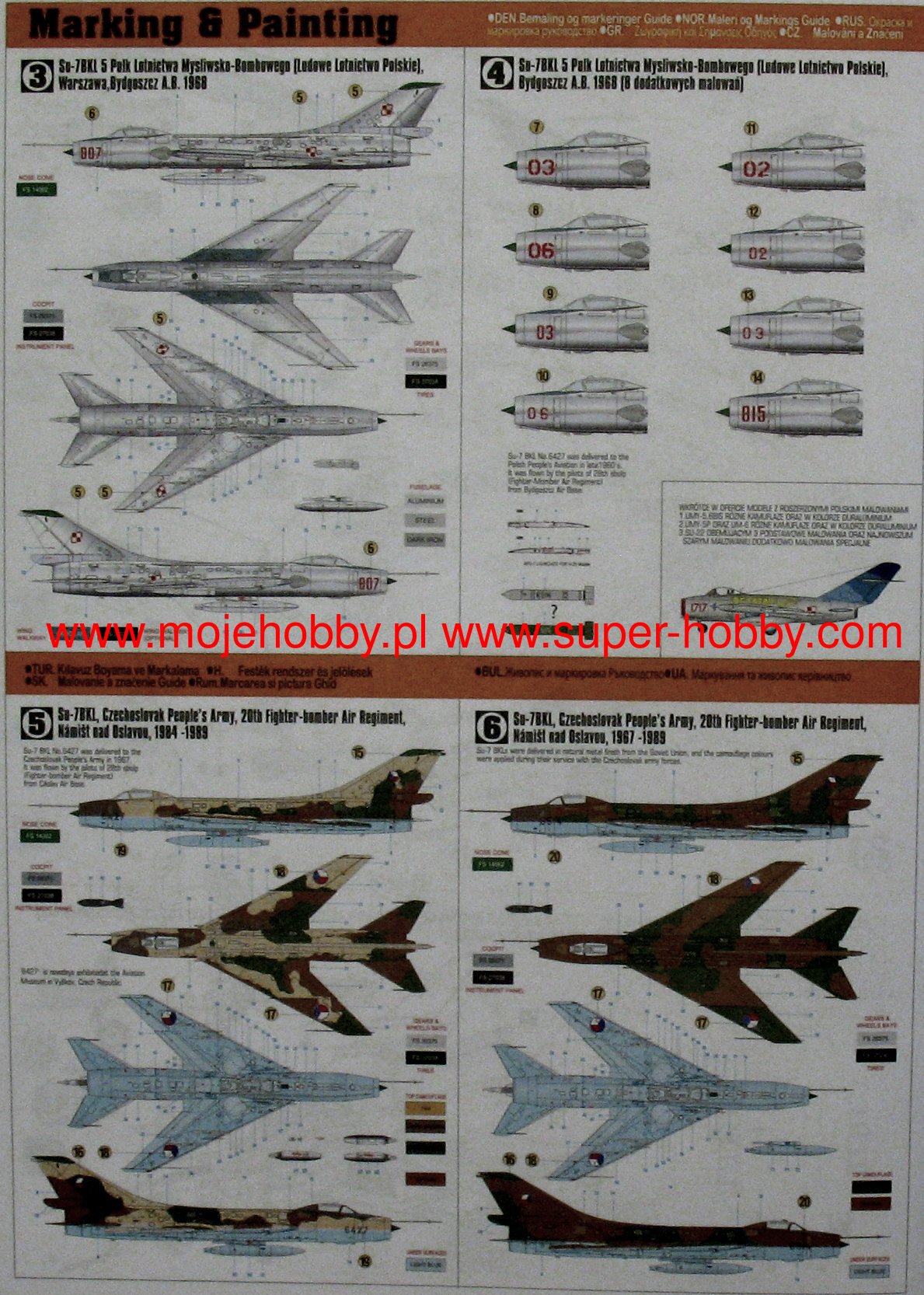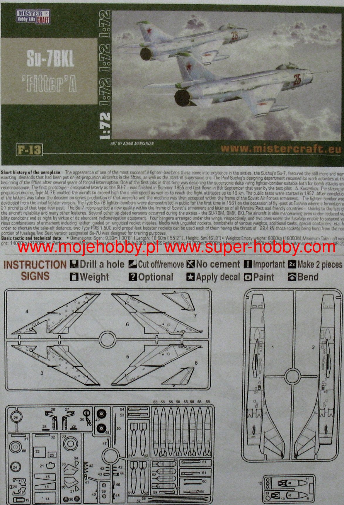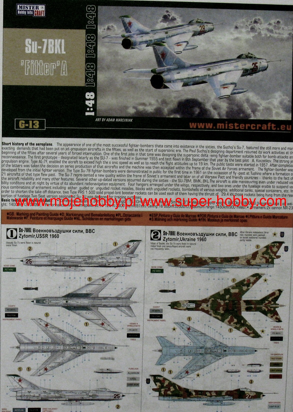 Note: Comany Mistercraft frequently changes, without any notice, the decals that come with the model, so they may differ from the photos and descriptions on our website. If you need a specific version, please let us know about that by entering the appropriate notice in the comments field when placing the order. The Sukhoi Su-7 is a Soviet fighter-bomber with oblique wings, full metal structure with a classic tail. The drive was provided by a single Lulka AL-7F1 engine. The flight of the prototype took place on September 8, 1955. It entered the line in 1958. The first production version was the machine designated as Su-7, acting as a fighter plane. However, a very interesting tactical variant of the Su-7B quickly appeared. At the end of the years. 50, the Soviet command promoted the concept of "atomization" and "rocketization" of the battlefield. The main role of carrying atomic charges on the tactical battlefield was to be played by ground-to-ground missiles and barrel artillery, but for the elimination of particularly mobile cells (columns of troops) or requiring a precise strike (nuclear weapons of the enemy, secured command and communication stations), it was intended to be used as carrier of a high-speed supersonic plane. Due to the high speed, large payload, "strong" engine and the appropriate range, and equally importantly, the need to quickly put the machine into service (before the Su-7B, provisionally modified Mig-15 / -17 was used for this role), the choice fell on the Sukhoi design. In the mid-1960s, the plane was recommended for serial production of the Suchoja Su-7B, the first units left the production line in the second half of this year. Later, new versions were created, such as the Su-7BM, with additional rocket launch engines, the Su-7UB, i.e. a training version with a two-person cabin, or the Su-7BK or Su-7BKL versions. Technical data: length: 16.8m, wingspan: 8.77m, height: 4.8m, maximum speed: 1.6Ma, climb speed: 152m / s, practical ceiling: 15500m, maximum range: 1450km, armament: permanent- 2 NR-30 30mm cannons, suspended - up to 4000 kg of cargo on 4-6 under-wing pylons.