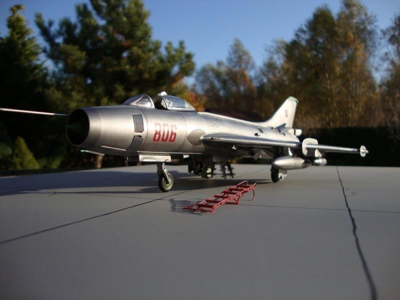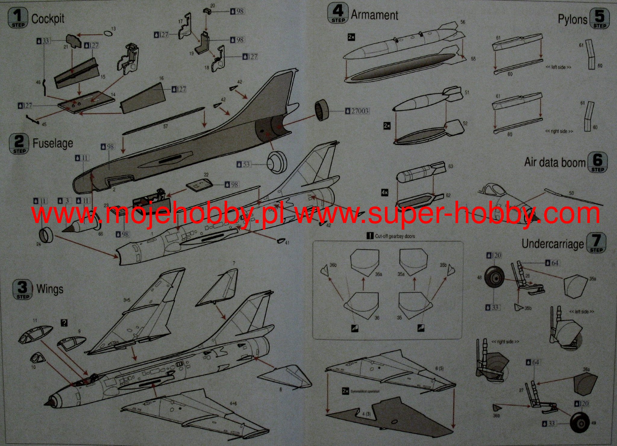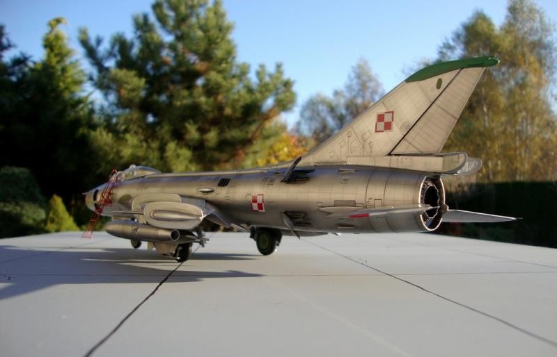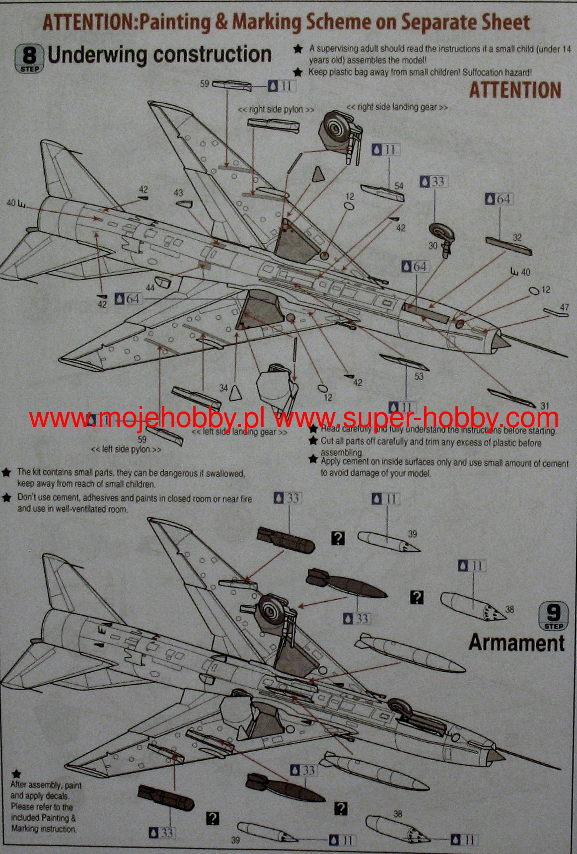 Note: Comany Mistercraft frequently changes, without any notice, the decals that come with the model, so they may differ from the photos and descriptions on our website. If you need a specific version, please let us know about that by entering the appropriate notice in the comments field when placing the order. The Sukhoi Su-7 is a Soviet fighter-bomber with oblique wings, full metal structure with a classic tail. The drive was provided by a single Lulka AL-7F1 engine. The flight of the prototype took place on September 8, 1955. It entered the line in 1958. The first production version was the machine designated as Su-7, acting as a fighter plane. However, a very interesting tactical variant of the Su-7B quickly appeared. At the end of the years. 50, the Soviet command promoted the concept of "atomization" and "rocketization" of the battlefield. The main role of carrying atomic charges on the tactical battlefield was to be played by ground-to-ground missiles and barrel artillery, but for the elimination of particularly mobile cells (columns of troops) or requiring a precise strike (nuclear weapons of the enemy, secured command and communication stations), it was intended to be used as carrier of a high-speed supersonic plane. Due to the high speed, large payload, "strong" engine and the appropriate range, and equally importantly, the need to quickly put the machine into service (before the Su-7B, provisionally modified Mig-15 / -17 was used for this role), the choice fell on the Sukhoi design. In the mid-1960s, the plane was recommended for serial production of the Suchoja Su-7B, the first units left the production line in the second half of this year. Later, new versions were created, such as the Su-7BM, with additional rocket launch engines, the Su-7UB, i.e. a training version with a two-person cabin, or the Su-7BK or Su-7BKL versions. Technical data: length: 16.8m, wingspan: 8.77m, height: 4.8m, maximum speed: 1.6Ma, climb speed: 152m / s, practical ceiling: 15500m, maximum range: 1450km, armament: permanent- 2 NR-30 30mm cannons, suspended - up to 4000 kg of cargo on 4-6 under-wing pylons.