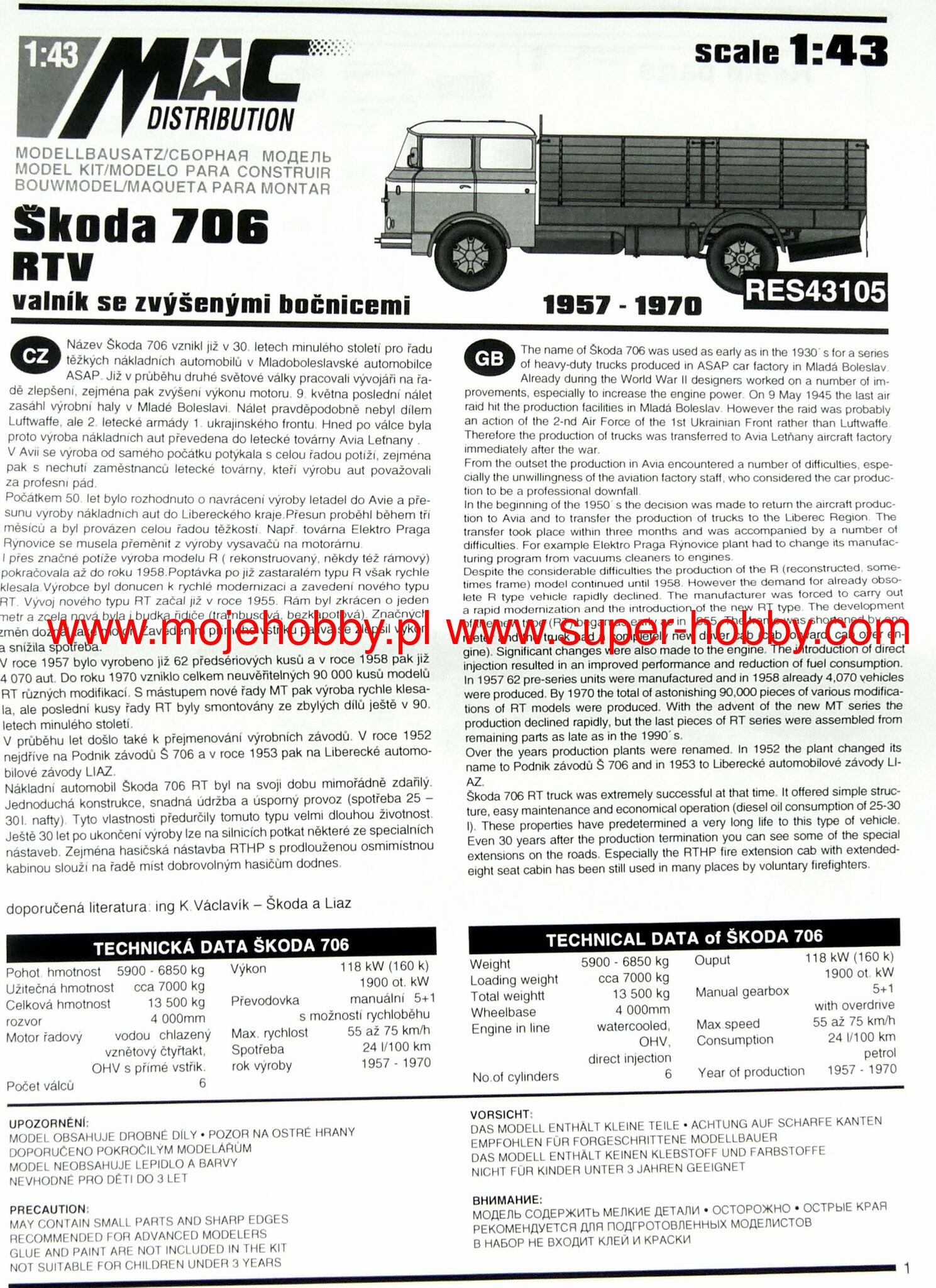 Skoda 706 is the common name of a series of trucks and buses produced by this Czechoslovak, and later Czech, company just before the outbreak of World War II during its course and after its end. The family consisted of several vehicles. Chronologically, the first of them was the Skoda 706 N / ND truck, presented in 1939 and produced - for the needs of the German army - until 1943. The vehicle was very solidly built, it was powered by a 110hp engine, but its performance was rather poor. In 1946 an improved version of the Skoda 706 R entered production, which had many of the features of the 706 N / ND model, but was powered by an engine with a power of 145 HP, which, however, only slightly improved the performance. The Skoda 706 RT and MT trucks were later developed on the basis of this model. On the basis of the Skoda 706 R car, the Skoda 706 RO city and tourist bus was also created, which was the first Czechoslovakian bus produced after 1945! Based on this version, the Skoda 706 RTO bus was created relatively quickly.