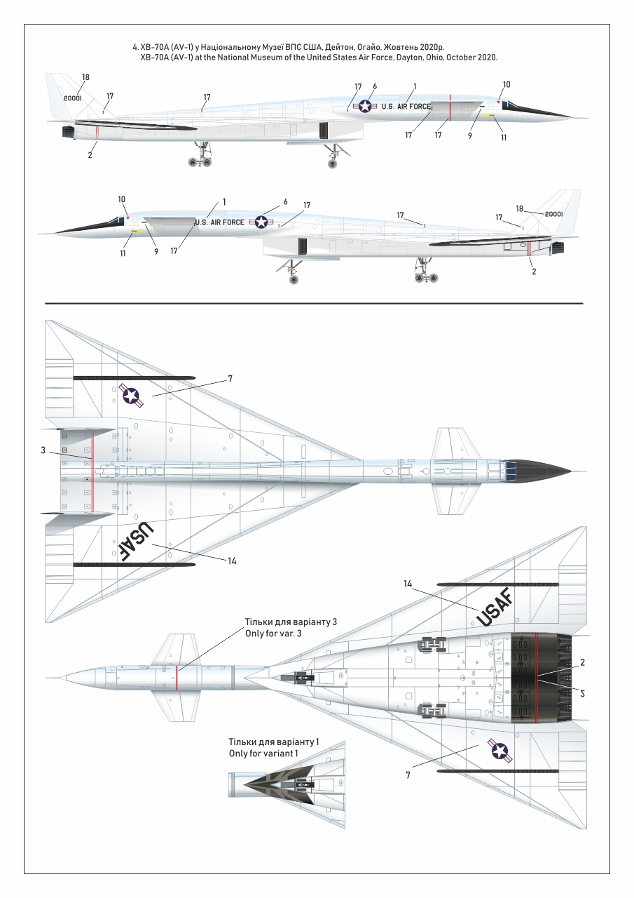 The North American XB-70 Valkyrie (Valkyrie) is an American, six-engine, all-metal duck-shaped experimental aircraft. Only two prototypes of this unusual machine were built. The first one took off in September 1964, and the second one in July 1965. The XB-70 was created to test the possibility of creating a stratospheric bomber capable of flying at a speed of 3Ma. It was planned to start serial construction under the designation B-70, but in the end the project never got past the prototype stage. This was due, firstly, to the development of nuclear-warhead ballistic missiles and, secondly, to the massive development of the Soviet anti-aircraft defense system. Specifications: length: 57.6m, wingspan: 32m, height: 9.1m, maximum speed: 3.1Ma, practical ceiling: 23500m, maximum range: 6900km.