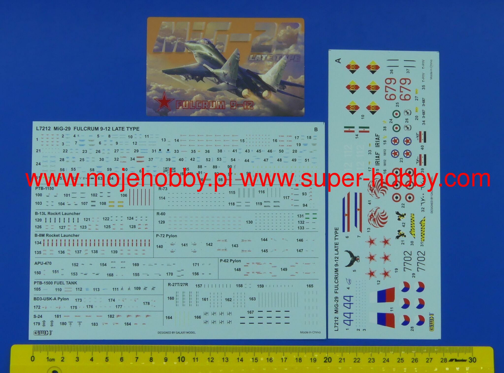 Mikojan-Guriewicz MiG-29 (NATO: Fulcrum) is a Soviet, twin-engine, 4th generation heavy front-line fighter with trapezoidal, strip wings. The mere number of over 1000 MiG 29s produced between 1977 and 1992 proves the potential capabilities of this aircraft. In fact, it must be included in the group of 3 or 4 most important, currently in active service, 4th generation fighters in the world. The MiG-29 was designed in the 1970s as a construction that could match or even exceed the combat capabilities of fighters from the then hostile western camp. And it must be admitted that it is in no way inferior to, for example, the F-16, and with many elements, such as a powerful, twin-engine drive, it surpasses the American competitor. As the MiG-29 was designed to be serviced as quickly as possible, even in the field and by mechanics with minimal experience, any repairs can actually be carried out at lightning speed. It's hard to imagine, but 5 mechanics are able to replace and test an engine in less than an hour! The extraordinary abilities of the Fulcrum do not end there. In case of problems with the drive, even when fully loaded, it can start using one engine, and then fire the other in the air. The permanent armament of the MIG 29 is the 30mm GSh-301 cannon, known for its precision. The external nodes can carry AA-10, AA-11 or AA-8 air-to-air missiles, and UB-32-57 or the unguided but larger S-8K missiles to counter ground targets. not only of the former Eastern Bloc countries, but also many other users who appreciated its great potential. Several versions of this successful fighter were created. The most important of them are, among others the first mass-produced, i.e. the MiG-29 (Fulcrum-A) with the S-29 Topaz radar and the OEPrNk-29 optoelectronic system. Another development version is the MiG-29M (Fulcrum-E) with the S-29M Żuk radar with a greater range and a better guidance and aiming system. More powerful RD-33K engines were also used instead of the RD-33. A fly-by-wire system was also used. Technical data: length: 17.37 m, wingspan: 11.4 m, height: 4.73 m, maximum speed: 2400 km / h, speed of climb: 330 m / s, maximum range: 2100 km, maximum ceiling 18000 m, armament: fixed-1 30mm GSh-301 cannon, suspended (M version) - up to 5000 kg of cargo.