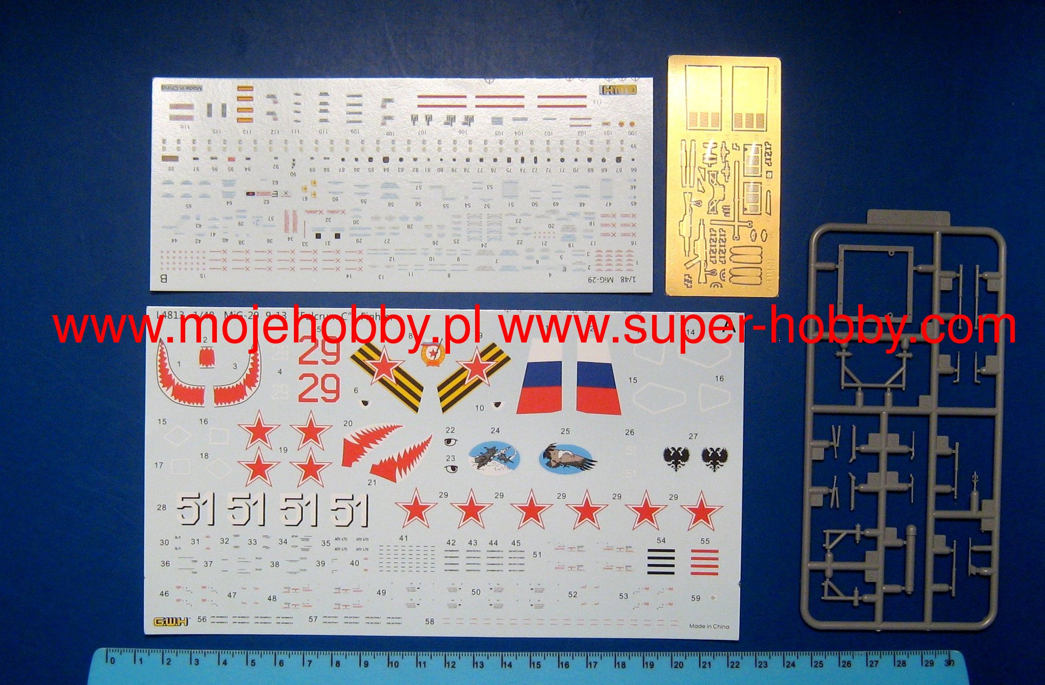 Mikojan-Guriewicz MiG-29 (NATO: Fulcrum) is a Soviet, twin-engine, 4th generation heavy front-line fighter with trapezoidal, strip wings. The mere number of over 1000 MiG 29s produced between 1977 and 1992 proves the potential capabilities of this aircraft. In fact, it must be included in the group of 3 or 4 most important, currently in active service, 4th generation fighters in the world. The MiG-29 was designed in the 1970s as a construction that could match or even exceed the combat capabilities of fighters from the then hostile western camp. And it must be admitted that it is in no way inferior to, for example, the F-16, and with many elements, such as a powerful, twin-engine drive, it surpasses the American competitor. As the MiG-29 was designed to be serviced as quickly as possible, even in the field and by mechanics with minimal experience, any repairs can actually be carried out at lightning speed. It's hard to imagine, but 5 mechanics are able to replace and test an engine in less than an hour! The extraordinary abilities of the Fulcrum do not end there. In case of problems with the drive, even when fully loaded, it can start using one engine, and then fire the other in the air. The permanent armament of the MIG 29 is the 30mm GSh-301 cannon, known for its precision. The external nodes can carry AA-10, AA-11 or AA-8 air-to-air missiles, and UB-32-57 or the unguided but larger S-8K missiles to counter ground targets. not only of the former Eastern Bloc countries, but also many other users who appreciated its great potential. Several versions of this successful fighter were created. The most important of them are, among others the first mass-produced, i.e. the MiG-29 (Fulcrum-A) with the S-29 Topaz radar and the OEPrNk-29 optoelectronic system. Another development version is the MiG-29M (Fulcrum-E) with the S-29M Żuk radar with a greater range and a better guidance and aiming system. More powerful RD-33K engines were also used instead of the RD-33. A fly-by-wire system was also used. Technical data: length: 17.37 m, wingspan: 11.4 m, height: 4.73 m, maximum speed: 2400 km / h, speed of climb: 330 m / s, maximum range: 2100 km, maximum ceiling 18000 m, armament: fixed-1 30mm GSh-301 cannon, suspended (M version) - up to 5000 kg of cargo.