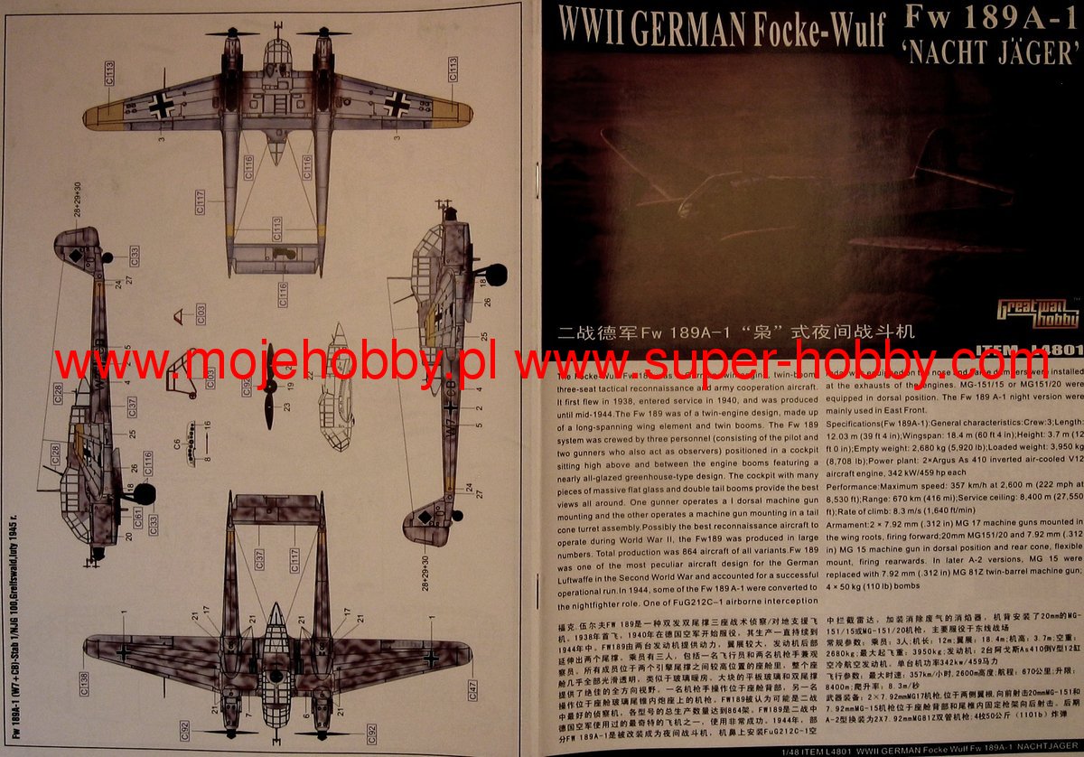 The Focke Wulf Fw-189 is a German, twin-engine, reconnaissance and military cooperation aircraft with an all-metal double-bar structure from the Second World War. The flight of the prototype took place in July 1938, and serial production began in 1940. The Fw-189 was to replace the Henschel He-126 as the main reconnaissance aircraft of the Luftwaffe. The construction of the Focke Wulf turned out to be extremely successful. Thanks to the glass cabin, it had excellent visibility in all directions, and the low minimum speed allowed for precise observation of the battlefield. The plane also turned out to be very durable and easy to use. It was also able to fly on only one engine, normally the machine was powered by two Argus As 410 A-1 with 465KM each. During the war, until 1944, several versions of the aircraft were created. Marked with the letter "A", in several versions, served only as reconnaissance. The Fw-189B, on the other hand, served as a training machine, but it was built in a minimal amount. A version of the Fw-189A-1 / R was also developed, intended to act as a night fighter equipped with the FuG-212 Lichtenstein C1 radar and a single 20mm cannon firing obliquely upwards. In total, 831 aircraft of all versions were built. The Fw-189 was used primarily on the Eastern Front. Technical data (version Fw-189A): length: 12m, wingspan: 18.4m, height: 3.7m, maximum speed: 357km / h, climb speed: 8.3m / s, operating range: 670km, maximum ceiling 8400m armament: fixed-4 machine guns cal.7.92mm, suspended-up to 200 kg of bombs.