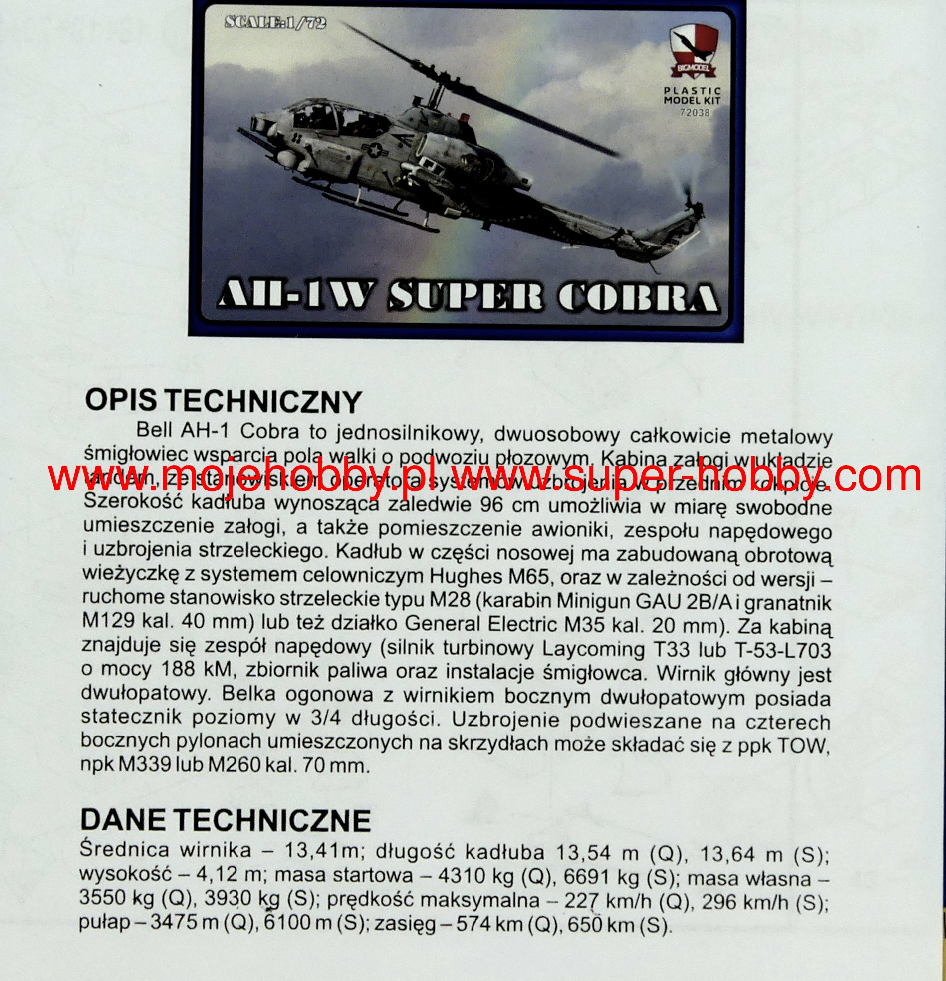 The AH-1 Cobra helicopter (Bell 209) is an attack helicopter in the classic layout, using many components of its "big brother" UH-1 Huey. The first flight of the AH-1 prototype took place on September 7, 1965 and the helicopter entered mass production in the same year. During the Vietnam War, 1,126 machines of the G model were produced, of which 279 were lost in combat. Due to the very high reliability of the structure, small side profile and good performance, the helicopter remains in service to this day in the US Marine Corps. The AH-1 allowed the US Army to fully implement the theoretical assumption of airmobile infantry ("air cavalry") through the fire support of landing infantry units. Today, the AH-1 Cobra is primarily used against an armored celon. From 1965, several versions of this successful helicopter were created, including: AH-1G (basic version), AH-1J (two-engine version), AH-1Q (version armed with TOW missiles). Technical data: Top speed: 333 km / h; maximum range (depending on version): 507-574km, armament: fixed-1 20mm M197 three-barrel cannon, slung rockets, guided missiles, unguided missiles and cannon pods.