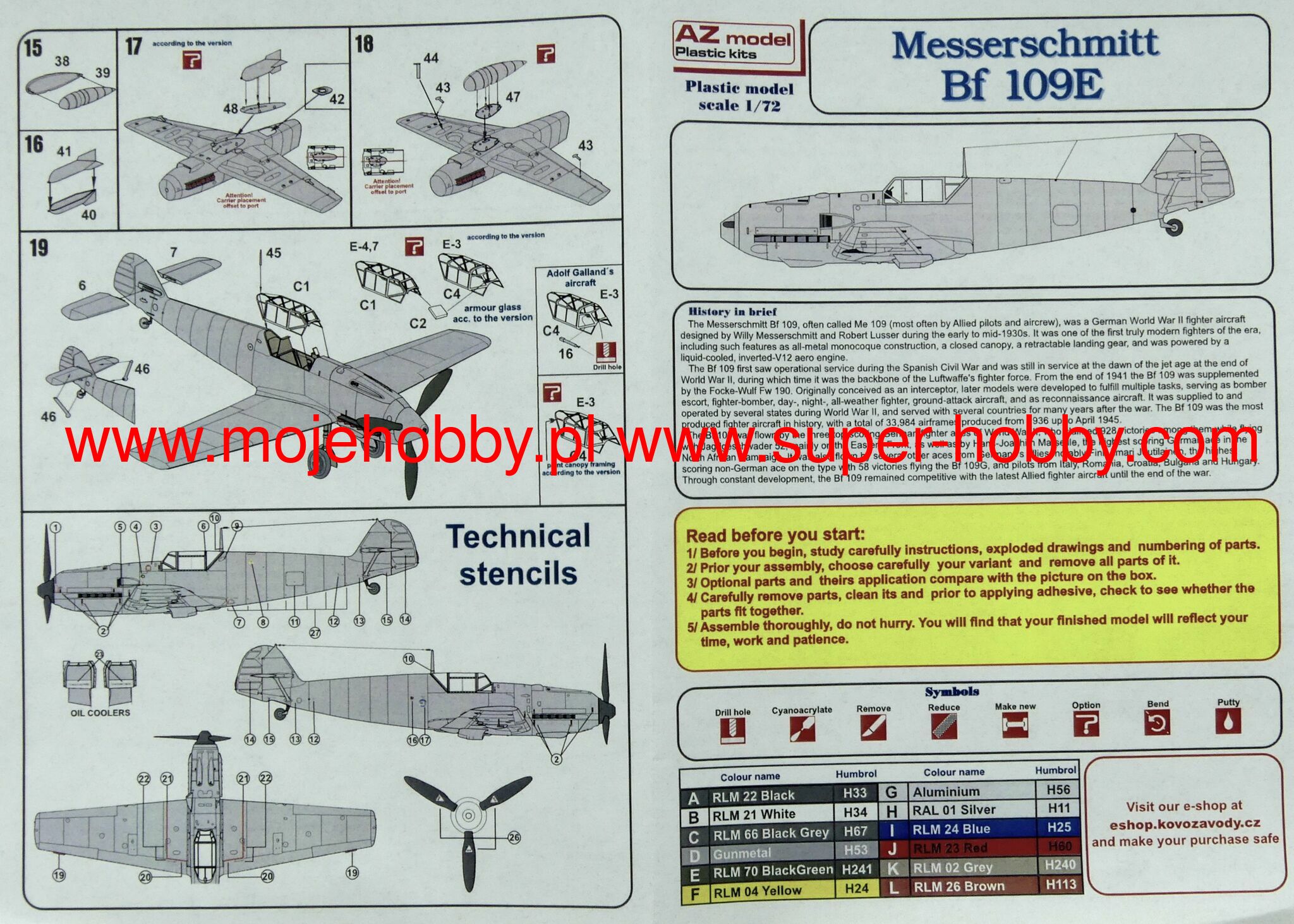 The Messerschmitt Bf-109 is a German metal-structure single-engine fighter in a low wing configuration with a classic tail. It turned out to be the basic and most produced Luftwaffe fighter during World War II. The flight of the prototype took place on May 29, 1935, and serial production continued in the years 1936-1945. In total, it is estimated that a total of about 35,000 Messerschmitt Bf-109 fighters of all varieties were produced, many of which ended up in the Czech and Israeli air forces after the war. The roots of the Bf-109 go back to the competition announced in 1933 by the Luftwaffe for a new fighter plane. In competition with the He-112, the Bf-109 project initially lost, but thanks to Willie Messerschmitt's intrigues, the project could continue and eventually he was the winner of the competition, becoming the Luftwaffe's primary fighter. Several main variants of the Bf-109 were developed in the course of production. The first pre-production series was the Bf-109B (Berta) with different versions of the Junkers Jumo 210 (A or Da) engine. They were tested in Spain from 1937 during the Civil War. The next version is the Bf-109C (Caesar). They had a different engine than the B version, and extensive armament consisting of two 20mm and 2 HP 7.92mm cannons. These machines also fought in the skies of Spain. The third version is the Bf-109D (Dora) with the Junkers Jumo 210 Da or Daimler-Benz DB 600 engine. It fought in the September campaign, but at the turn of 1939/1940 it was replaced by the E version. The most famous model was the Bf-109E (Emil) with a Daimler-Benz 601A or N engine. It was the first to use a three-blade, not a two-blade propeller. Bf-109E fought in the French campaign, over England, and in North Africa and on the Eastern Front. The ace who started his career on the Bf-109E was the famous Adolf Galland. The next version is the Bf-109F (Friedrich), which, according to the German pilots, was the most aerodynamically perfect. It sowed the changed shape of the fuselage, wings, cabin fairings, but no new engine was used. It was put into service at the turn of 1940/1941. As part of the development of the design, further Bf-109 specifications were developed, of which the G (Gustav) version was produced in the largest number of copies. The most important change increasing the machine's performance was the installation of a new 12-cylinder Daimler-Benz DB605A engine with 1475HP. The armament of the Bf-109G was a pair of 13mm machine guns located in the fuselage in front of the cockpit fairing, and the MG151 20mm or heavier MK108 30mm cannon. The last mass-produced version was the Bf-109K (Kurfirst), which production started in October 1944. A Daimler-Benz DB 605DB or DC unit was used as the engine. The Bf-109K was the fastest version produced during World War II, reaching up to 730 km / h. Apart from that, two versions were created - H and Z, but they were rather experimental versions and their mass production did not start. Subsequent improvements in propulsion and armament made the Messerschmitt Bf-109 one of the most dangerous fighters of World War II, and at the same time showed the great potential of the slightly angular airframe created by Willi Messerschmitt. Technical data (version Bf-109 G-6): length: 8.95 m, wingspan: 9.92 m, height: 2.6 m, maximum speed: 640 km / h, rate of climb: 17 m / s, maximum range: 850 km, maximum ceiling 12000m, armament: fixed - 2 MG131 13mm machine guns and 1 MG151 20mm cannon, suspended - 250 kg bombs, or 2 Wfr missile launchers. Gr. 21.