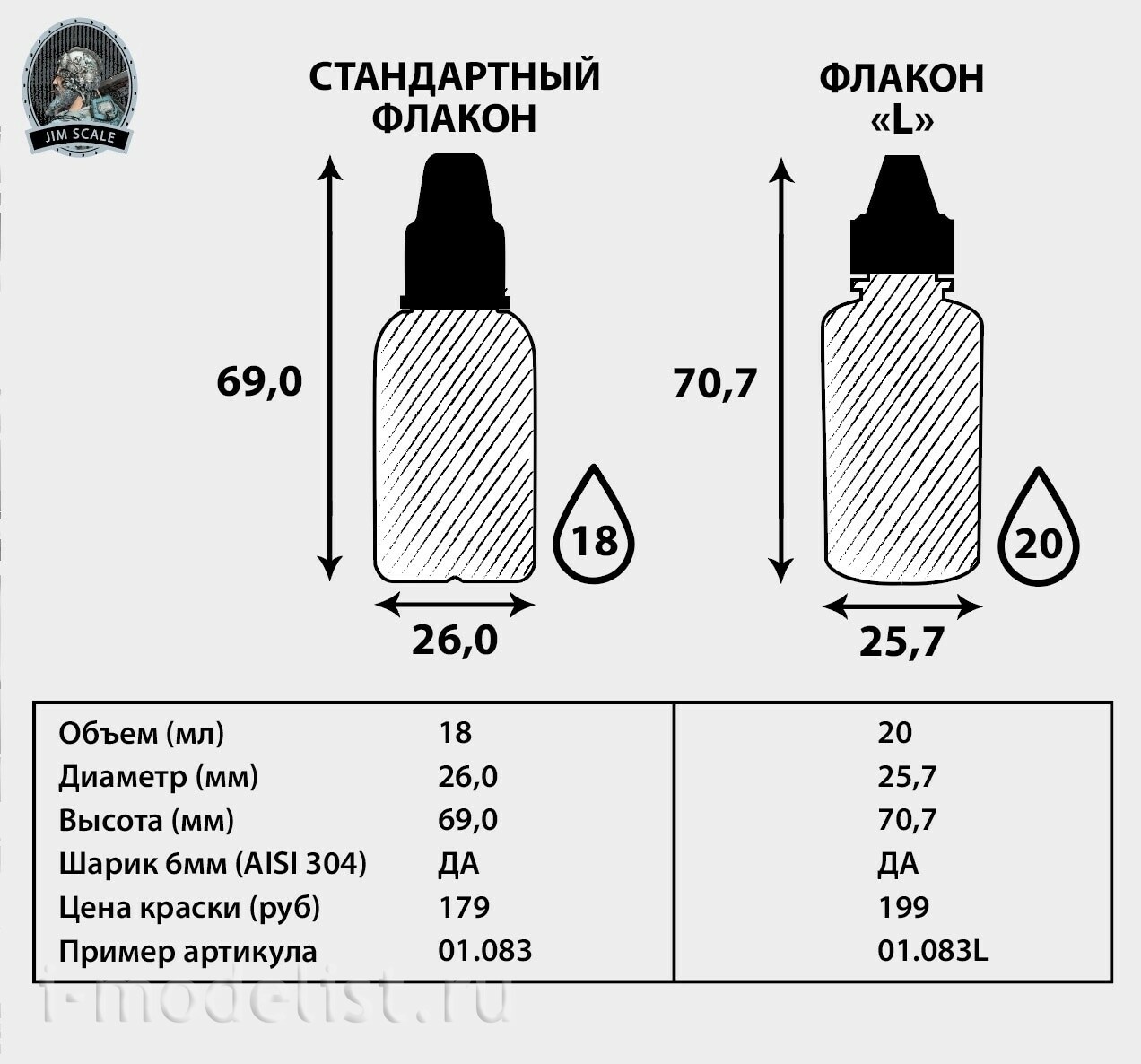 Дополнительная информация Акриловые краски для моделистов бренда Jim Scale изготовлены с использованием пигментных паст, предназначенных для художественной продукции, обладающих чистотой цвета и высокой светостойкостью. Краски не имеют запаха и безопасны для аллергиков. Адгезия: цвет плотный с высокой степенью покрытия и адгезии к модели. Краски хорошо наносятся даже на незагрунтованную поверхность. Окрашенная поверхность имеет полу-матовый цвет и гладкую, целостную структуру. Аэрограф/кисть: краски могут быть нанесены как аэрографом без дополнительного разбавления, так и непосредственно кистью. Разбавлять краску можно фирменным разбавителем (Арт.01.010) либо любым разбавителем для водных акрилов. Перемешивание: в процессе хранения возможно разделение на фракции, что характерно для жидких акрилов и не ухудшает качество краски. В каждый флакон кладется шарик диаметром 6мм из нержавеющей стали AISI 304. Перед использованием рекомендуется взболтать содержимое флакона до однородного состояния в течение минуты. Заморозка: краски хорошо переносят минусовые температуры (до -30). Взаимодействие со смывками: нанесение смывок на основе уайт-спирита, фильтров, лаков и другой химии рекомендуется через 24 часа после покраски. Через сутки краска полностью высыхает при этом слой краски остается относительно эластичным и способен выдерживать даже небольшую усадку лаков. Промывка: промывать аэрограф рекомендуется сразу после покраски простой водой (не обязательно дистиллированной).