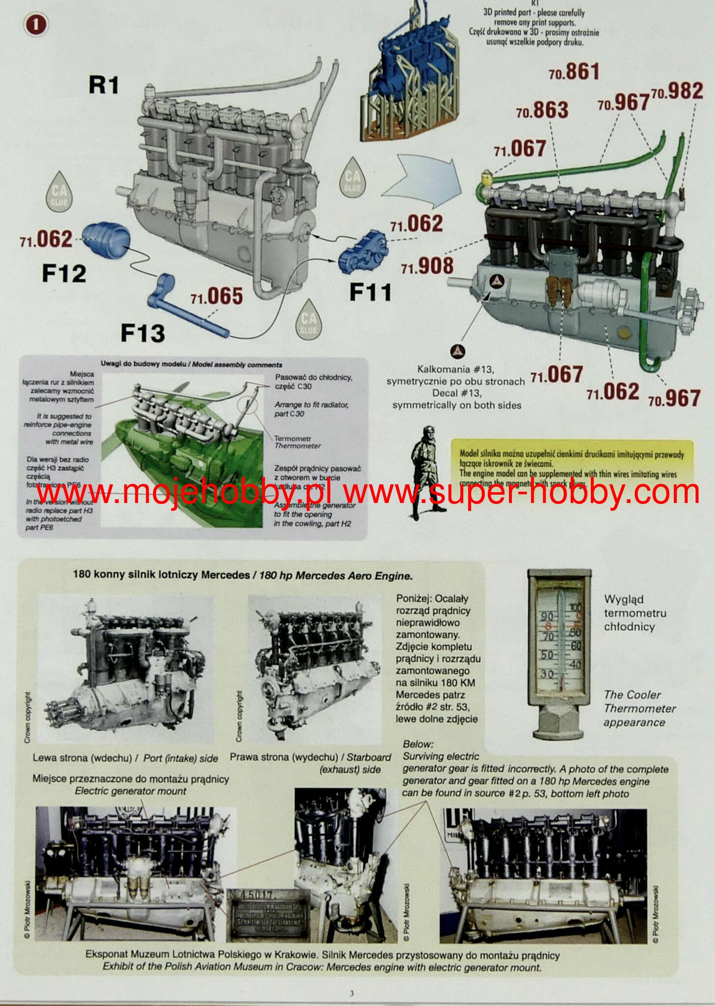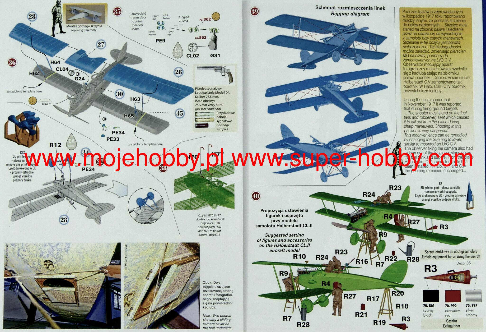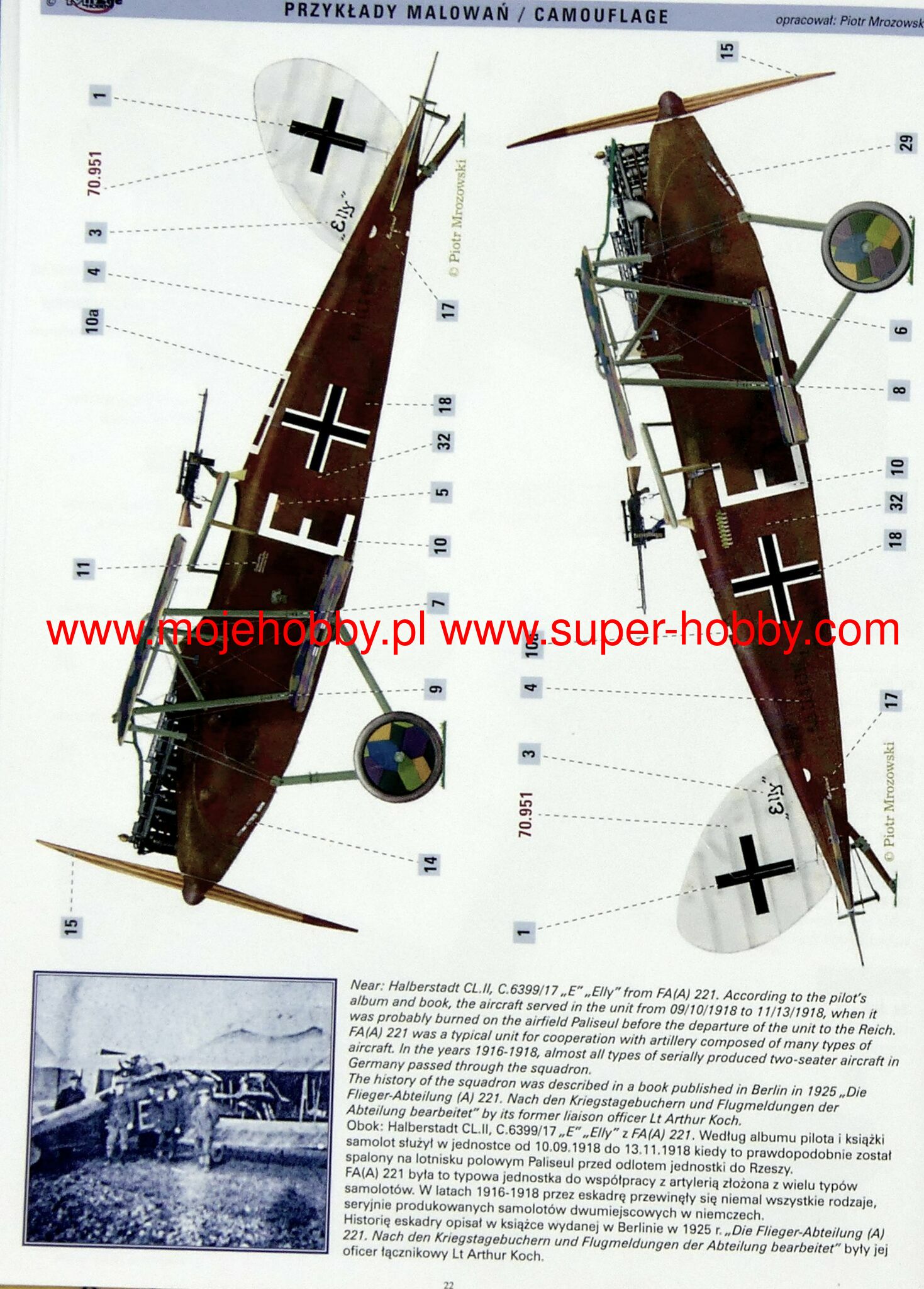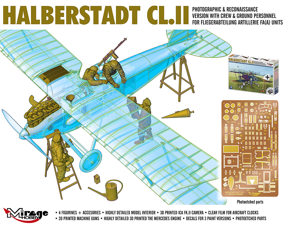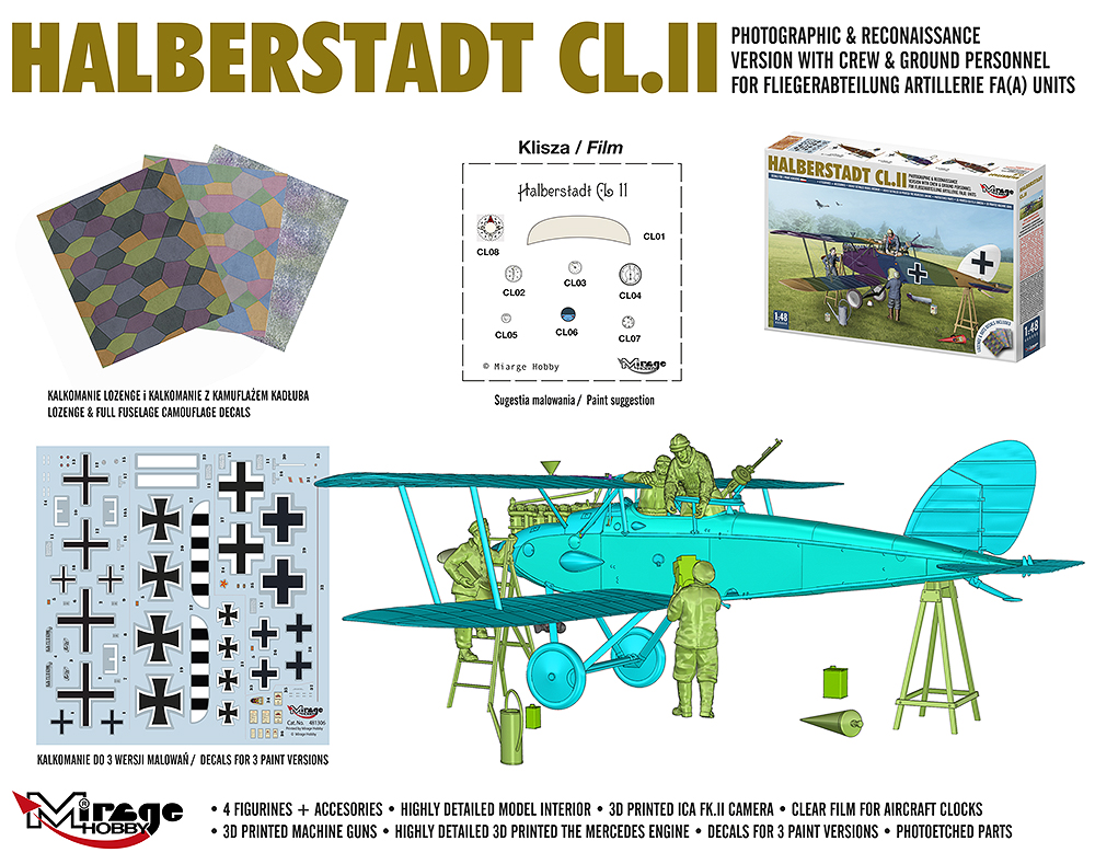 Download Mirage Hobby PDF catalogueThe German air force was organized in 1913 under the name of die Fliegertruppen des deutschen Kaiserreiches, to change its name to in 1916 Luftstreitkräfte. At the time of the outbreak of World War I, they played a decisively subordinate role to the ground forces and were, moreover, quite strictly subordinated to them. It is worth adding that each German infantry division included a reconnaissance company of 6 aircraft in August 1914. However, very quickly the German air force began to expand and play an increasingly important role over the battlefield. In 1918, they had a total of about 2,700 aircraft and about 240 other aircraft. This significant quantitative development was possible, among others, thanks to a strong industrial base and a well-developed aviation industry with such factories as: Albatros Flugzeugwerke, Fokker, Pfalz Flugzeugwerke or Siemens-Schukert. The German air force also introduced many successful aircraft in the years 1914-1918, including the great Fokker Dr.I or Gotha G.IV or GV fighter, but also such unusual designs as the Zeppelin-Staaken R.VI. The German air force was also able to undergo organizational changes during the Great War, as evidenced by the establishment of specialized fighter units (German: Jagdstaffeln) in 1916. Manfred von Richthofen, known as the red baron, was undoubtedly one of the greatest Luftstreitkräfte aces, but it is also worth remembering about such pilots as: Max Immelmann, Wilhelm Frank, Oswald Boelcke, Ernst Udet or later Luftwaffe commander Herman Göring.The Halberstadt CL.II is a German biplane, two-seater reconnaissance and fighter aircraft of a mixed, half-shell structure from the First World War. The drive was a Mercedes D.III engine with a power of up to 160 HP. The plane was designed by engineer Karol Theiss in 1916, and at the beginning of the next year a prototype flight took place. Halberstadt CL.II entered line service in August 1917. It turned out to be a very successful design, it was characterized by great maneuverability, good rate of climb and a wide field of fire. On the battlefield, the plane served in the Schlachtstaffelen units, which were responsible for direct support of the land forces. He performed very well in this role, an excellent example of which is his role in the German counteroffensive during the Battle of Cambrai (November 30, 1917). In total, 900 Halberstadt CL.II aircraft were built during the war. Technical data: length: 7.3 m, wingspan: 10.77 m, height: 2.75 m, maximum speed: 165 km / h, climb speed: 3.3 m / s, maximum ceiling 5090 m, armament: fixed-2 machine guns 7 , 92mm, suspended - up to 50 kg of bombs.