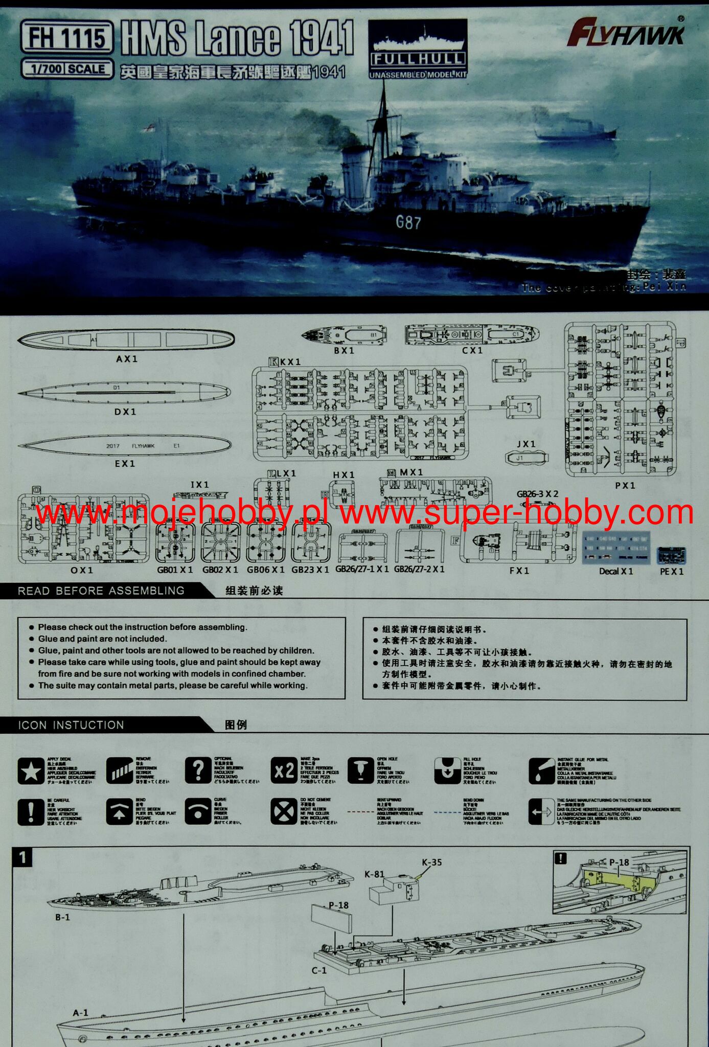 HMS Lance (G87) was a British WWII destroyer. The keel for this unit was laid in 1939, and the launch took place in November 1940. The total length of the ship at the time of launching was 110.5 meters and a width of 11.2 meters. The displacement reached approx. 1,900 tons, and the maximum speed was approx. 36 knots. The armament at the time of the launch consisted of eight 102 mm guns in four twin turrets, one 40 mm gun and eight 533 mm torpedo tubes. HMS Lance was one of the eight L-class destroyers (often referred to as the L / M-class). However, along with two other destroyers, it was a peculiar subtype within that class. HMS Lance was relatively heavily armed with anti-aircraft artillery, and at the same time had relatively strong artillery armament. It had - in relation to other L-class destroyers - a changed shape of the fore superstructure and a part of the aft superstructure. HMS Lance had a short but turbulent combat trail. In May 1941, the ship participated in the tracking down and sinking of the battleship Bismarck. Later, he covered convoys on the route Great Britain - Gibraltar, and in October 1941 he was transferred to Malta and joined the so-called Force K, where he successfully takes part in numerous actions against the Italian Regia Marina. In January 1942, he sheltered one of the British convoys sailing in the Mediterranean Sea. The unit was seriously damaged as a result of Italian air raids on Malta in April 1942. The unit was later towed to Great Britain, but after learning about the damage on the ship, it was decided to dismantle it and from 1944 the ship was gradually scrapped.