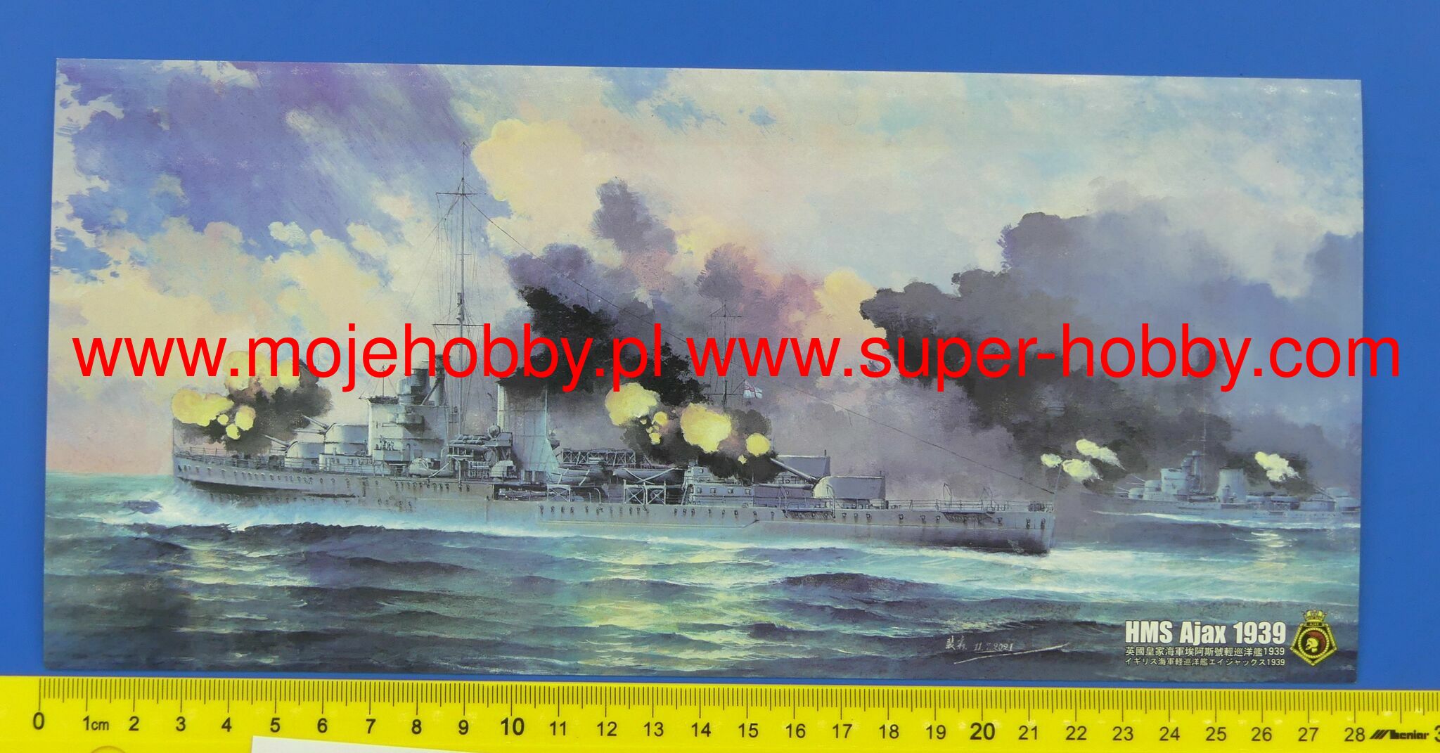 HMS Ajax (22) was a British light cruiser of the Second World War. The keel was laid in 1933, the launch took place in March 1934, and the entry into service with the Royal Navy - in 1935. The total length of the ship at the time of launching was 169 meters, total width 17 meters, and full displacement - approx. 9,750 tons. The maximum speed was around 32-33 knots. The on-board armament at the time of the launch included, among others: 8 152 mm guns, 4 102 mm guns and 8 533 mm torpedo tubes. The unit could operate a single seaplane or a Supermarine Walrus flying boat. HMS Ajax (22) was one of the British light cruisers of the Leander-class. These types of units were built on the basis of the experience gained from the operation of York-class cruisers, and their main task was to protect the convoys against attacks by enemy surface ships. One of the ships of this class, HMS Ajax, was built at the Vickers Armstrong shipyard in Barrow in-Furness, Great Britain. The cruiser took a very active part in World War II, participating in such struggles as the battle at the mouth of La Plata (1939) or near Cape Matapan (1941). The unit also participated in the withdrawal of the Allied troops from Crete in 1941 and protected convoys heading to Malta and besieged Tobruk. HMS Ajax (22) also took part in the Allied landing in Normandy in June 1944. In 1948, HMS Ajax was decommissioned and shortly afterwards sold for scrap.